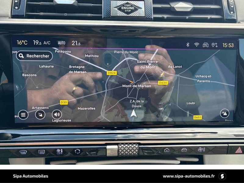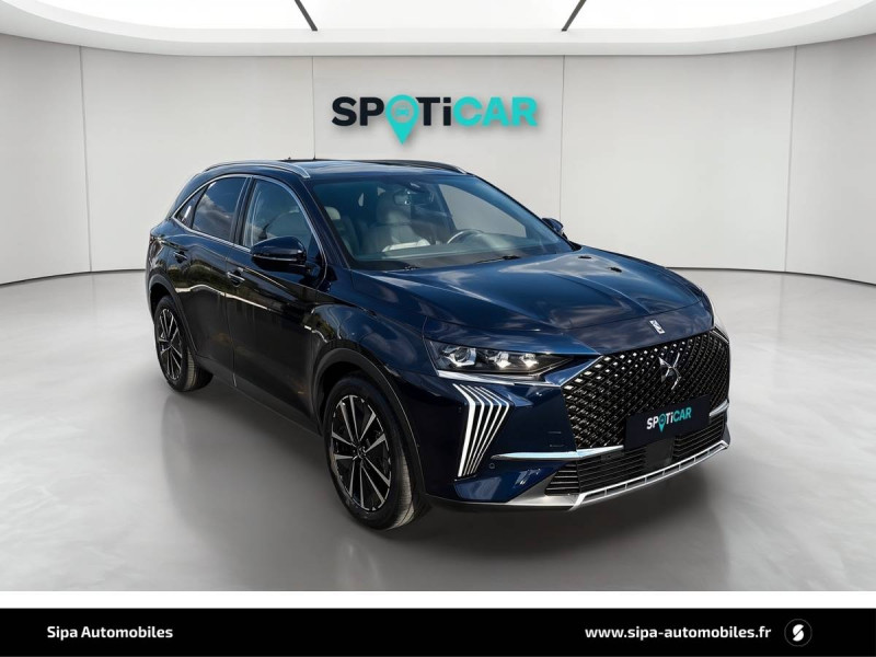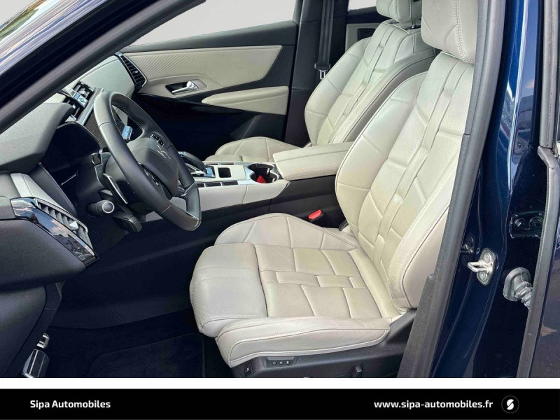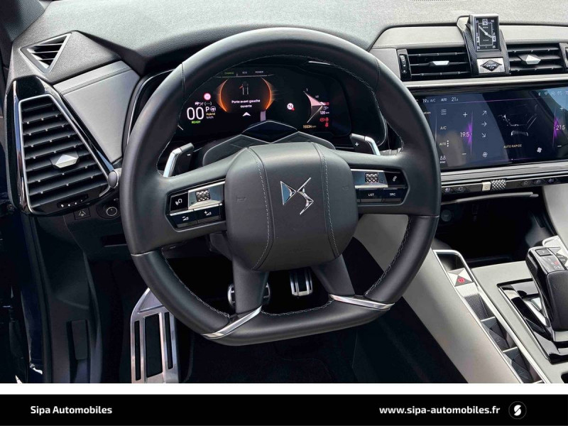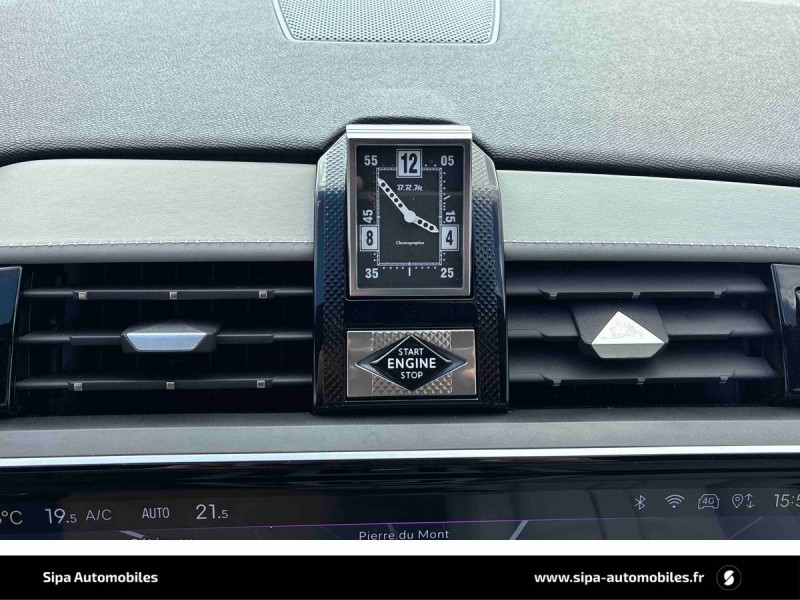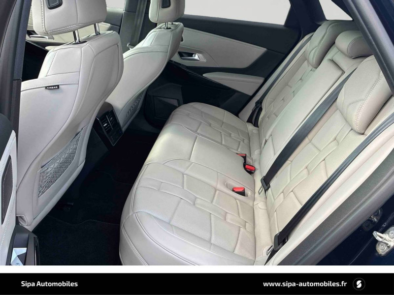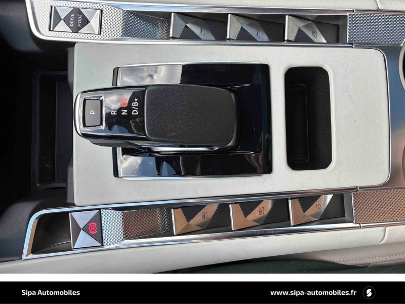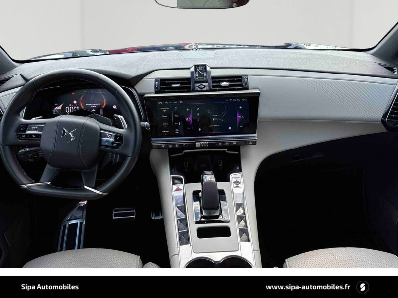 ABS avec répartiteur électronique de freinage (REF) et Aide au Freinage d'Urgence (AFU) + Aide au démarrage en pente / Accès et démarrage mains libres / Accoudoir central en Toile DS avec rangement / Aide au stationnement AV/AR et Caméra de recul / Airbags frontaux (passager déconnectable), latéraux AV, rideaux AV/AR / Alerte Attention Conducteur / Allumage automatique des feux Avec commutation automatique des feux de route / Badge DS chromé sur le capot / Banquette AR électrique / Câble de recharge mode 2 standard 1,8 kW (8 A) / Centre de roue Noir brillant / Chargeur embarqué monophasé de 3,7 kW / Chargeur sans fil pour smartphone + 2 prises USB type C / Climatisation automatique bizone étendue avec tableau de commandes aux places AR et filtre anti-allergènes / Combiné numérique 12.3" HD / Contrôle dynamique de stabilité (ESP) avec antipatinage des roues (ASR) / Détection de sous-gonflage / Double antennes / Double canule d'échappement chromée / DS Active Scan Suspension / DS Drive Assist / DS IRIS SYSTEM Système d'infotainment personnalisable de dernière génération / DS PIXEL LED VISION 3.0 / DS Wings chromées / Eclairage d'accueil et d'accompagnement / Eclairage de cave à pieds à LED / Eclairage PolyAmbient / Ecran tactile capacitif 12,3'' HD / Entourage des vitres latérales chromé / Essuie-vitre AV à déclenchement et cadencement automatiques + Buses de lavage / Feux AR 3D (traitement écailles) Avec indicateur de changement de direction défilant / Fixations ISOFIX à la place passager AV et aux places latérales AR Inclut TOP TEATHER / Freinage d'urgence automatique piloté par caméra et radar / Frein de stationnement électrique automatique / Grille de calandre noir brillant avec pampilles chromées / Hayon motorisé avec accès bras chargés / Jantes alliage 19'' EDINBURGH, pneus 235/50 R19 V / Jonc supérieur de volet Noir brillant avec lettrage 'DS AUTOMOBILES' chromé / Jonc sur jupe AR chromé / Kit de dépannage / Lève-vitres AV/AR électriques, séquentiels et avec fonction antipincement / Mirror Screen sans fil via Wifi Compatible Apple CarPlay et Android Auto / Monogrammes AR chromé / Montre rotative B.R.M. R180 / Navigation 3D Connectée Information trafic en temps réel, prix des carburants,parkings et Zones de Danger.3 ans inclus / Pare-brise chauffant / Pare-brise teinté acoustique / Pédalier et le repose-pied aluminium / Poignées extérieures couleur caisse avec insert chromé / Préconditionnement thermique de l'habitacle programmable par smartphone Via MyDS App / Prédisposition Plancher modulable à 2 positions / Prises 12 V 1 prise dans le rangement AV de la console centrale et 1 prise dans le coffre / Prises USB 2 prises USB type C dans le rangement de la console centrale et 2 prises USB type A pour les passagers AR / Rétroviseur intérieur électrochrome sans cadre / Rétroviseurs extérieurs avec embase couleur caisse et coque noir brillant / Rétroviseurs extérieurs électriques dégivrants, rabattables électriquement Fonction électrochrome côté conducteur, Projection au sol du logo DS, Indexéà la marche AR côté passager / Sabot AV chromé / Seuil de coffre chromé / Seuils de portes Trame DS / Sièges AV chauffants, massants et ventilés / Sièges AV électriques Réglage électrique du siège, réglage lombaire pneumatique, réglage mécanique du nez de coussin / SOS & Assistance Service inclus pendant 10 ans / Surtapis AV/AR / Surveillance d'angles morts / Toit ouvrant panoramique électrique Entrebaillant, Ouvrant, Occulteur motorisé / Vérins d'ouverture et de maintien du capot moteur / Vitres latérales feuilletées acoustiques