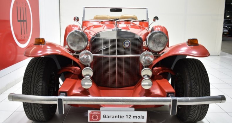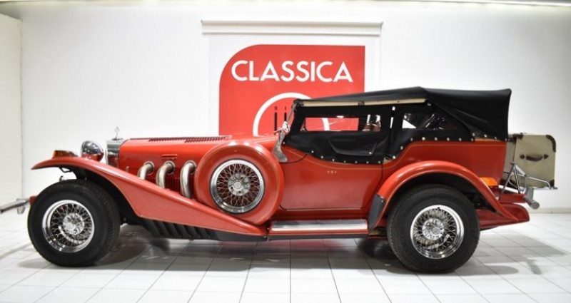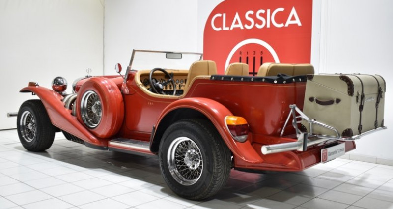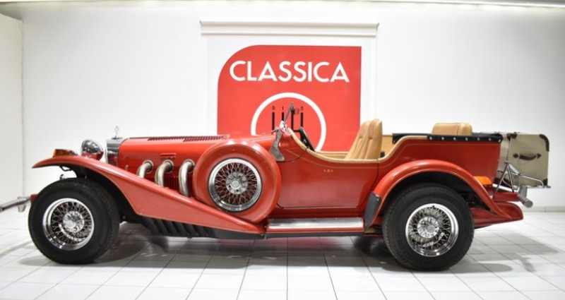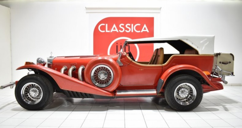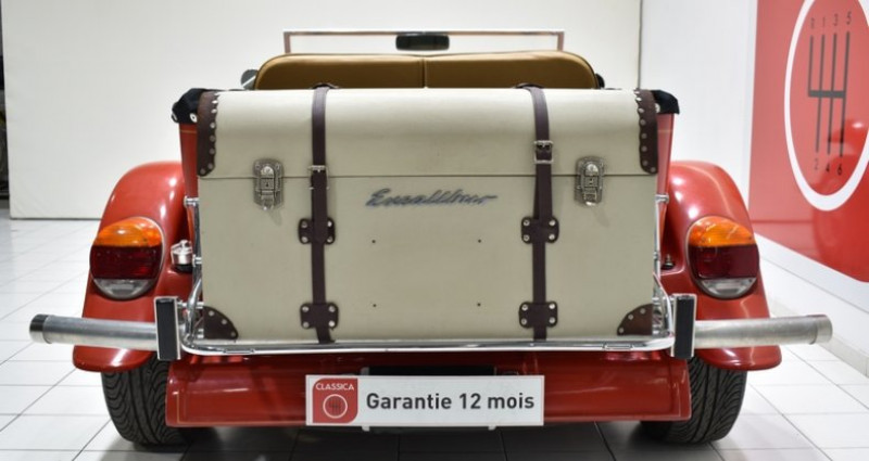 CONDUITE : à gauche CARTE GRISE : Collection NB PLACES : 4 NB CYL. : 8 en V PNEUMATIQUES : Usure Av 40% + Ar 40% * GARANTIE 12 MOIS incluse * REPRISES et LIVRAISON possibles * Frais de mise à la route en sus : 690 € TTC (1/4 de carburant, passage contrôle technique, préparation intérieure et extérieure) * Service « carte grise » et « carte grise collection » (dossier FFVE inclus) EXCALIBUR Phaeton 3 (1975 - 1979) 1.065 ex. produits dont 222 en 1977 6.242 km / 3.879 miles Carte grise française collection 4 places Version SWB (Short Wheel Base / châssis court) Moteur V8 Chevrolet 7,4L Carburateur quadruple corps Edelbrock Filtre à air chromé SUMIT Cache culbuteurs chromés Alternateur chromé Opened side pipes (échappements latéraux branchés) Mastervac (assistance au freinage) Direction assistée Capote en mohair coloris « Black » Couvre capote en mohair coloris « Black » Side screens mohair et pexiglass Housse de rangement pour side screens Hard top coloris « White » Porte bagage chromé Malle arrière d'origine 4 jantes Excalibur 97 rayons chromées 2 roues de secours latérales Sellerie en cuir coloris « Tan» Contre porte en cuir coloris « Tan » Casquette de tableau de bord en cuir coloris « Tan » Tableau de bord en cuir Instrumentation de bord VDO Compteur AUTO METER GPS GARMIN Autoradio CD PIONEER Volant EXCALIBUR d'origine à 3 branches en cuir coloris « Black » Le pommeau de vitesse en cuir SS Ceinture de sécurités type aviation avant et arrières Moquettes coloris « Black » Coupe batterie Historique du modèle : Créé en 1965 par Brook Stevens, EXCALIBUR empreinte son nom et son logo à l'épée du même nom et se spécialise dans la production de répliques néoclassiques de grand luxe. Le modèle le plus célèbre et le plus spectaculaire est la Phaeton, reprenant les lignes de la fameuse Mercedes SSK de 1928. Equipées d'énormes V8 cubant de 5 à 7.5 litres, les EXCALIBUR Phaeton seront produites jusqu'en 1989. Très rarement vendues en France, elles ne seront réceptionnées et homologuées qu'une par une. Carrosserie / Extérieur : Le modèle présenté ici est une EXCALIBUR Phaeton 3 châssis court de février 1977 dans son coloris « Red » d'époque. La peinture carrosserie présente une teinte homogène mais légèrement ternis. Après un lustrage pro réalisé à l'orbitale par notre atelier, nous avons relevé quelques petits éclats de peinture corrigés sur le capot moteur et sur l'aile arrière droite. Cet exemplaire est complet et a conservé tous ses accessoires et attributs d'origine : Pare-chocs avant et arrière chromés, klaxons, roues de secours et caches roues, porte bagage chromé, malle arrière d'origine. Les rétroviseurs chromés sont en parfait état. Les pare chocs, très exposés sont exempts de déformations mais présentent quelques traces de micro-rayures. Cet exemplaire est équipé de phares longues portées LUCAS Les ouvrants sont en bon état. Cet exemplaire est équipé de l'option side screens en mohair et plexiglas ainsi que d'un couvre capote en mohair coloris « Black ». La capote en mohair coloris « Black » est en parfait état, sans accrocs ni décoloration. Sa mise en place est perfectible et son étanchéité reste correcte. Le Mica de la lunette affiche une bonne transparence et ne présente ni fissure ni jaunissement. Les sides screens mohair et pexiglass sont en parfait état. Cet exemplaire dispose d'une option rare et recherchée : le hard top. Celui-ci est en très bon état, nous avons relevé l'absence de la lunette. Les 4 jantes fils Excalibur 97 rayons chromées d'origine présentent des traces d'oxydation. Ces dernières sont chaussées de 4 pneumatiques dont l'usure est de à 40% à l'avant ainsi qu'à l'arrière. Parmi les options et équipements carrosserie / extérieur intéressants dont cet exemplaire est doté, nous avons relevé : Le couvre capote en mohair, le hard top, les klaxons chromés, les 4 jantes Excalibur 97 rayons chromées ainsi que les 2 roues de secours protégées par leurs caches roues. Habitacle : L'intérieur a été conservé dans sa configuration d'origine. L'ensemble est en bon état sans accrocs ni distensions. La sellerie full cuir coloris « Tan » est en excellent état. Nous avons relevé une petite griffure sur le dossier du siège conducteur ainsi qu'une petite tache sur l'assise arrière. Les contre portes garnies du même cuir que la sellerie sont dans le même état. Le tableau de bord ainsi que la casquette garni de cuir coloris « Tan » est également parfait. L'instrumentation de bord VDO, le compteur tour AUTO METER ainsi que son autoradio PIONEER sont parfaitement fonctionnels. Seule la climatisation d'époque n'est plus fonctionnelle. Le volant 3 branches en cuir d'origine EXCALIBUR coloris « Black »présente une patine d'usage. Le pommeau de vitesse en cuir SS est en parfait état. Les moquettes coloris « Black » sont en très bon état. Afin de faciliter les man?uvres cet exemplaire est équipé d'une option appréciable et recherchée : la direction assistée. Parmi les équipements et options Habitacle intéressantes dont cet exemplaire est doté, nous avons noté : La sellerie cuir coloris « Tan », l'autoradio PIONEER, les ceintures de sécurité avant et arrière ainsi que la direction assistée. Châssis : La mise sur le pont confirme une caisse et un châssis en échelle sains, sans trace d'accident visible ni de corrosion structurelle apparente. Les fondamentaux, châssis en échelle boulonné, planchers, longerons, passages de roues, intérieurs et retours d'ailes, bas de caisse sont en excellent état. Réserve d'usage : par principe nous ne pouvons garantir ces éléments au-delà de leur bon état visuel et fonctionnel validé lors de l'essai sur route et de la mise sur le pont. Lors de l'essai dynamique, nous n'avons relevé aucun bruit anormal au niveau de la caisse ou des trains roulants (rotules, silentblocs...). Le f