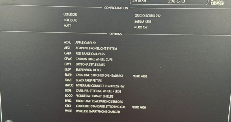 FERRARI 296 COUPE 3.0 TURBO V6 HYBRIDE 830 GTB Véhicule en excellent état Entretien et suivi Ferrari Garantie Ferrari jusqu'au 06/04/2026 Date de mise en circulation : 06/04/2023 Kilométrage : 4900kms Exterieur : Covering Bleu (Couleur Origine Grigio Scuro ) Intérieur : Sabbia Equipements et Options : Amortisseurs Magnaride (SCME-Frs) Boite de vitesse F1 à double embrayage Centre de roue carbone Commande intégrée dynamique voiture (Manettino Race) Jantes alliage 20 Freins céramique Jantes noires Housse de protection Clé voiture avec fonction Keyless Start Bouton de demarrage (Engine Start) au volant Airbag latéraux sur pavillon Système ASR Système multimedia, streaming audio Bluetooth, radio numérique (DAB) Démarrage sans clef Système de contrôle de température et de pression des pneumatiques Double Airbags frontaux (conducteur et passager) Feux de route automatiques Phares LED avec Clignotants et Feux lateraux LED Système de freinage carbo-céramique (CCM) ABS Evo / EBD performance avec recupération d'energie ESSC: eTC, eDiff, SCM, FDE2.0, EPS, ABS Evo + 6W CDS Aide au démarrage en côte Contrôle de pression des pneus Système anti-vol Apple CarPlay Capteurs de parking AV et AR Cavallino brodé sur les appui-têtes Chargeur de smartphone sans fil Ecussons Scuderia sur ailes AV Feux AV adaptatifs Sièges de style Daytona Surélévateur AV Volant en Carbone avec LEDs RS MONACO VOUS PROPOSE AUSSI : * ACHAT & REPRISE de votre ancien véhicule * Gestion des démarches administratives liées à l'immatriculation et carte grise de votre véhicule, en France et à Monaco * Véhicule garanti 3 mois * Financement de votre nouvelle acquisition possible (Validation sous 48 heures sous réserve d'acceptation du dossier) Nos Horaires : Du Lundi au Vendredi de 9h00 à 18h30 Non Stop Notre Adresse : RS MONACO, 32 bd du Jardin Exotique, 98000 Monaco Aucune responsabilité n’est assumée par notre société en cas d’erreur