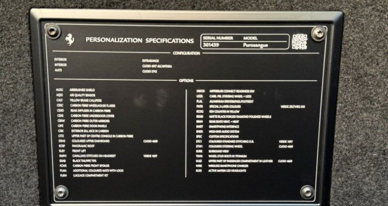 FERRARI PUROSANGUE 6.5 V12 725 Véhicule en excellent état Première main Immatriculation Française Pas de malus Configuration exceptionnelle Date de mise en circulation : 16/02/2024 Kilométrage : 310kms Exterieur : Verde Zeltweg Interieur : cuoio ( cuir marron/alcantara) détails carbone Equipements et Options : Kit de réparation pneumatiques Système suspensions actives Ferrari Transmission Dual Clutch 8 vitesses Différentiel à contrôle électronique avec intégration SSC 4RM - S Evo Étriers de freins jaunes Ecran passage 10.2 Ecran 16 entièrement numérique Fermeture automatique portes AR 4 portes à fermeture souple 4 sièges entièrement électriques Housse de protection Système Infotelematic avec nouveau HMI, port USB dans le tunnel central, Bluetooth audio streaming Miroirs extérieurs chauffants et repliables électriquement Clé avec transpondeur, système antivol, télécommande pour portes et coffre, système de démarrage Système air conditionné 4 zones Détection des angles morts Direction assistée électrique dynamique Empettement virtuel (PCV 3.0) avec roues AR directionnelles Sièges chauffants Sièges ventilés Sièges électrique à mémoire APPLE CAR PLAY ISOFIX pour les sièges AR Caméra de parking AR Capteurs de parking AV et AR Capteurs de luminosité et de pluie Système de contrôle de pression et température des pneumatiques Airbags AV et latéraux à double enclenchèment Phares entièrement LED Aide au maintien de la voie Avertissement de sortie de voie Frein d'urgence automatique Régulateur de vitesses adaptatif ABS EVO Système de freinage carbo-céramique (CCM4) Contrôles dynamiques véhicule (Manettino avec 5 réglages : Glace, Mouillé, Confort, Sport, ESC OFF) Contrôle de traction F1 avec intégration SSC Affichage tête haute Bas de seuils de portes extérieurs en fibre de Carbone Capteurs Qualité de l’Air Cavallino brodé sur les appui-têtes Chargeur de smartphone sans fil Colonnes roues en titane Couleur sur demande pour coutures standards Couleur sur demande pour partie supérieure du tableau de bord Couleur sur demande pour volant Couleurs extérieures spéciales Echappement de couleur Noire Fond compte-tours Jaune Jantes forgées diamantées Noir opaque Kit coffre Kit maintien de charge Panneaux des portes en carbone Passage de roue en fibre de Carbone Phares à LED à matrice active PTU Repose-pieds en Aluminium Retroviseurs extérieurs en Carbone Seuils de portes extérieurs en Carbone Sièges au Desing spécifique Smartphone connection Spoiler AV en carbone Surélévateur AV Surtapis avec logo voiture brodé Système Audio High-End Système Side Slip Control (SSC) 8.0 Toit panoramique Volant en Carbone avec LEDs Vue panoramique Zone supérieure instruments de bord en Carbone RS MONACO VOUS PROPOSE AUSSI : * ACHAT & REPRISE de votre ancien véhicule * Gestion des démarches administratives liées à l'immatriculation et carte grise de votre véhicule, en France et à Monaco * Véhicule garanti 3 mois * Financement de votre nouvelle acquisition possible (Validation sous 48 heures sous réserve d'acceptation du dossier) Nos Horaires : Du Lundi au Vendredi de 9h00 à 18h30 Non Stop Notre Adresse : RS MONACO, 32 bd du Jardin Exotique, 98000 Monaco Aucune responsabilité n’est assumée par notre société en cas d’erreur