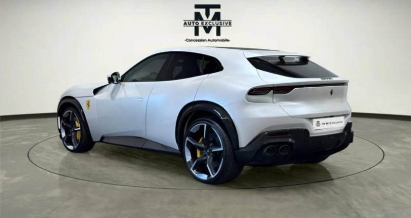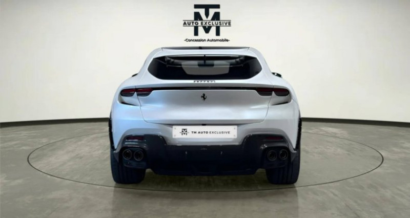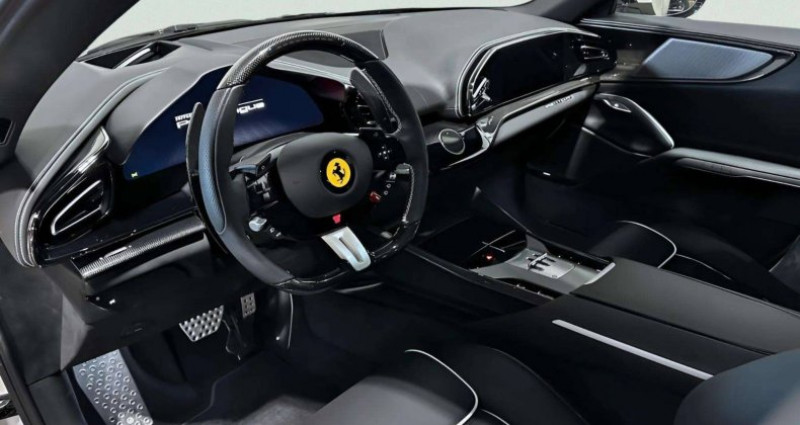 Cylindrée : 6496 cm3 Nb. Vitesse : 8 - 4 portes à fermeture souple - 4RM - S Evo - 4 sièges entièrement électriques - ABS EVO - Aide au maintien de la voie - Airbags AV et latéraux à double enclenchèment - Avertissement de sortie de voie - Bas de seuils de portes extérieurs en fibre de carbone - Cache moyeux en fibre de carbone - Caméra de parking AR - Capteurs de luminosité et de pluie - Capteurs de parking AV/AR - Capteurs Qualité de l'Air - Cavallino brodé sur appuis-tête - Chargeur de smartphone sans fil - Clé avec transpondeur, système antivol, télécommande pour portes et coffre, système de démarrage sans clé - Colonnes roues en titane - Contrôle de traction F1 avec intégration SSC (Side Slip Control) - Contrôles dynamiques véhicule (Manettino avec 5 réglages : Glace, Mouillé, Confort, Sport, ESC OFF) - Couleurs extérieures spéciales - Couleur sur demande pour coutures spéciales - Détection des angles morts - Différentiel à contrôle électronique avec intégration SSC (Side Slip Control) - Direction assistée électrique dynamique - Echappement de couleur Noire - Ecran 16 entièrement numérique - Ecran passage 10,2 - Ecussons Scuderia sur ailes AV - Empettement virtuel (PCV 3.0) avec roues AR directionnelles - Etriers de freins de couleur Giallo - Extracteur AR en carbone - Fermeture automatique portes AR - Fond compte-tours Blanc - Frein d'urgence automatique - Housse de protection - ISOFIX pour les sièges AR - Jantes en alliage 22/23 - Jantes forgées diamantées brillant - Kit coffre - Kit de réparation pneumatiques - Kit maintien de charge - Miroirs extérieurs chauffants et repliables électriquement - Pack Personnalisation - Panneaux des portes en carbone - Partie haute de l'habitacle en cuir couleur au choix - Passage de roue en fibre de Carbone - Passepoils couleur au choix - Phares à LED à matrice active - Phares entièrement LED - PTU (Power Transfer Unit) - Régulateur de vitesses adaptatif - Rétroviseur digital - Sellerie en cuir - Seuils de portes extérieurs en carbone - Sièges au desing spécifique - Sièges AV ventilés et massants - Smartphone connection - Spoiler AV en carbone - Surélévateur AV - Système air conditionné 4 zones - Système Audio High-End - Système d'appel d'urgence - Système de contrôle de pression et température des pneumatiques - Système de freinage carbo-céramique (CCM4) - Système homelink pour ouverture garage - Système Infotelematic avec nouveau HMI, port USB dans le tunnel central, Bluetooth audio streaming - Système Side Slip Control (SSC) 8.0 - Système suspensions actives Ferrari - Toit en fibre de Carbone - Toit panoramique - Transmission Dual Clutch 8 vitesses - Tunnel supérieur en carbone - Vitres AR teintées - Volant chauffant - Volant en carbone + LEDs - Vue panoramique