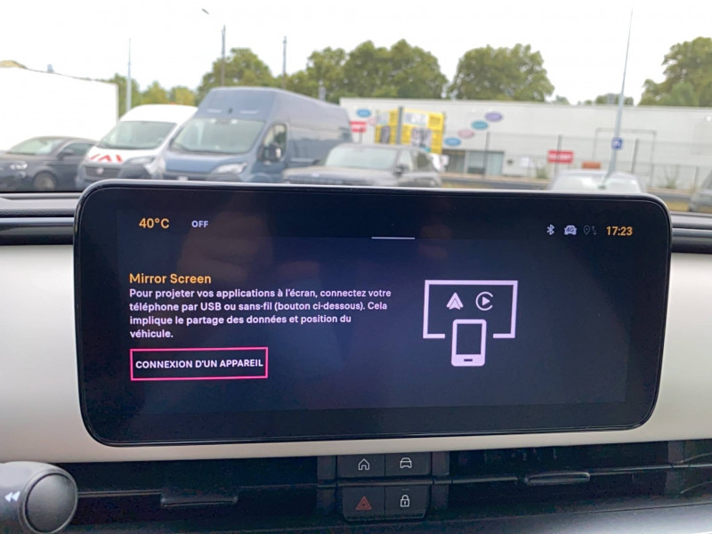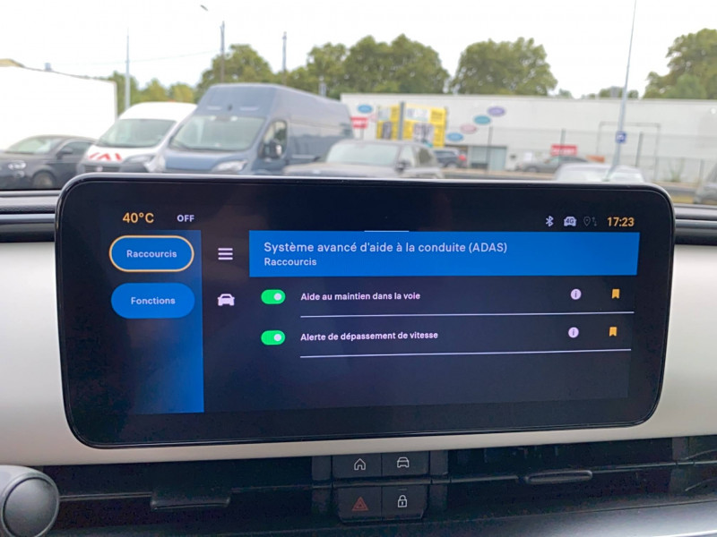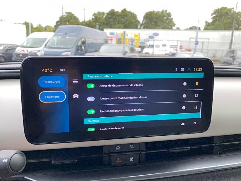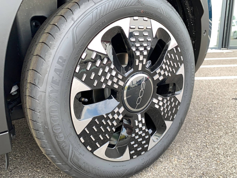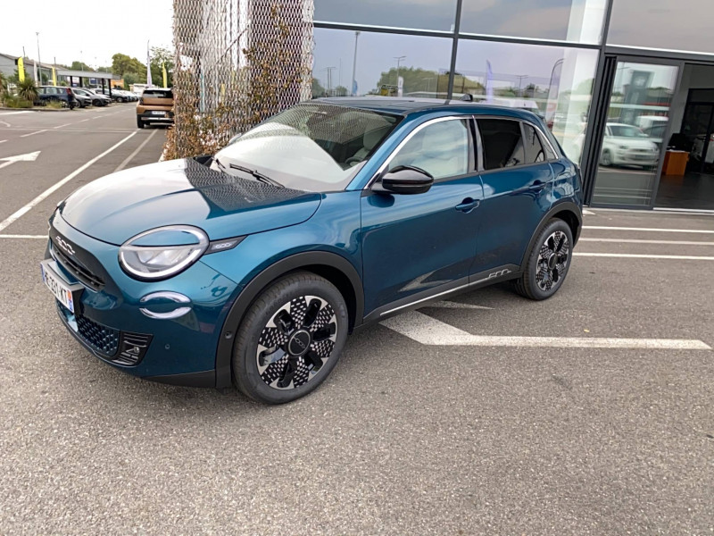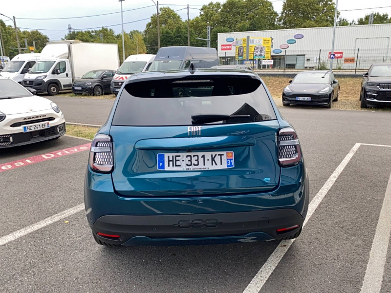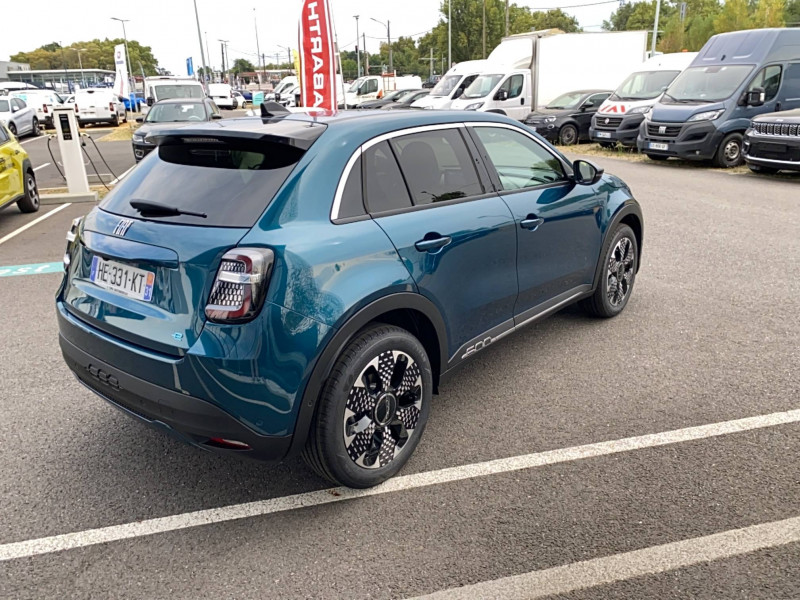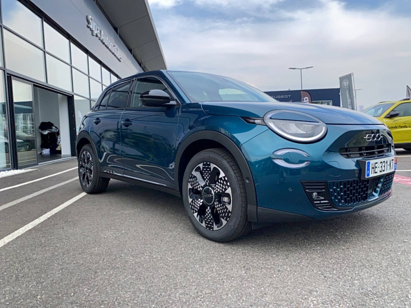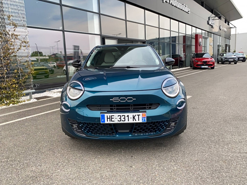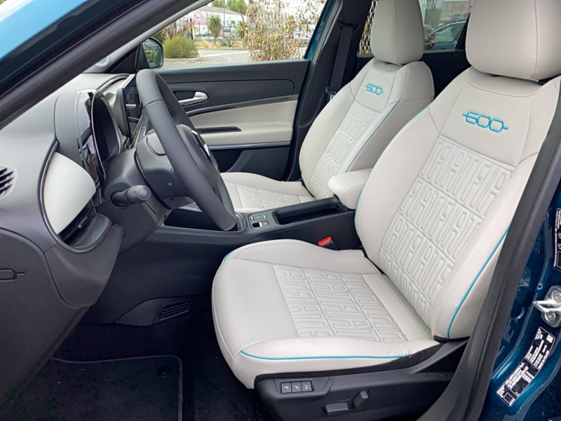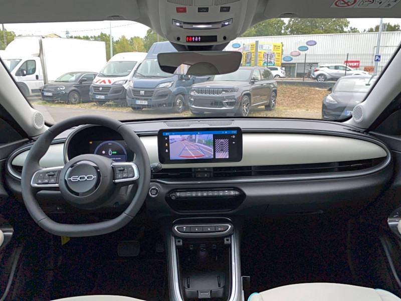 Accoudoir central AV avec couvercle magnétique / Antenne de toit type aileron de requin noir brillant / Boîte de vitesse automatique 1 rapport / Câble de recharge Mode 3 / Chargeur à induction pour smartphone / Chargeur embarqué 7kW / Chargeur USB de type A et USB de type C / Chromothérapie (personnalisation de l'ambiance lumineuse intérieure) / Clignotants à LED / Combiné d'instrumentation numérique 7'' / Commutation feux de route/croisement / Conduite autonome de niveau 2 / Connectivité Smartphone Apple CarPlay et Android Auto sans fil / Console centrale AV avec couvercle magnétique La Prima / Contrôle de la traction (TCS) / Coques de rétroviseurs noir brillant / Détails chromés extérieur / Freinage autonome d'urgence avec détection de piéton et de cycliste / Frein de stationnement électrique avec fonction Auto Hold / Hayon à ouverture électrique mains libres / Kit Fix & Go- kit anti-crevaison / Logo 600 chromé dans la calandre AV / Logo FIAT chromé hayon de coffre / Ouverture sans clé / Pare-soleil avec miroir de courtoisie / Planche de bord couleur carroserie / Planche de bord couleur Ivoire / Plancher de coffre modulable / Poches aumonières au dos des sièges AV / Poignées de portes intérieurs chromées / Prédisposition attelage / Projecteurs antibrouillard à LED avec fonction de virage / Projecteurs full LED 'Infinity' / Rappel du port de la ceinture de sécurité (1ère et 2ème rangées) / Recharge rapide 100kW / Réglage lombaire du siège conducteur et fonction massage / Rétroviseur intérieur photochromatique sans contour / Rétroviseurs extérieurs rabattables et chauffants avec éclairage au sol / Sellerie premium ivoire soft touch avec monogramme FIAT et logo 600 Bleu Azur / Services connectés UConnect Services / Services connectés UConnect Services / Siège conducteur à réglage électrique à 6 positions / Siège passager à réglage manuel 6 positions / Spots de lecture AV et AR à LED / Système ISOFIX siège AV passager et banquette AR / Système U-Connect 10,25" (sans NAV) / Tapis de sol / Tunnel central en position basse / USB de type C en 2ème rangée / Volant soft touch