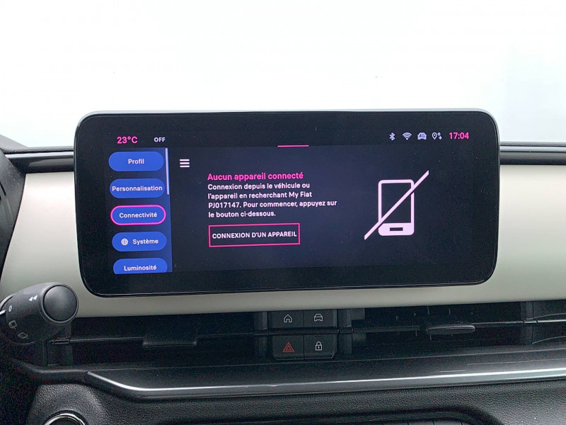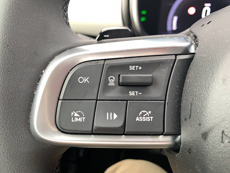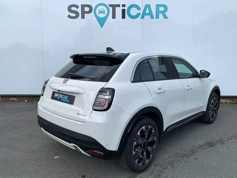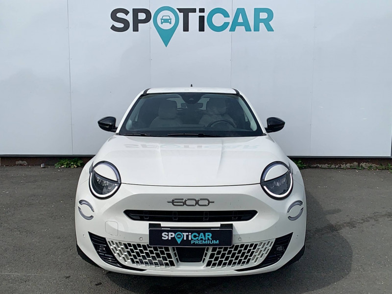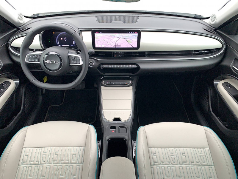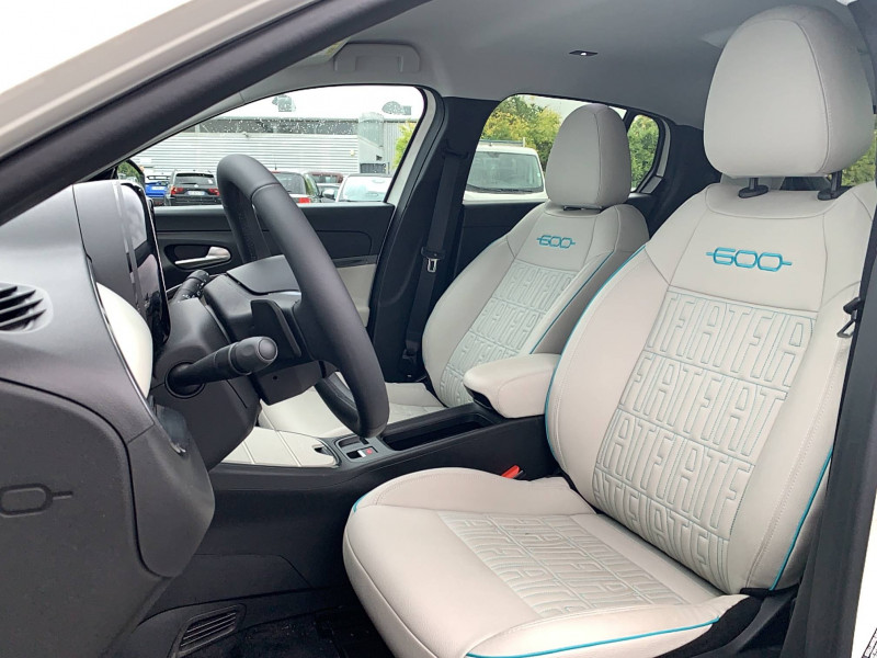 3ème appuie-tête AR / Antenne de toit type aileron de requin noir brillant / Boîte de vitesse automatique 6 rapports / Canule d'échappement chromée / Canule d'échappement côté droit / Chargeur USB de type A et USB de type C / Combiné d'instrumentation numérique 7'' / Commutation feux de route/croisement / Conduite autonome de niveau 2 / Connectivité Smartphone Apple CarPlay et Android Auto sans fil / Console centrale AV avec couvercle magnétique La Prima / Contrôle de la traction (TCS) / Coques de rétroviseurs extérieurs noires / Freinage autonome d'urgence avec détection de piéton et de cycliste / Frein de stationnement mécanique / Hayon à ouverture électrique mains libres / Kit anti-crevaison Fix&Go / Logo 600 chromé dans la calandre AV / Logo FIAT chromé hayon de coffre / Logo "HYBRID" sur le hayon de coffre / Pare-soleil avec miroir de courtoisie / Planche de bord couleur Ivoire / Plancher de coffre modulable / Poches aumonières au dos des sièges AV / Poignées de portes intérieurs noires mat / Projecteurs full LED 'Infinity' / Rappel du port de la ceinture de sécurité (1ère et 2ème rangées) / Réglage lombaire du siège conducteur et fonction massage / Rétroviseur intérieur manuel jour/nuit / Sellerie premium ivoire soft touch avec monogramme FIAT et logo 600 Bleu Azur / Services connectés UConnect Services / Siège conducteur à réglage électrique à 6 positions / Siège passager à réglage manuel 6 positions / Spots de lecture AV et AR à LED / Système ISOFIX siège AV passager et banquette AR / Système Uconnect 10,25" Nav / Tapis de sol / Tunnel central en position basse / USB de type C en 2ème rangée / Volant Soft Touch
