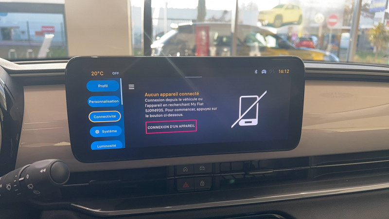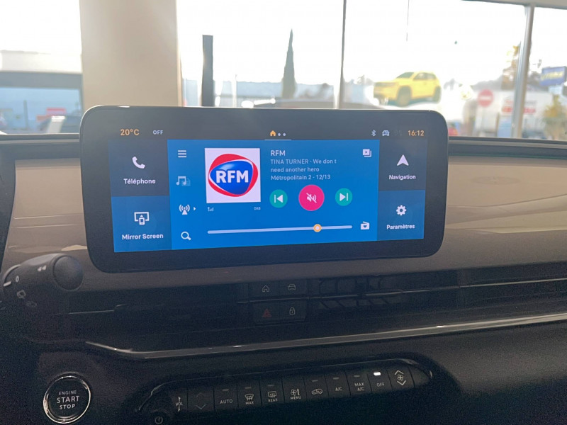3ème appuie-tête AR / Boîte de vitesse automatique 6 rapports / Canule d'échappement côté droit (double) / Chargeur USB de type A et USB de type C / Chargeur USB de type C à l'AR / Chromothérapie (Lumière d'ambiance intérieure) / Clignotants à LED / Combiné d'instrumentation numérique 7'' / Commutation feux de route/croisement / Connectivité Smartphone Apple CarPlay et Android Auto sans fil / Console centrale avec pré-disposition couvercle magnétique / Contrôle de la traction (TCS) / Freinage autonome d'urgence avec détection de piéton et de cycliste / Frein à main électrique / Intervalle de maintenance 25 000 km ou 1 an / Kit anti-crevaison Fix&Go / Logo "HYBRID" sur le hayon de coffre / Pare-soleil avec miroir de courtoisie sans éclairage / Planche de bord couleur carroserie avec contour noir brillant / Plancher de coffre modulable / Poches aumonières au dos des sièges AV / Poignées de portes intérieurs noires mat / Prédisposition attelage / Projecteurs antibrouillard à LED avec fonction de virage / Projecteurs full LED 'Infinity' (AV et AR) / Rappel du port de la ceinture de sécurité (1ère et 2ème rangées) / Rétroviseur intérieur photochromatique / Sellerie bicolore en tissu ''Jacquard'' / Services connectés UConnect Services / Siège conducteur à réglage manuel à 6 positions / Siège passager à réglage manuel à 4 positions / Système ISOFIX siège AV passager et banquette AR / Système Uconnect 10,25" / Tunnel central en position basse / Volant soft touch multifonctions avec détail chromé