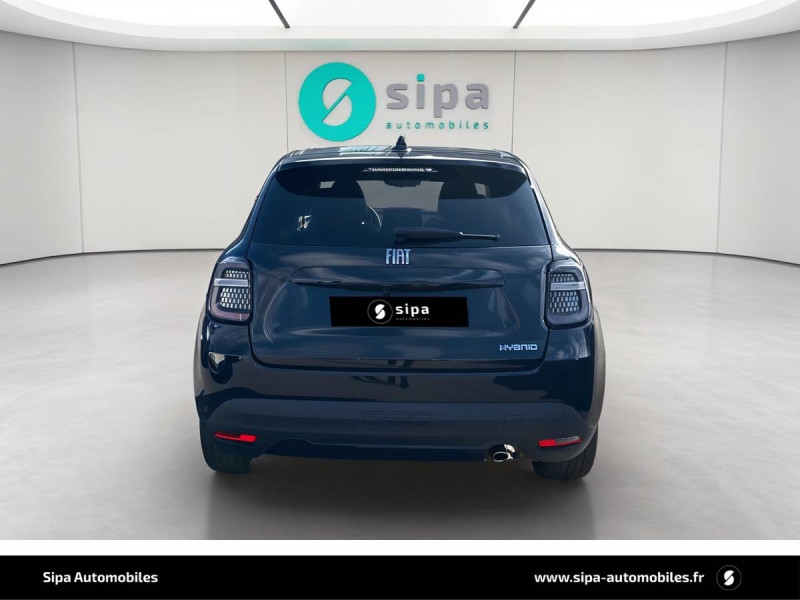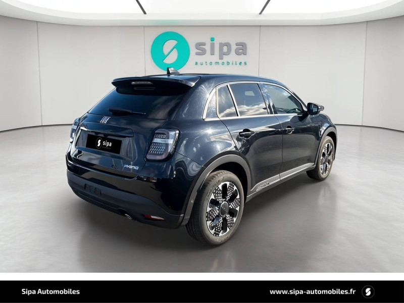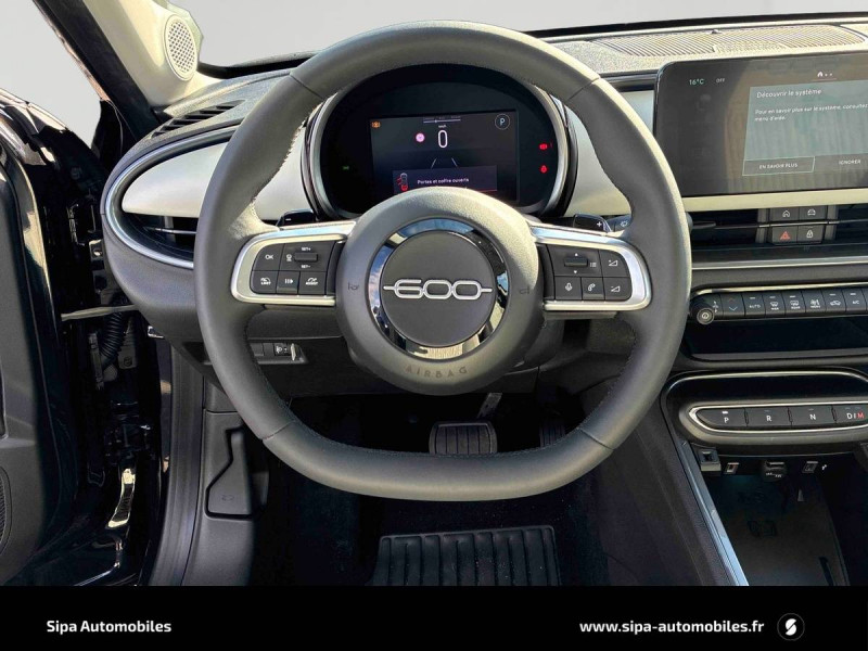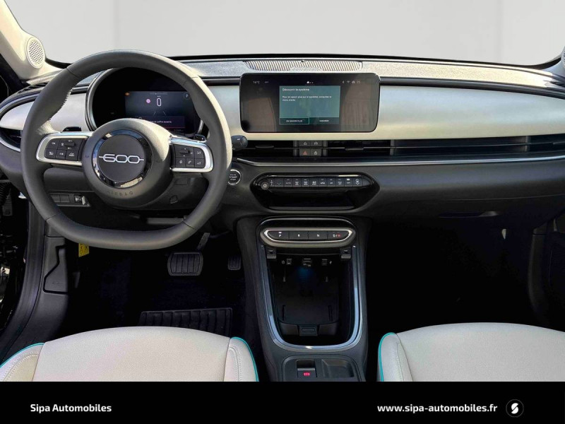 Antenne de toit type aileron de requin noir brillant / Canule d'échappement chromée / Canule d'échappement côté droit / Chargeur USB de type A et USB de type C / Chromothérapie (personnalisation de l'ambiance lumineuse intérieure) / Combiné d'instrumentation numérique 7'' / Commutation feux de route/croisement / Conduite autonome de niveau 2 / Connectivité Smartphone Apple CarPlay et Android Auto sans fil / Console centrale AV avec couvercle magnétique La Prima / Détails chromés extérieur / Freinage autonome d'urgence avec détection de piéton et de cycliste / Frein de stationnement mécanique / Hayon à ouverture électrique mains libres / Kit anti-crevaison Fix&Go / Logo 600 chromé dans la calandre AV / Logo FIAT chromé hayon de coffre / Pare-soleil avec miroir de courtoisie / Planche de bord couleur Ivoire / Plancher de coffre modulable / Poches aumonières au dos des sièges AV / Poignées de porte intérieures chromées / Projecteurs antibrouillard à LED avec fonction de virage / Projecteurs full LED 'Infinity' / Rappel du port de la ceinture de sécurité (1ère et 2ème rangées) / Réglage lombaire du siège conducteur et fonction massage / Rétroviseur intérieur photochromatique sans contour / Sellerie premium ivoire soft touch avec monogramme FIAT et logo 600 Bleu Azur / Services connectés UConnect Services / Siège conducteur à réglage électrique à 6 positions / Siège passager à réglage manuel 6 positions / Signature LED / Spots de lecture AV et AR à LED / Système ISOFIX siège AV passager et banquette AR / Système Uconnect 10,25" Nav / Tapis de sol / Tunnel central en position basse / USB de type C en 2ème rangée / Volant Soft Touch