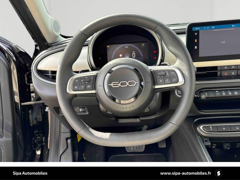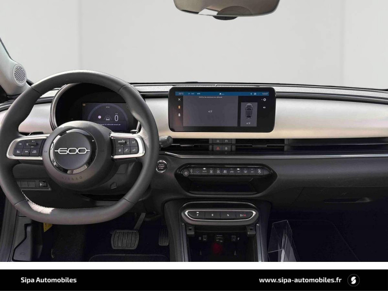 Antenne de toit type aileron de requin noir brillant / Canule d'échappement chromée / Canule d'échappement côté droit / Chargeur USB de type A et USB de type C / Chromothérapie (personnalisation de l'ambiance lumineuse intérieure) / Combiné d'instrumentation numérique 7'' / Commutation feux de route/croisement / Conduite autonome de niveau 2 / Connectivité Smartphone Apple CarPlay et Android Auto sans fil / Console centrale AV avec couvercle magnétique La Prima / Détails chromés extérieur / Freinage autonome d'urgence avec détection de piéton et de cycliste / Frein de stationnement mécanique / Hayon à ouverture électrique mains libres / Kit anti-crevaison Fix&Go / Logo 600 chromé dans la calandre AV / Logo FIAT chromé hayon de coffre / Pare-soleil avec miroir de courtoisie / Planche de bord couleur Ivoire / Plancher de coffre modulable / Poches aumonières au dos des sièges AV / Poignées de porte intérieures chromées / Projecteurs antibrouillard à LED avec fonction de virage / Projecteurs full LED 'Infinity' / Rappel du port de la ceinture de sécurité (1ère et 2ème rangées) / Réglage lombaire du siège conducteur et fonction massage / Rétroviseur intérieur photochromatique sans contour / Sellerie premium ivoire soft touch avec monogramme FIAT et logo 600 Bleu Azur / Services connectés UConnect Services / Siège conducteur à réglage électrique à 6 positions / Siège passager à réglage manuel 6 positions / Signature LED / Spots de lecture AV et AR à LED / Système ISOFIX siège AV passager et banquette AR / Système Uconnect 10,25" Nav / Tapis de sol / Tunnel central en position basse / USB de type C en 2ème rangée / Volant Soft Touch