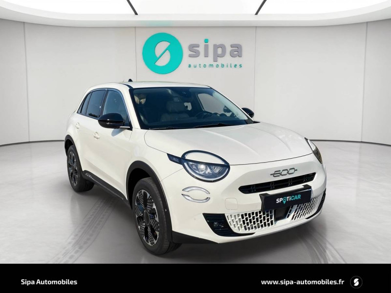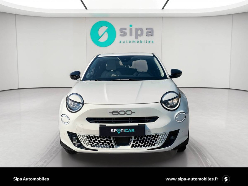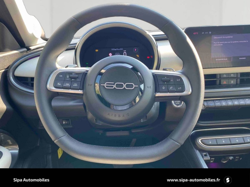 Antenne de toit type aileron de requin noir brillant / Canule d'échappement chromée / Canule d'échappement côté droit / Chargeur USB de type A et USB de type C / Chromothérapie (personnalisation de l'ambiance lumineuse intérieure) / Combiné d'instrumentation numérique 7'' / Commutation feux de route/croisement / Conduite autonome de niveau 2 / Connectivité Smartphone Apple CarPlay et Android Auto sans fil / Console centrale AV avec couvercle magnétique La Prima / Détails chromés extérieur / Freinage autonome d'urgence avec détection de piéton et de cycliste / Frein de stationnement mécanique / Hayon à ouverture électrique mains libres / Kit anti-crevaison Fix&Go / Logo 600 chromé dans la calandre AV / Logo FIAT chromé hayon de coffre / Pare-soleil avec miroir de courtoisie / Planche de bord couleur Ivoire / Plancher de coffre modulable / Poches aumonières au dos des sièges AV / Poignées de porte intérieures chromées / Projecteurs antibrouillard à LED avec fonction de virage / Projecteurs full LED 'Infinity' / Rappel du port de la ceinture de sécurité (1ère et 2ème rangées) / Réglage lombaire du siège conducteur et fonction massage / Rétroviseur intérieur photochromatique sans contour / Sellerie premium ivoire soft touch avec monogramme FIAT et logo 600 Bleu Azur / Services connectés UConnect Services / Siège conducteur à réglage électrique à 6 positions / Siège passager à réglage manuel 6 positions / Signature LED / Spots de lecture AV et AR à LED / Système ISOFIX siège AV passager et banquette AR / Système Uconnect 10,25" Nav / Tapis de sol / Tunnel central en position basse / USB de type C en 2ème rangée / Volant Soft Touch