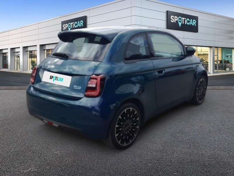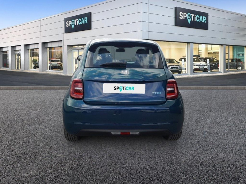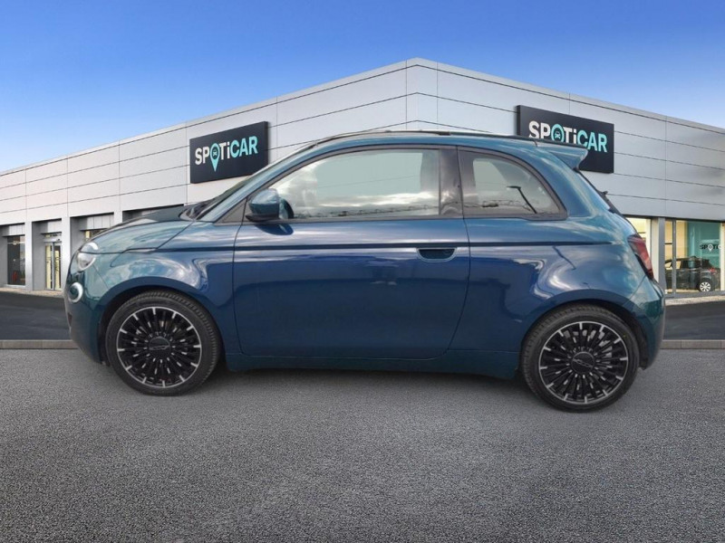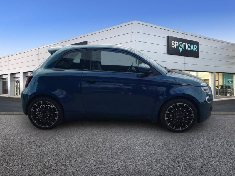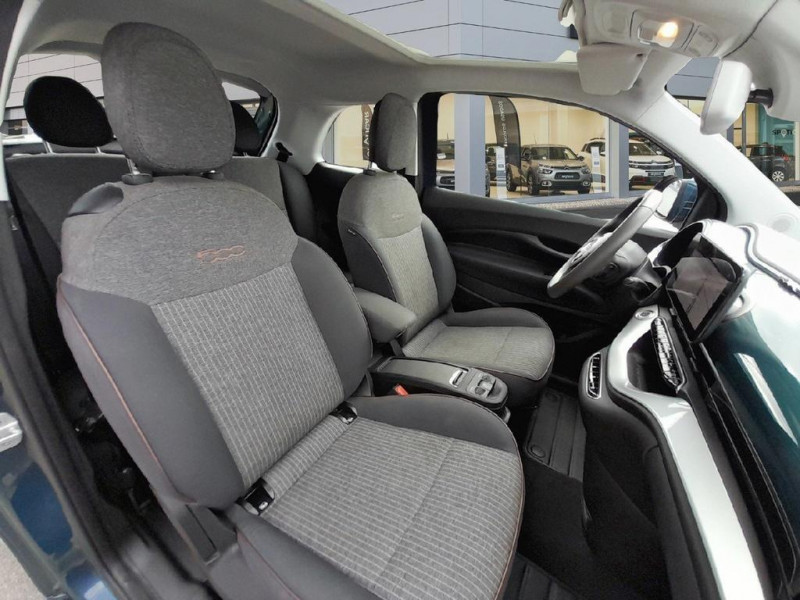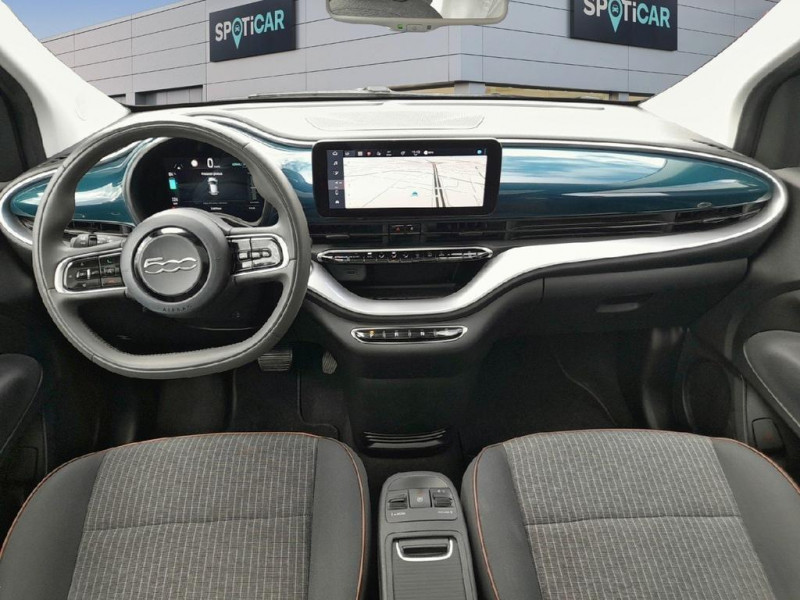 6 HP / ABS - antiblocage des roues avec répartiteur de freinage EBD / Accoudoir central avec console centrale fermée / Chargeur embarqué 11 kW triphasé / Chargeur à induction pour smartphone / Coloris de personnalisation Ocean Green / Console centrale fermée / Coques de rétroviseurs couleur carroserie / Câble de recharge Mode 2 / Câble de recharge Mode 3 / Détails chromés : logo 500 sur calandre et logo FIAT sur hayon / Détecteur de fatigue / ESP - Contrôle électronique de stabilité avec aide au démarrage en côté «Hill Holder» / Ecran couleur TFT 7p / Feux croisement/route automatique / Frein à main électrique / Freinage autonome d'urgence avec détection de piéton et de cycliste / Kit Fix & Go / Limiteur de vitesse intelligent avec reconnaissance des panneaux / Mopar Connect Box / Pare-chocs peints couleur carrosserie / Poignées de portes dissimulées / Prise charge rapide (85kW) / Projecteurs AV full LED «Infinity» / Rétroviseur intérieur photochromatique / Siège conducteur avec 6 réglages / Système d'alerte sonore au piéton / Système d'infodivertissement Uconnect 10 / 25'‘ avec navigation / Volant noir soft touch