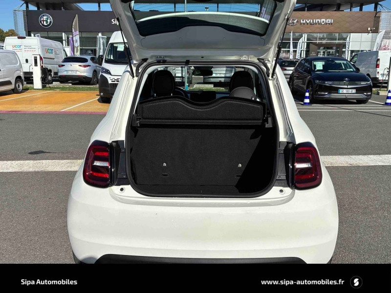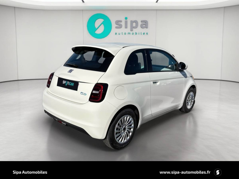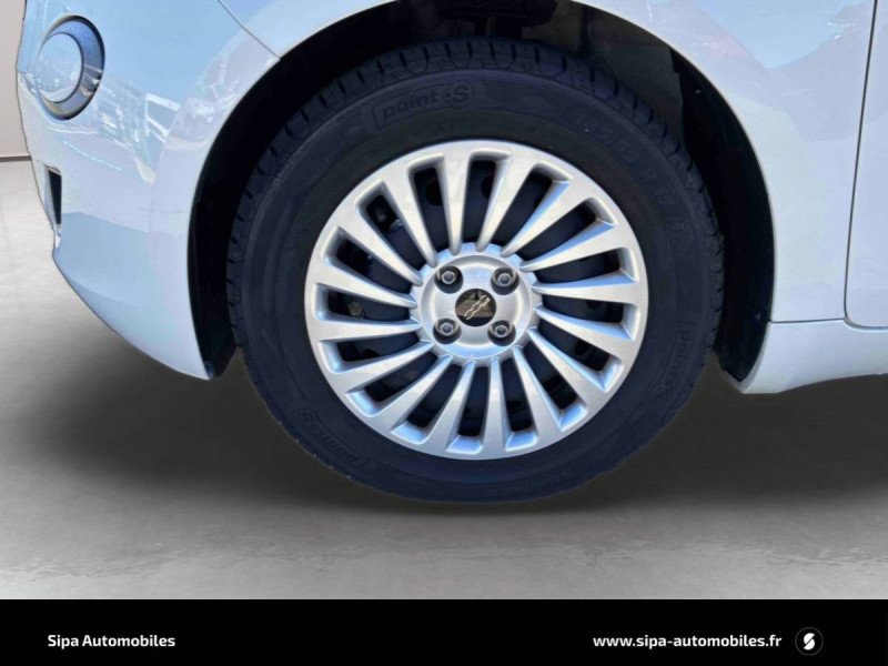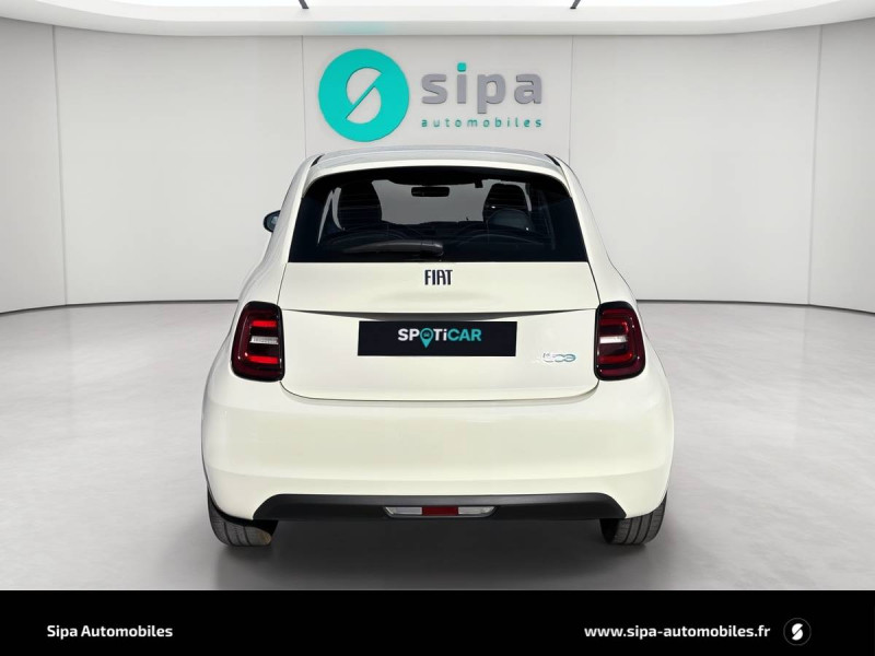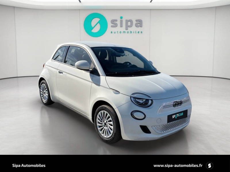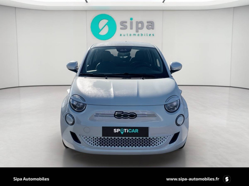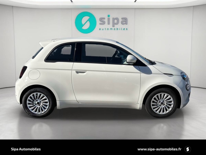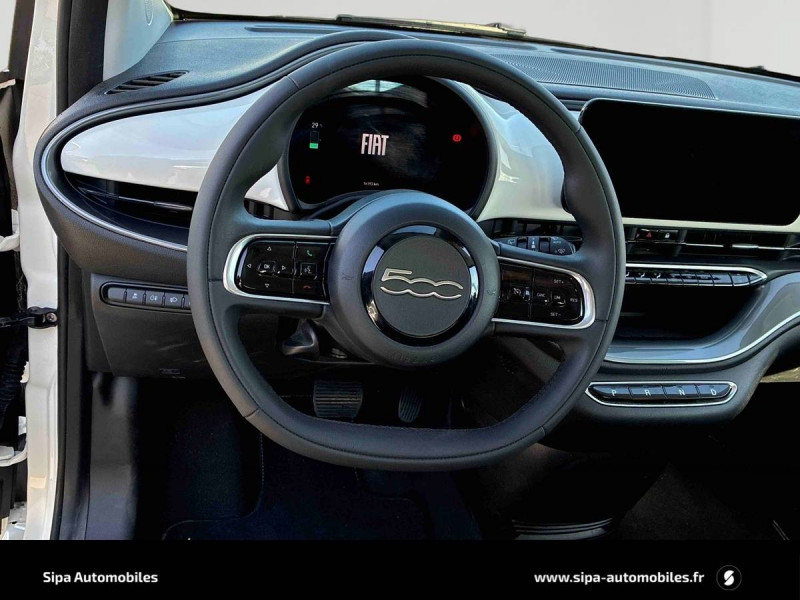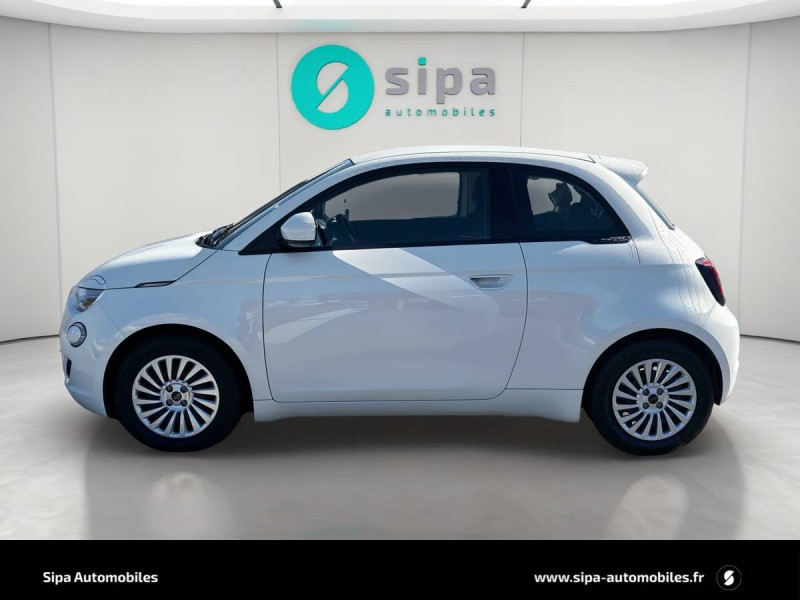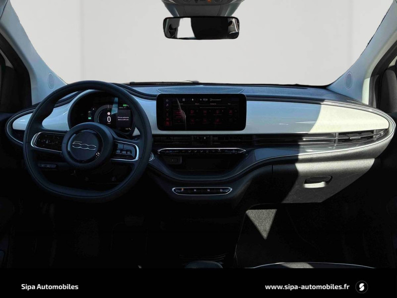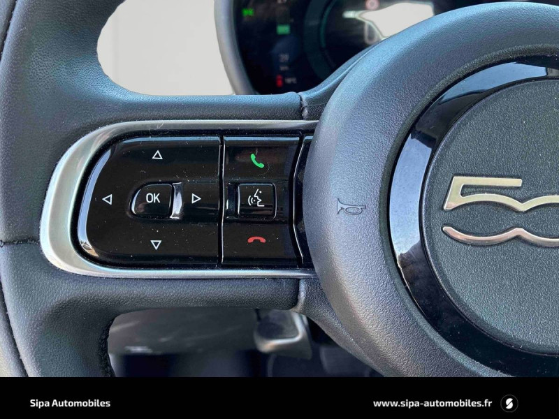 6 HP / ABS - antiblocage des roues avec répartiteur de freinage EBD / Batterie 23,8 kWh / Câble de recharge Mode 3 / Chargeur embarqué 11 kW (AC) / Coques de rétroviseurs couleur carroserie / Détails chromés : logo 500 sur calandre et logo FIAT sur hayon / Ecran couleur TFT 7" / Frein à main électrique / Pare-chocs peints couleur carrosserie / Poignées de portes dissimulées / Recharge rapide 50 kW (DC) / Sellerie Tissu Seaqual noir + Planche de bord couleur carrosserie / Système d'alerte sonore au piéton / Système U-Connect 10,25" (sans NAV) / Volant avec commandes / Volant noir soft touch