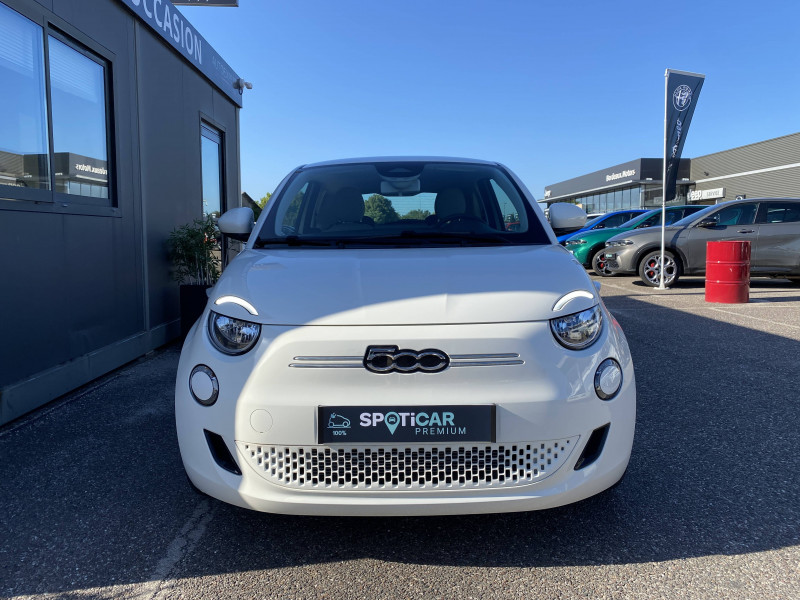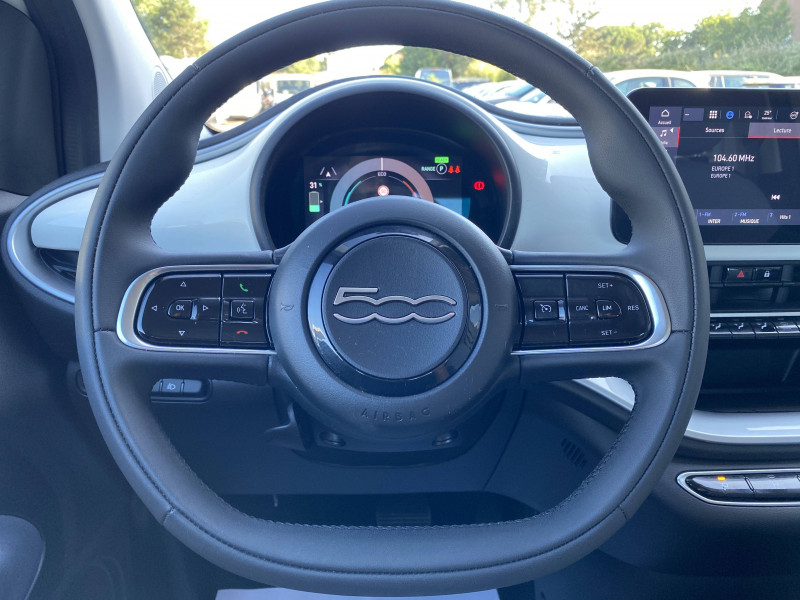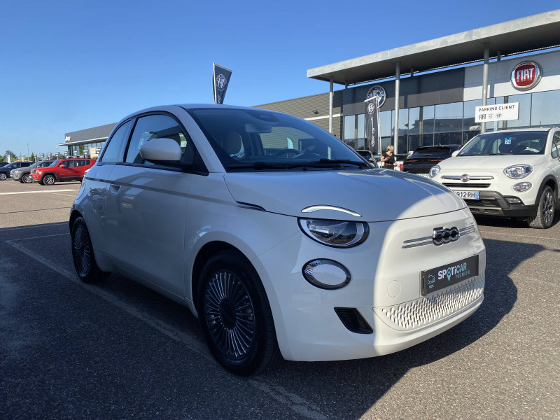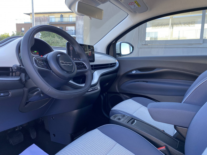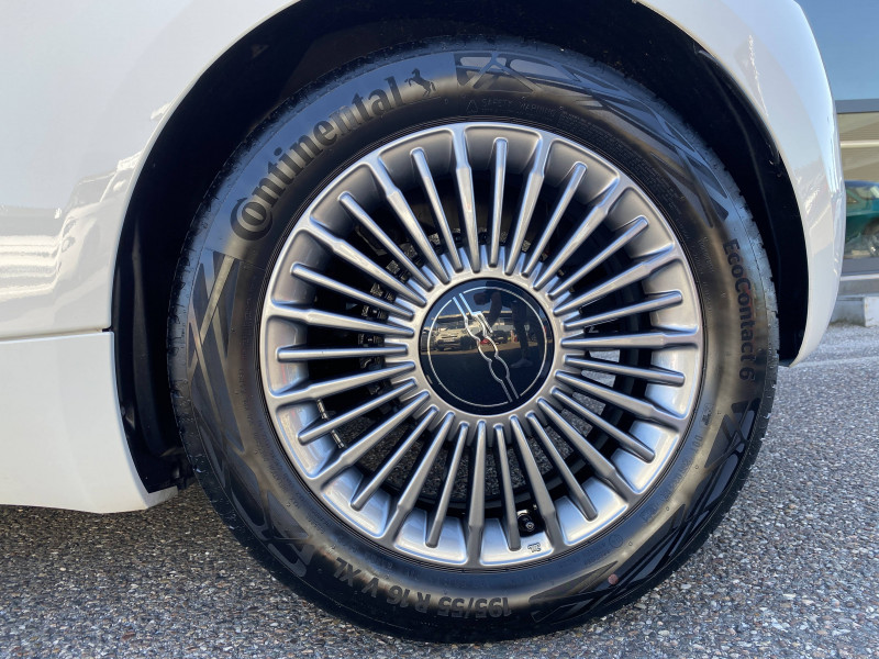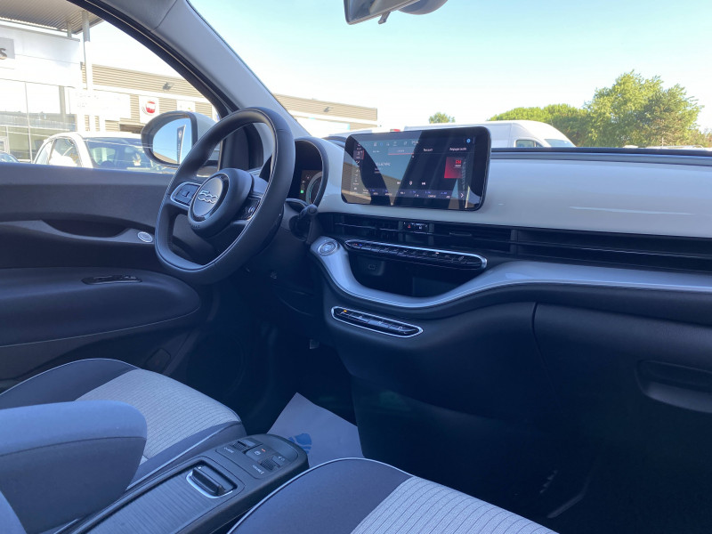 6 HP / ABS - antiblocage des roues avec répartiteur de freinage EBD / Câble de recharge Mode 3 / Chargeur embarqué 11 kW triphasé / Coques de rétroviseurs couleur carroserie / Détails chromés : logo 500 sur calandre et logo FIAT sur hayon / Ecran couleur TFT 7" / ESP - Contrôle électronique de stabilité avec aide au démarrage en côté "Hill Holder" / Freinage autonome d'urgence avec détection de piéton et de cycliste / Frein à main électrique / Limiteur de vitesse intelligent avec reconnaissance des panneaux / Mopar Connect Box / Pare-chocs peints couleur carrosserie / Poignées de portes dissimulées / Prise charge rapide (50kW) / Système d'alerte sonore au piéton / Système d'infodivertissement Uconnect 10,25'? avec navigation / Volant noir soft touch