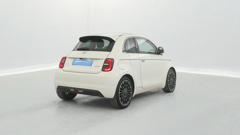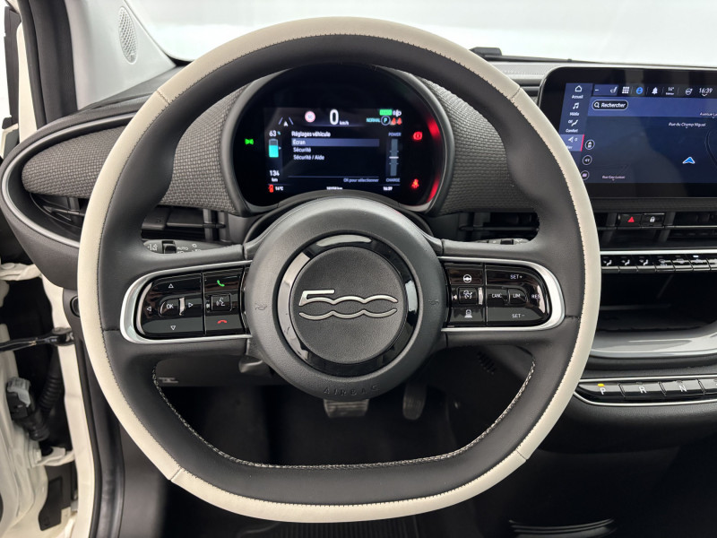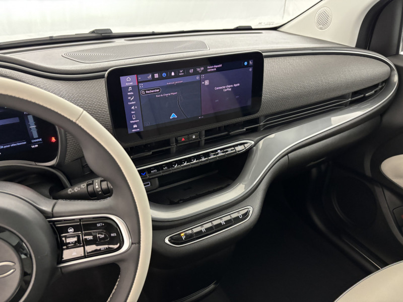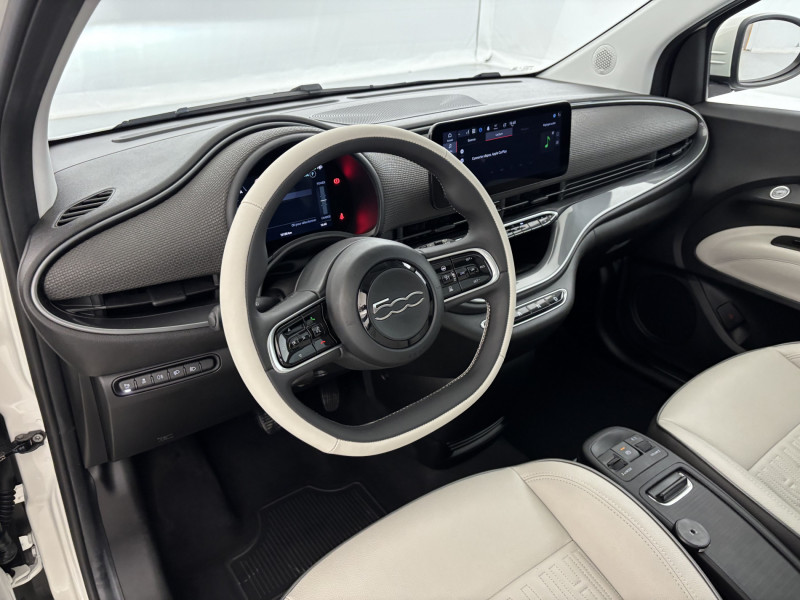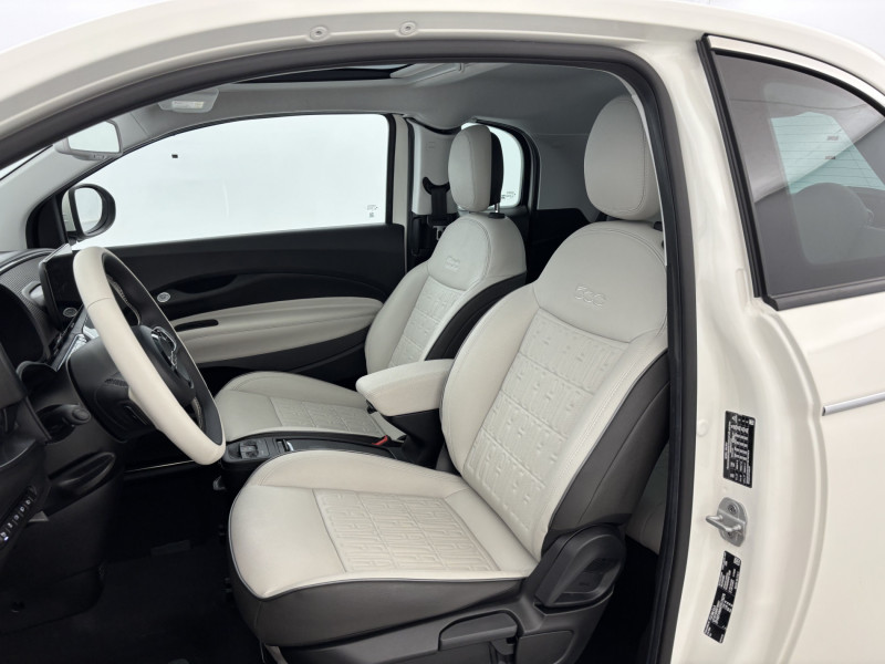 Projecteurs AV full LED "Infinity": / Système U-Connect 10,25" (sans NAV): / 6 HP: / ABS - antiblocage des roues avec répartiteur de freinage EBD: / Batterie 42 kWh: / Chargeur embarqué 11 kW (AC): / Coques de rétroviseurs couleur carroserie: / Câble de recharge Mode 3: / Détails chromés : logo 500 sur calandre et logo FIAT sur hayon: / Ecran couleur TFT 7": / Frein à main électrique: / Pare-chocs peints couleur carrosserie: / Planche de bord spécifique: / Poignées de portes dissimulées: / Recharge rapide 85 kW (DC): / Rétroviseur intérieur photochromatique: / Système d'alerte sonore au piéton: / Volant avec commandes: / Volant bicolore soft touch: / Sellerie premium ivoire soft: /