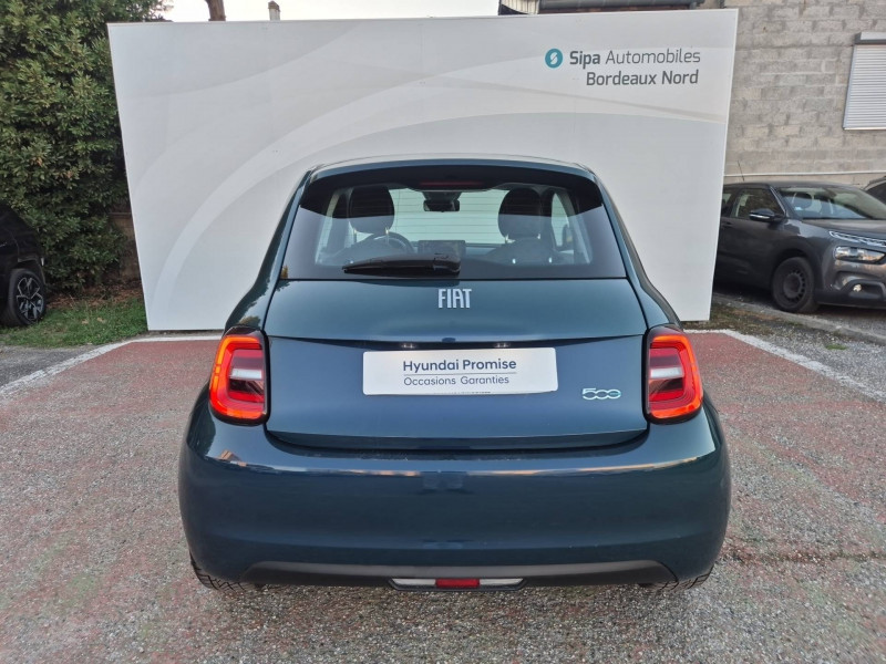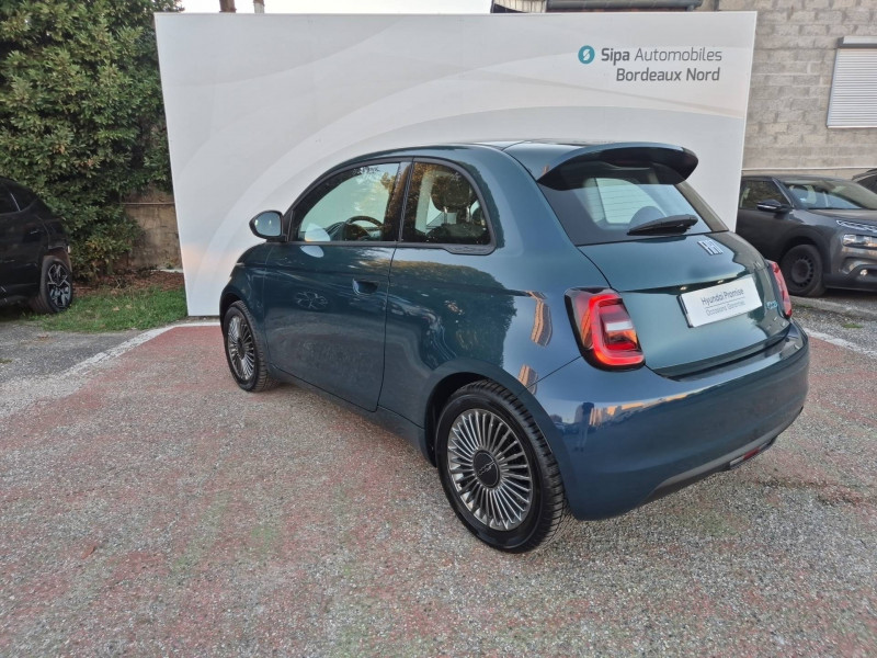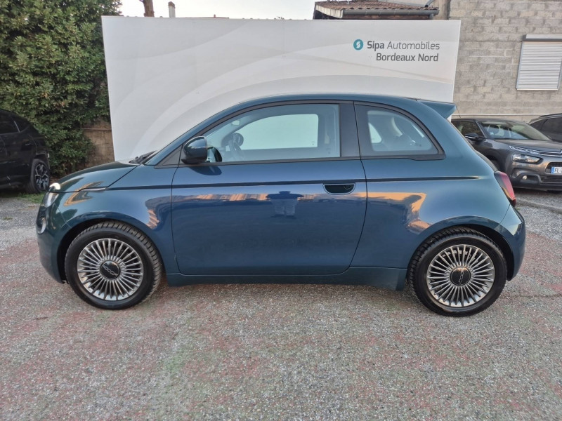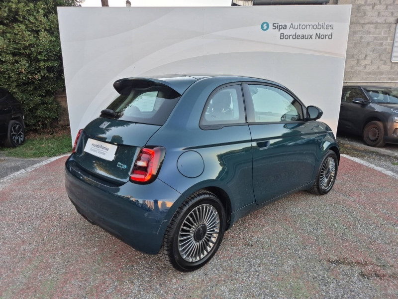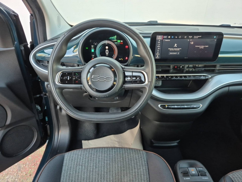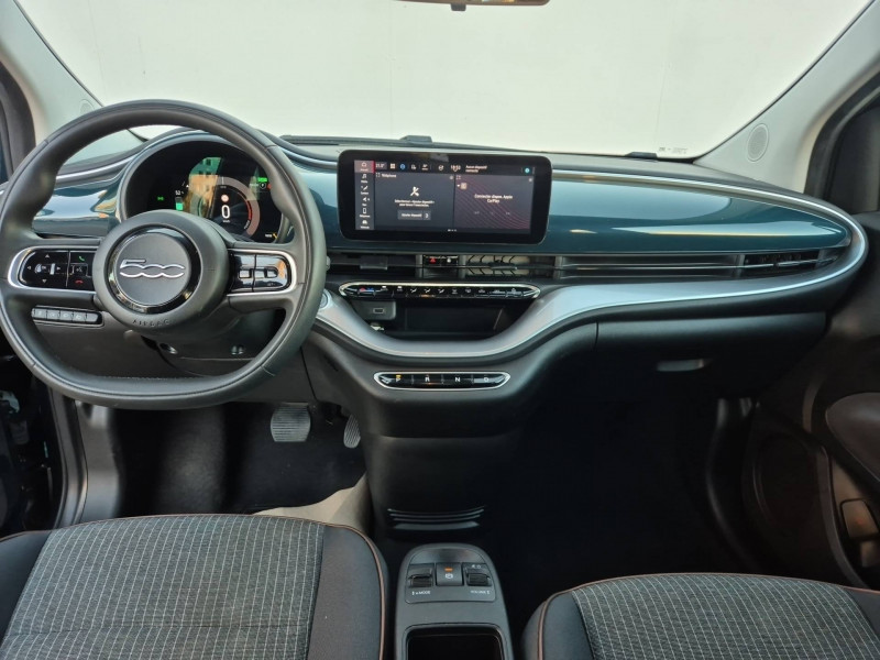 ESP - Contrôle électronique de stabilité avec aide au démarrage en côté "Hill Holder" / Système d'infodivertissement Uconnect 10,25'? avec navigation / ABS - antiblocage des roues avec répartiteur de freinage EBD / Chargeur embarqué 11 kW triphasé / Coques de rétroviseurs couleur carroserie / Câble de recharge Mode 3 / Détails chromés : logo 500 sur calandre et logo FIAT sur hayon / Frein à main électrique / Freinage autonome d'urgence avec détection de piéton et de cycliste / Limiteur de vitesse intelligent avec reconnaissance des panneaux / Mopar Connect Box / Pare-chocs peints couleur carrosserie / Poignées de portes dissimulées / Prise charge rapide (85kW) / Système d'alerte sonore au piéton