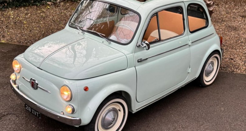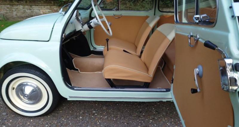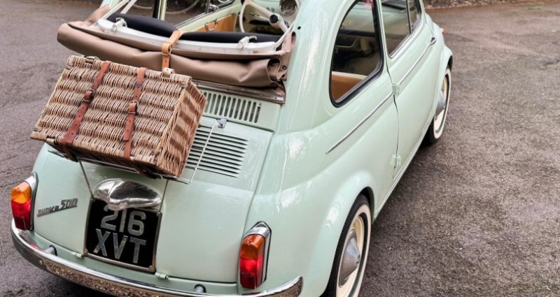 Fiat 500D, 1962 model, Verde Chiaro, 499cc engine, 17hp, Transformable long roof, 2 owners until 1987, UK import, D'Angelo Motori 650cc engine (650cc, 42 hp, 50 miles covered), 5-speed synchromesh gearbox, 4 piston calliper Disc brake conversion, Electronic ignition, Electronic fuel pump, Uprated suspension, Italian Nappa leather seats with ivory piping and matching floor mats, Mohair soft top, Picnic hamper carrier, toolkit, UK registered with Classic Italian plates, 12 inch white wall tires, Rare Fiat 500 model dashboard decal, Bang & Olufsen wireless speaker, Optional additional fully restored items: original factory supplied 499cc engine, 4-speed non-synchromesh gearbox, starter motor, fuel pump, suspension items, roof rails.. Provenance : Florida. Disponibilité : environ 7 semaines, clés en main. 42 000 € tout compris (importation, taxes, procédure d'immatriculation). Annonce publiée le 28/11/2025