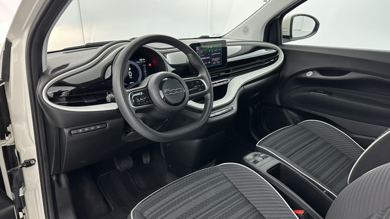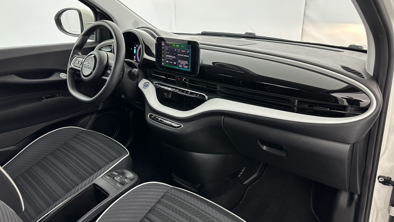 Véhicule d'occasion, peut comporter quelques défauts (Voir 360°) / Chargeur embarqué AC mono-triphasé (jusqu'à 11 kW) / Prise CCS Combo 2 DC (charge rapide jusqu'à 50 kW) / Sélecteur de mode de conduite EV : Normal, Range, Sherpa / Coques de rétroviseurs couleur carrosserie / Détails logos chromés : sur calandre et hayon / Pare-chocs peints couleur carrosserie / Peinture pastel Ice White / Sellerie tissu Seaqual noir avec monogramme FIAT / Support smartphone /