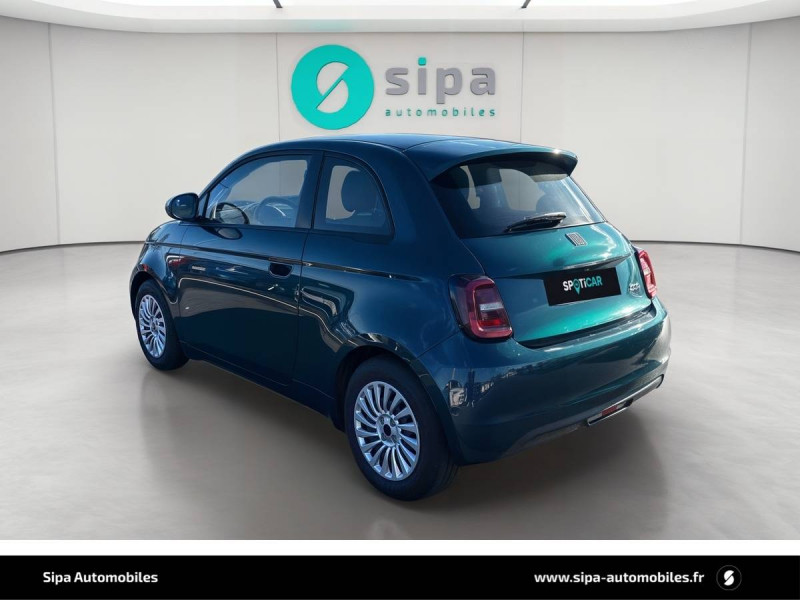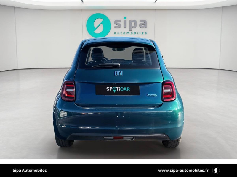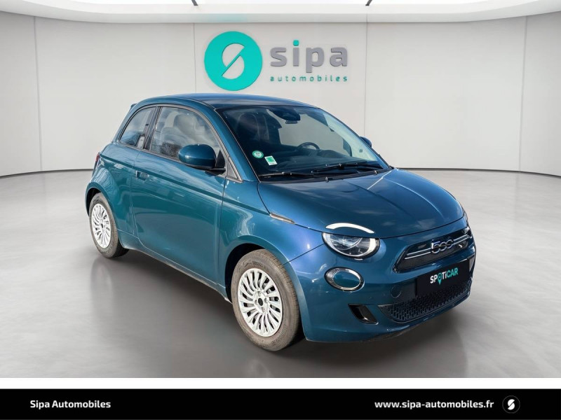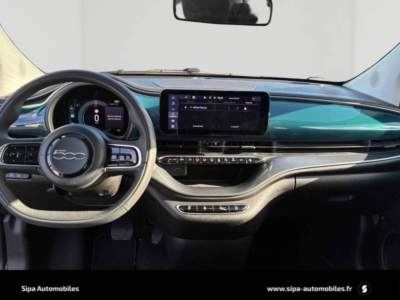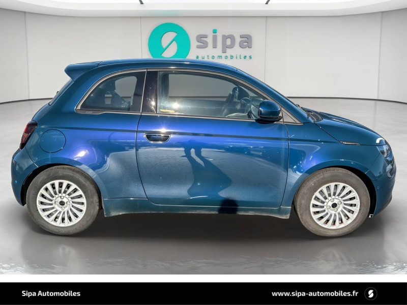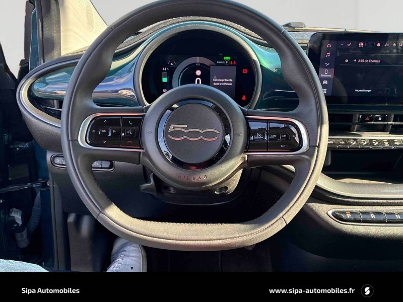 6 HP / ABS - antiblocage des roues avec répartiteur de freinage EBD / Batterie 23,8 kWh / Câble de recharge Mode 3 / Chargeur embarqué 11 kW (AC) / Coques de rétroviseurs couleur carroserie / Détails chromés : logo 500 sur calandre et logo FIAT sur hayon / Ecran couleur TFT 7" / Frein à main électrique / Pare-chocs peints couleur carrosserie / Poignées de portes dissimulées / Recharge rapide 50 kW (DC) / Sellerie Tissu Seaqual noir + Planche de bord couleur carrosserie / Système d'alerte sonore au piéton / Système U-Connect 10,25" (sans NAV) / Volant avec commandes / Volant noir soft touch