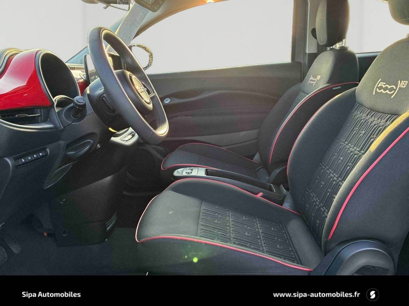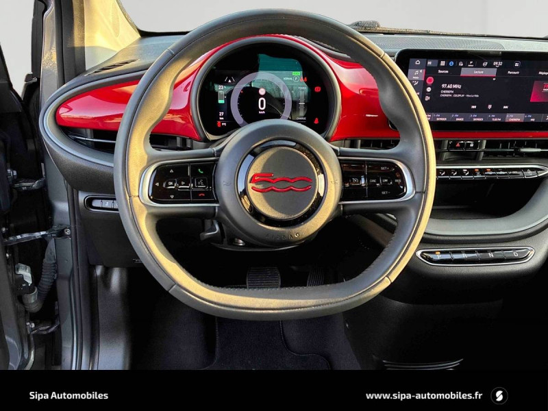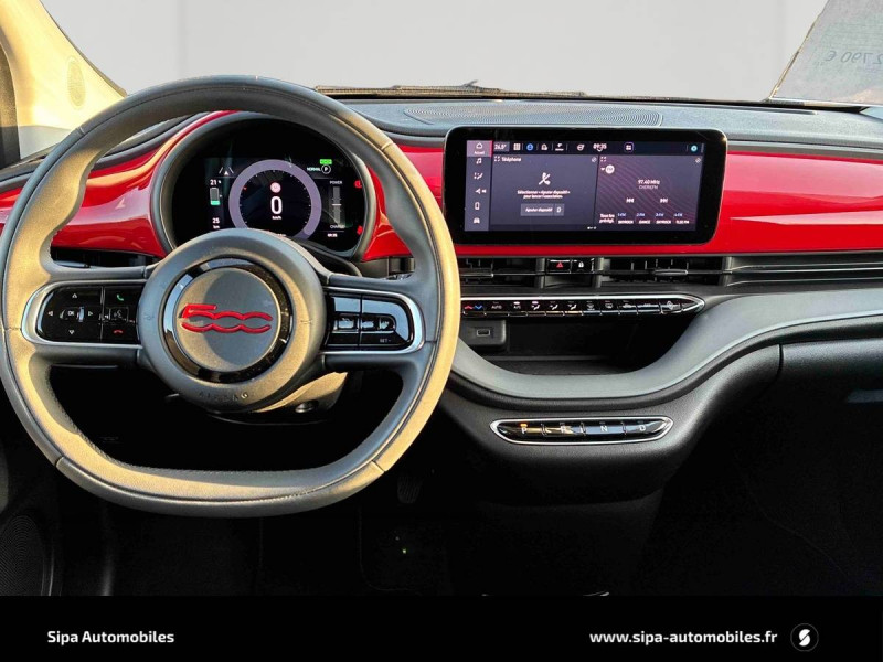 ABS - antiblocage des roues avec répartiteur de freinage EBD / Boîte à gants désinfectante avec lampe UV-C / Câble de recharge Mode 3 / Chargeur embarqué 11 kW triphasé / Contours de vitres chromés / Coques de rétroviseurs extérieurs rouges / Détails chromés : logo 500 sur calandre et logo FIAT rouges sur hayon / ESP - Contrôle électronique de stabilité avec aide au démarrage en côté "Hill Holder" / Freinage autonome d'urgence avec détection de piéton et de cycliste / Frein à main électrique / Kit (RED) :coque de clé, filtre à air, traitement antimicrobien, tapis de sol, distributeur poussoir / Limiteur de vitesse intelligent avec reconnaissance des panneaux / Mopar Connect Box / Pare-chocs peints couleur carrosserie / Poignées de portes dissimulées / Prise charge rapide (50kW) / Sellerie Tissu Seaqual avec monogramme Fiat + Planche de bord rouge / Système d'alerte sonore au piéton / Système d'infodivertissement Uconnect 10,25'? avec navigation / Tapis de sol