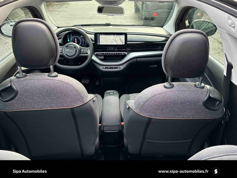 Câble mode 2 (2,3 kW) / Chargeur à induction pour smartphone / Clé spécifique en forme de galet / Feux croisement/route automatique / Freinage autonome d'urgence avec détection de piéton et de cycliste / Frein à main électrique / Garantie 2 ans / Garantie batteries 42 kW : 8 ans ou 160 000 km / Ouverture sans clé / Pack Avantage / Pack Magic Eye / Prise charge rapide (85kW) / Rétroviseur intérieur photochromatique / Services connectés via application smartphone / Seuils de portes / Système Audio à 4 haut-parleurs / Système Uconnect 10,25'' avec navigation / Tapis de sol AV/AR avec logo 500 / Vitres full électriques ouverture/fermeture par télécommande