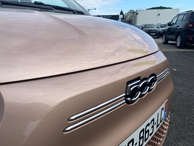 6 HP / ABS - antiblocage des roues avec répartiteur de freinage EBD / Batterie 42 kWh / Câble de recharge Mode 3 / Chargeur embarqué 11 kW (AC) / Coques de rétroviseurs couleur carroserie / Détails chromés : logo 500 sur calandre et logo FIAT sur hayon / Ecran couleur TFT 7" / Frein à main électrique / Pare-chocs peints couleur carrosserie / Recharge rapide 85 kW (DC) / Sellerie Tissu noir + Planche de bord couleur carrosserie / Système d'alerte sonore au piéton / Système U-Connect 10,25" (sans NAV) / Volant avec commandes / Volant noir soft touch