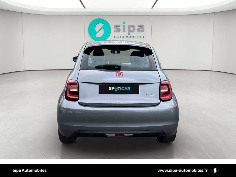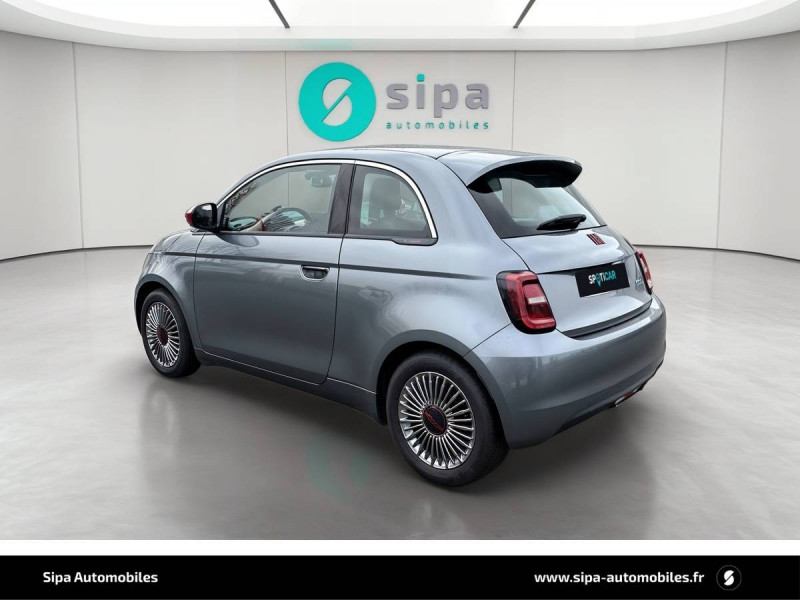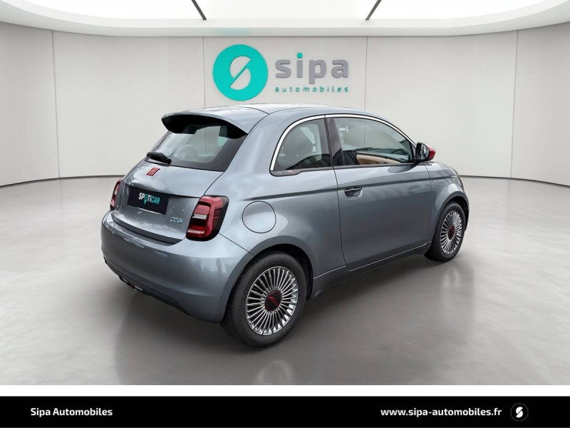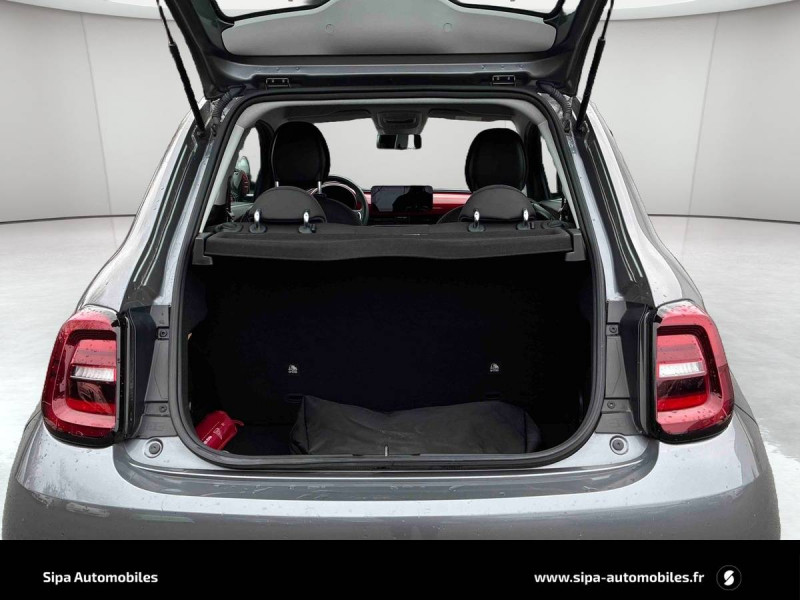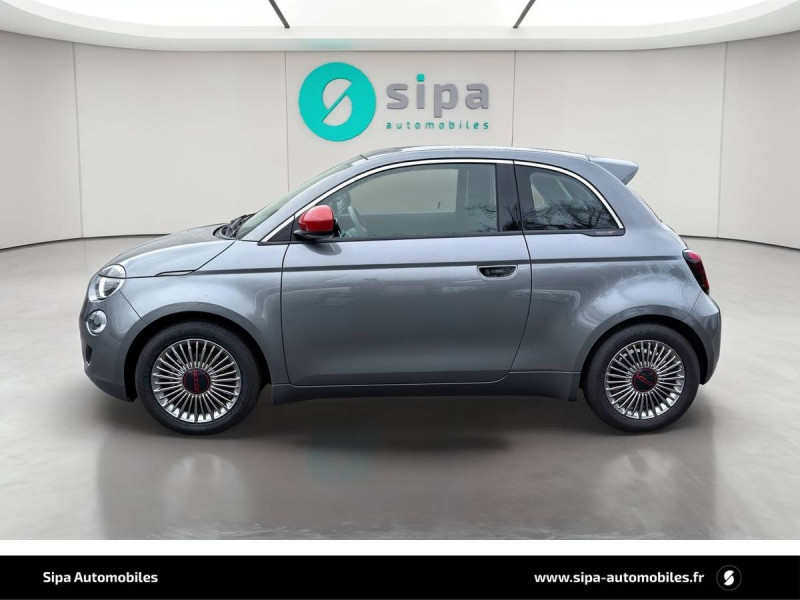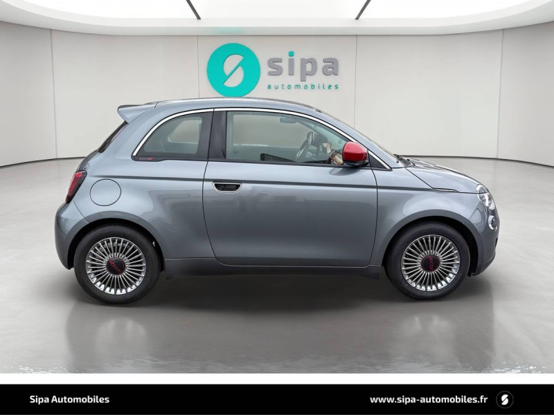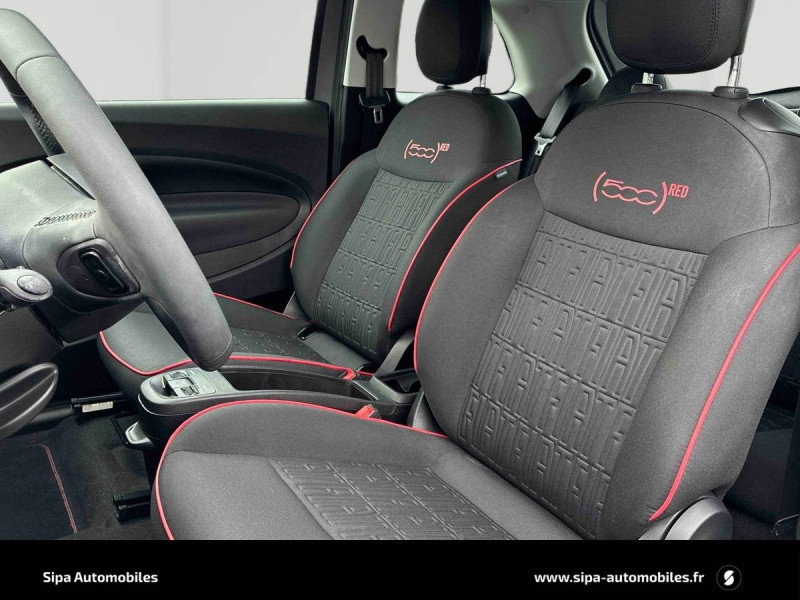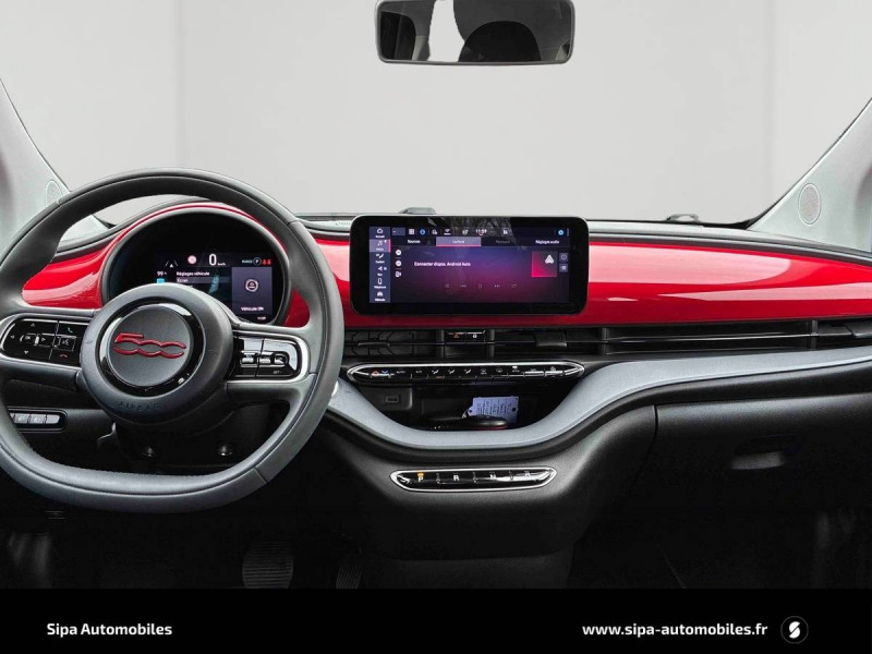 ABS - antiblocage des roues avec répartiteur de freinage EBD / Boîte à gants désinfectante avec lampe UV-C / Câble de recharge Mode 3 / Chargeur embarqué 11 kW triphasé / Contours de vitres chromés / Coques de rétroviseurs extérieurs rouges / Détails chromés : logo 500 sur calandre et logo FIAT rouges sur hayon / ESP - Contrôle électronique de stabilité avec aide au démarrage en côté "Hill Holder" / Freinage autonome d'urgence avec détection de piéton et de cycliste / Frein à main électrique / Kit (RED) :coque de clé, filtre à air, traitement antimicrobien, tapis de sol, distributeur poussoir / Limiteur de vitesse intelligent avec reconnaissance des panneaux / Mopar Connect Box / Pare-chocs peints couleur carrosserie / Poignées de portes dissimulées / Prise charge rapide (50kW) / Sellerie Tissu Seaqual avec monogramme Fiat + Planche de bord rouge / Système d'alerte sonore au piéton / Système d'infodivertissement Uconnect 10,25'? avec navigation / Tapis de sol