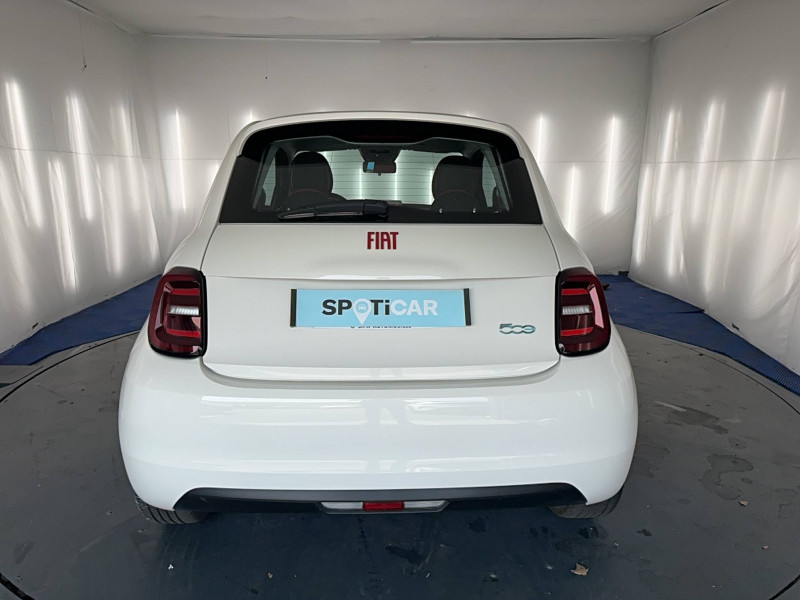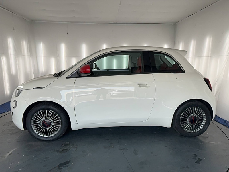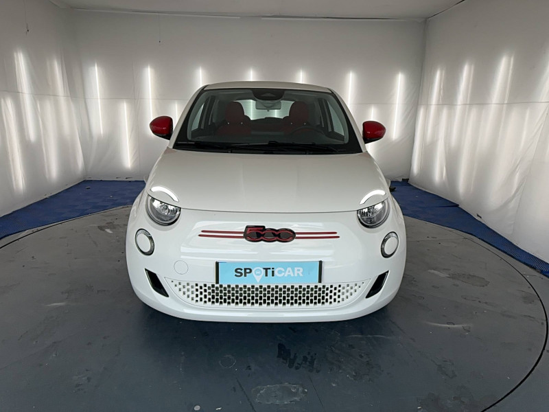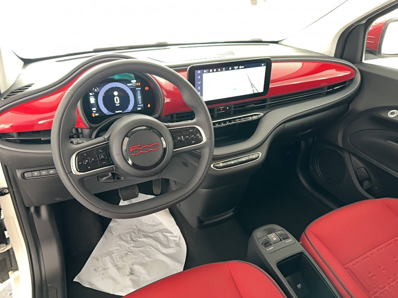 ABS - antiblocage des roues avec répartiteur de freinage EBD / Boîte à gants désinfectante avec lampe UV-C / Câble de recharge Mode 3 / Chargeur embarqué 11 kW triphasé / Contours de vitres chromés / Coques de rétroviseurs extérieurs rouges / Détails chromés : logo 500 sur calandre et logo FIAT rouges sur hayon / ESP - Contrôle électronique de stabilité avec aide au démarrage en côté "Hill Holder" / Freinage autonome d'urgence avec détection de piéton et de cycliste / Frein à main électrique / Kit (RED) :coque de clé, filtre à air, traitement antimicrobien, tapis de sol, distributeur poussoir / Limiteur de vitesse intelligent avec reconnaissance des panneaux / Mopar Connect Box / Pare-chocs peints couleur carrosserie / Poignées de portes dissimulées / Prise charge rapide (50kW) / Sellerie Tissu Seaqual avec monogramme Fiat + Planche de bord rouge / Système d'alerte sonore au piéton / Système d'infodivertissement Uconnect 10,25'? avec navigation / Tapis de sol