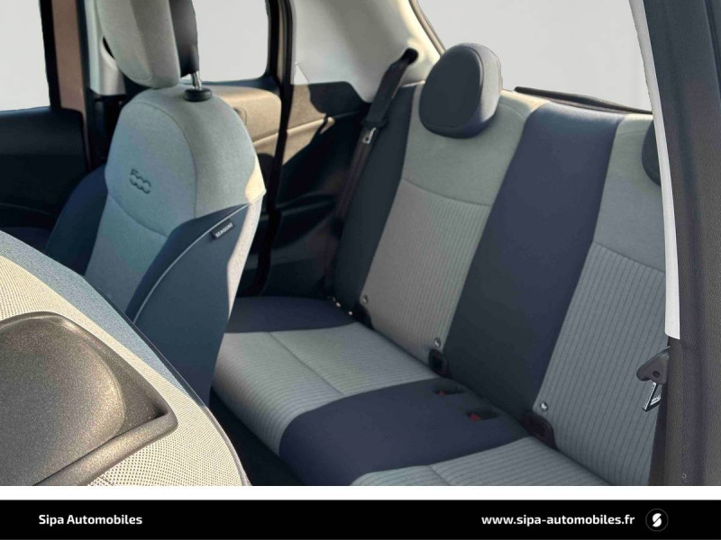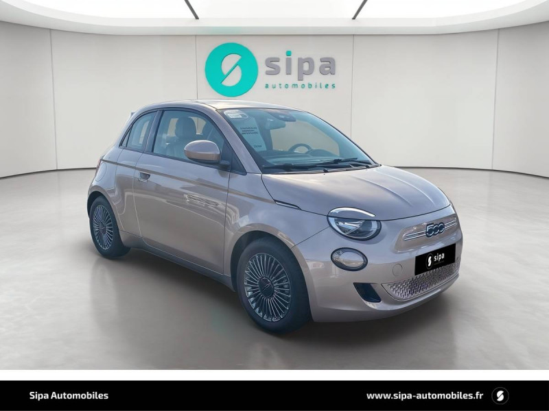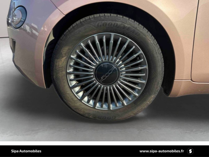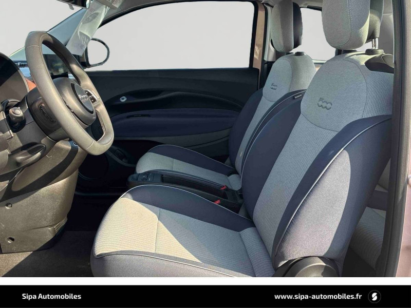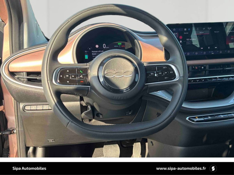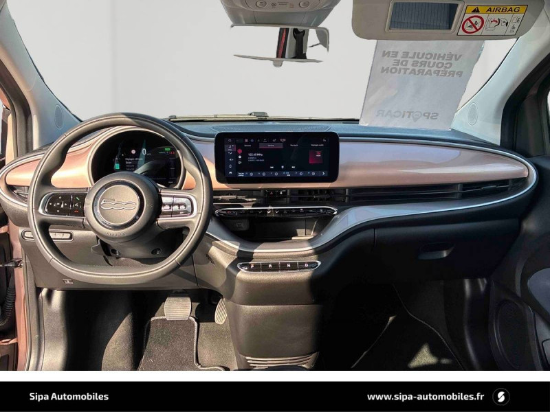 6 HP / ABS - antiblocage des roues avec répartiteur de freinage EBD / Câble de recharge Mode 3 / Chargeur embarqué 11 kW triphasé / Coques de rétroviseurs couleur carroserie / Détails chromés : logo 500 sur calandre et logo FIAT sur hayon / Ecran couleur TFT 7" / ESP - Contrôle électronique de stabilité avec aide au démarrage en côté "Hill Holder" / Freinage autonome d'urgence avec détection de piéton et de cycliste / Frein à main électrique / Limiteur de vitesse intelligent avec reconnaissance des panneaux / Mopar Connect Box / Pare-chocs peints couleur carrosserie / Poignées de portes dissimulées / Prise charge rapide (85kW) / Système d'alerte sonore au piéton / Système d'infodivertissement Uconnect 10,25'? avec navigation / Volant noir soft touch