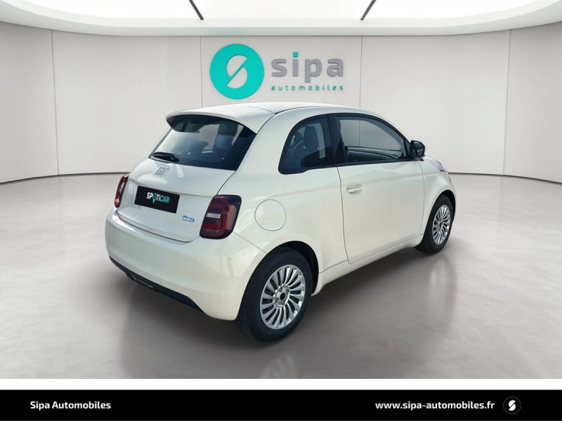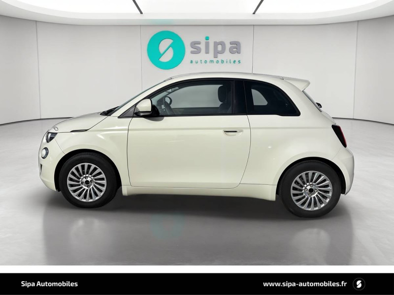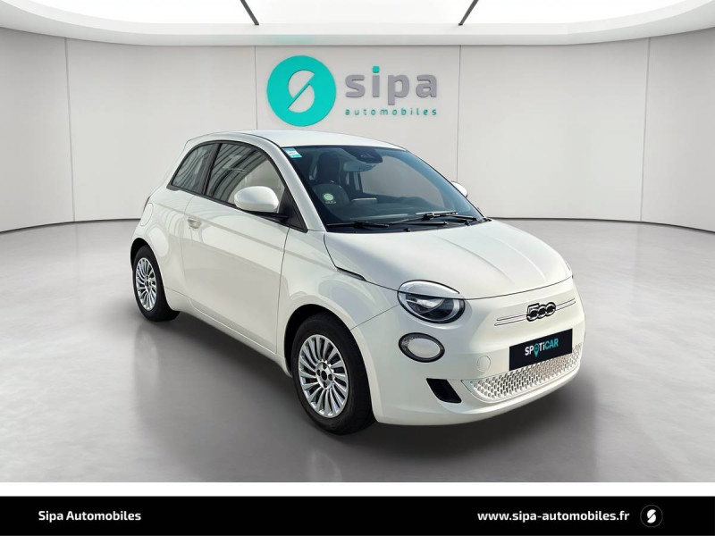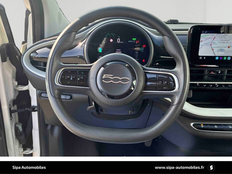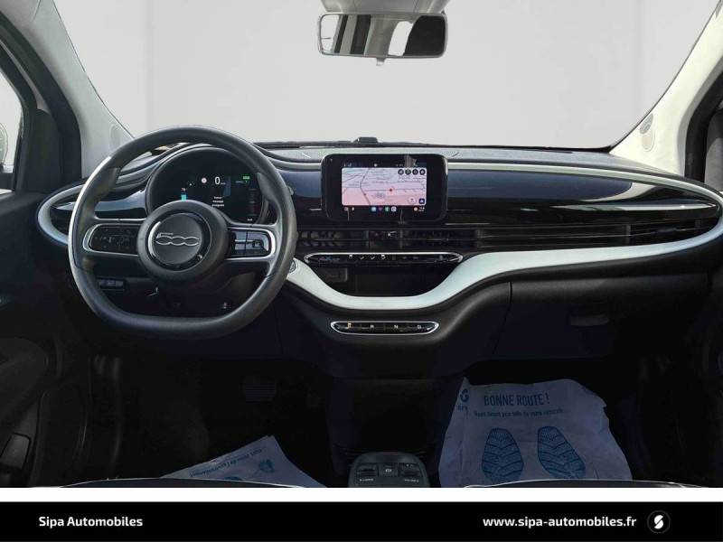 ABS - antiblocage des roues avec répartiteur de freinage EBD / Câble de recharge Mode 3 / Chargeur à induction pour smartphone / Chargeur embarqué 11 kW triphasé / Coques de rétroviseurs couleur carroserie / Détails chromés : logo 500 sur calandre et logo FIAT sur hayon / ESP - Contrôle électronique de stabilité avec aide au démarrage en côté "Hill Holder" / Freinage autonome d'urgence avec détection de piéton et de cycliste / Frein à main électrique / Pack Radio Hiver (Action Plus) / Pare-chocs peints couleur carrosserie / Poignées de portes dissimulées / Prise charge rapide (50kW) / Support smartphone / Système d'alerte sonore au piéton / Volant avec commandes