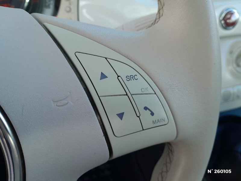 Boucliers couleur carrosserie / Système Blue&Me avec fonction eco:Drive - Bluetooth pour téléphone main libre et connextion USB pour MP3 / ABS et EBD / Air conditionné avec filtre anti-pollen / Commande de l'autoradio au volant et volant gainé en cuir / Poignée de maintien intérieure / Banquette AR rabattable 50/50 et appuie-tête AR / Direction assistée "DualDrive" et fonction "city" / Eclairage du coffre / Kit Chrome / Poignées de portes extérieures chromées / Logo "500" sur la planche de bord / Rangement sous siège AV passager / Contrôle électronique de stabillité ESP avec système "Hill Holder" / Kit fumeur / Rétroviseurs électriques teinte carrosserie et indicateur de temperature extérieure / Toit panoramique fixe avec pare-soleil