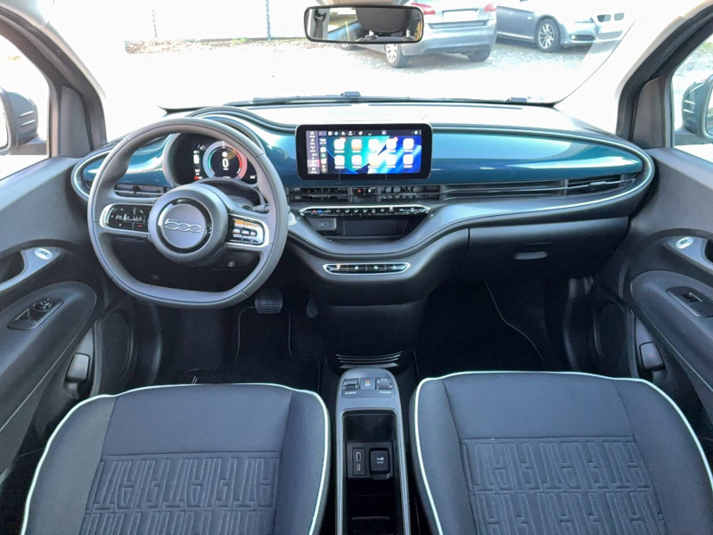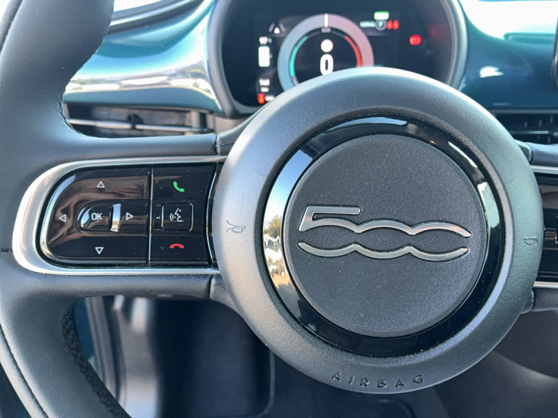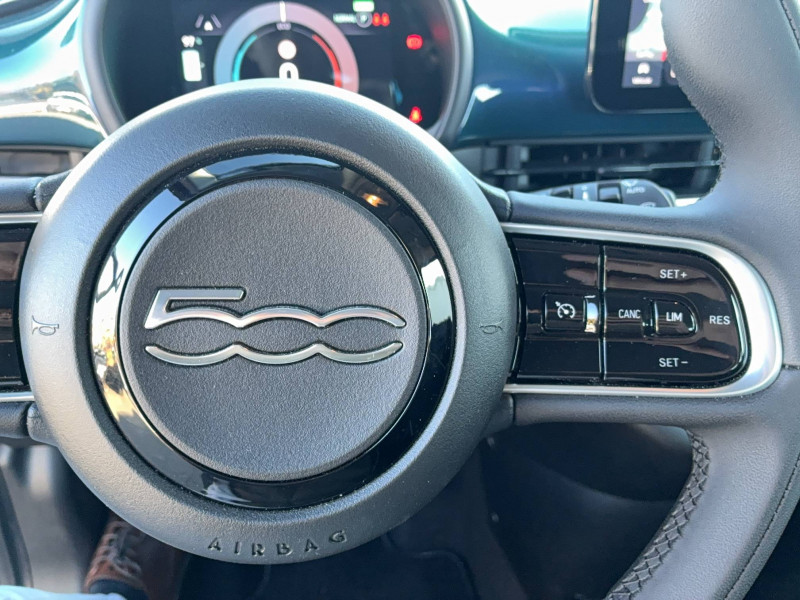 6 HP / ABS - antiblocage des roues avec répartiteur de freinage EBD / "ATTENTION" - Equipements non communiqués / Batterie 23,8 kWh / Boîte de vitesse à fonction Continue / Câble de recharge Mode 2 / Chargeur embarqué 11 kW (AC) / Contrôle de la traction (TCS) / Détails chromés : logo 500 sur calandre et logo FIAT sur hayon / Ecran couleur TFT 7" / Frein à main électrique / Pack Tech - 6 HP - Apple CarPlay & Android Auto sans fil - Caméra de recul - Capteurs de pluie - Chargeur à induction pour smartphone - Climatisation automatique - Détecteur d'angles morts - Port USB type A-C sur tunnel central - Radars de stationnement 360° - Rétroviseurs à réglage électrique dégivrants - Système Uconnect 10,25'' avec navigation / Pare-chocs peints couleur carrosserie / Projecteurs AV full LED "Infinity" / Recharge rapide 50 kW (DC) / Sellerie Tissu noir + Planche de bord couleur carrosserie / Système d'alerte sonore au piéton / Système U-Connect 10,25" (sans NAV) / TPMS / Volant avec commandes / Volant bicolore soft touch