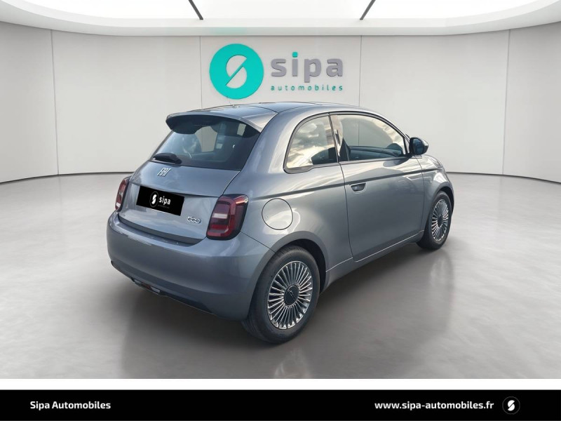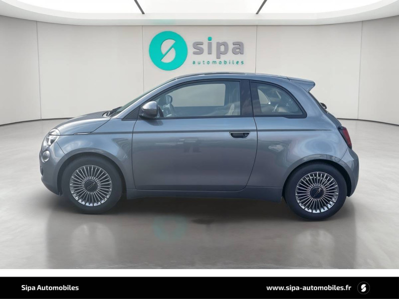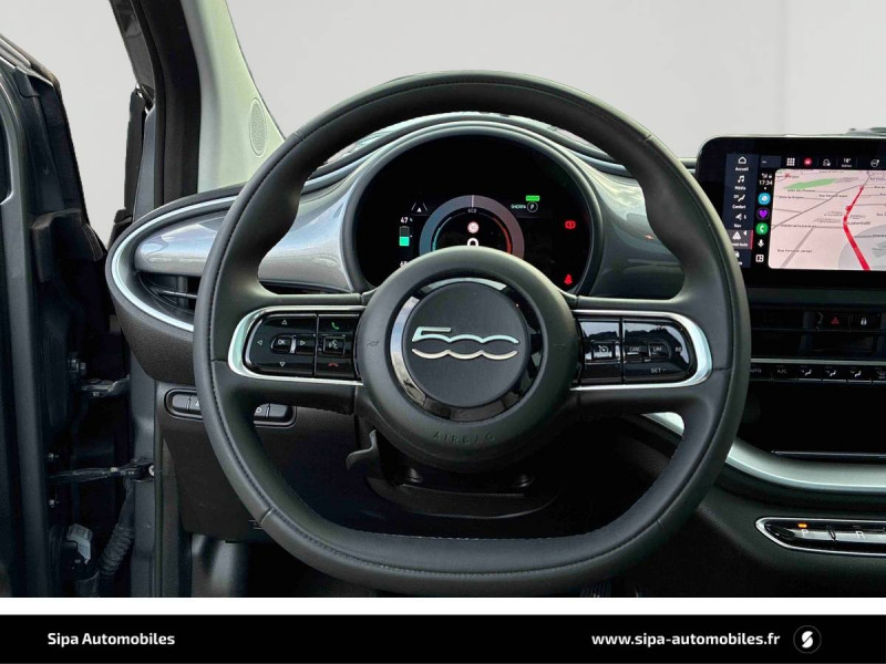 6 HP / ABS - antiblocage des roues avec répartiteur de freinage EBD / Câble de recharge Mode 3 / Chargeur embarqué 11 kW triphasé / Coques de rétroviseurs couleur carroserie / Détails chromés : logo 500 sur calandre et logo FIAT sur hayon / Ecran couleur TFT 7" / ESP - Contrôle électronique de stabilité avec aide au démarrage en côté "Hill Holder" / Freinage autonome d'urgence avec détection de piéton et de cycliste / Frein à main électrique / Limiteur de vitesse intelligent avec reconnaissance des panneaux / Mopar Connect Box / Pare-chocs peints couleur carrosserie / Poignées de portes dissimulées / Prise charge rapide (50kW) / Système d'alerte sonore au piéton / Système d'infodivertissement Uconnect 10,25'? avec navigation / Volant noir soft touch