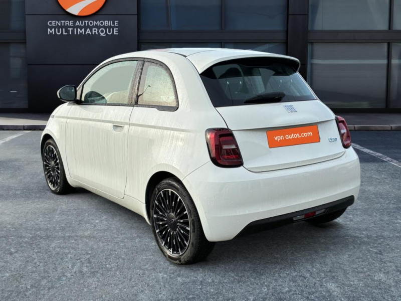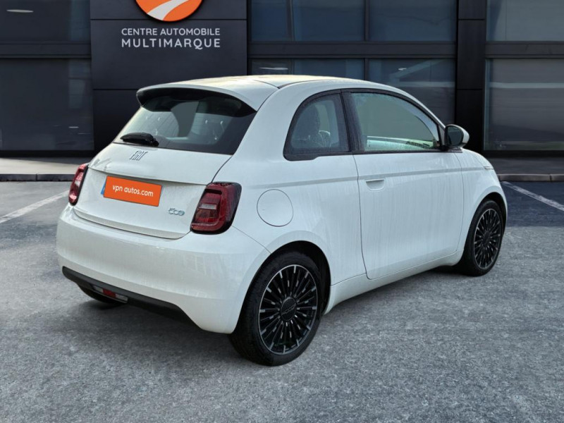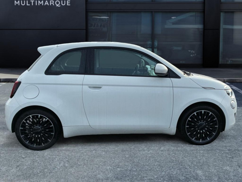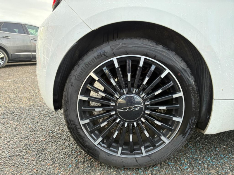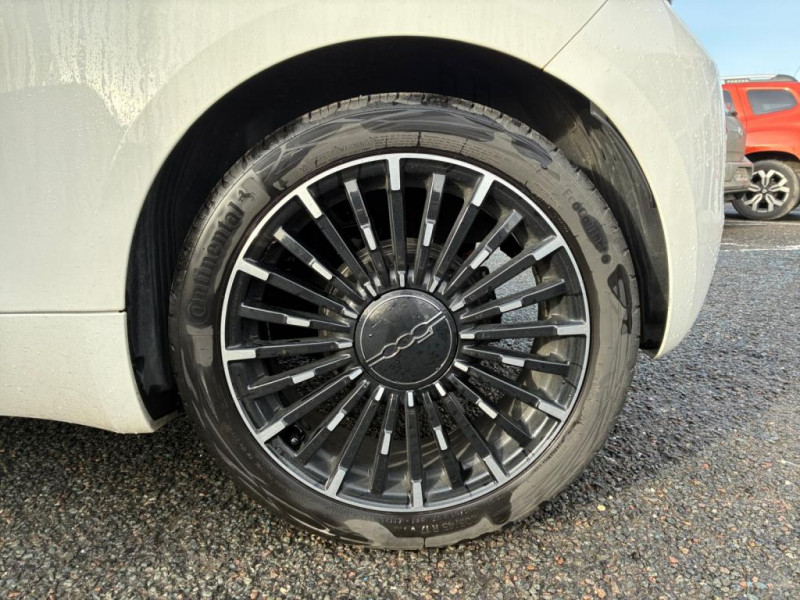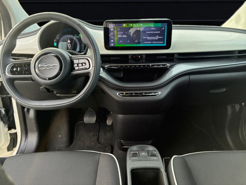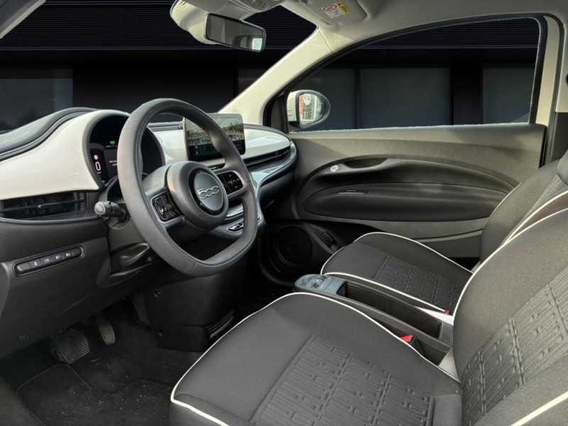 Système Uconnect 10,25? / Batterie urbaine 23,8 kWh / Recharge rapide 50 kW (DC) / Câble de recharge type 2 Mode 3 (recharge Wallbox & bornes publiques) / Chargeur embarqué 11 kW (AC) / Peinture Ice White / 6 haut-parleurs / Frein à main électrique / Freinage d?urgence autonome / Instrumentation TFT couleur 7" / Planche de bord couleur carrosserie / Sellerie Tissu Seaqual Noir avec Monogramme FIAT / Volant Soft-Touch