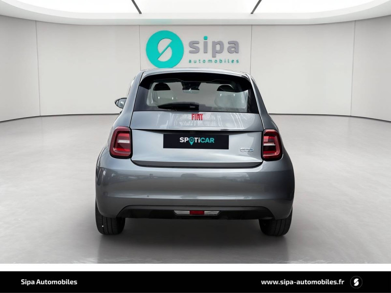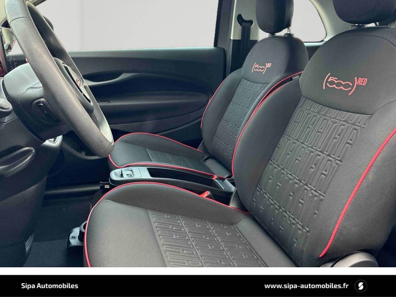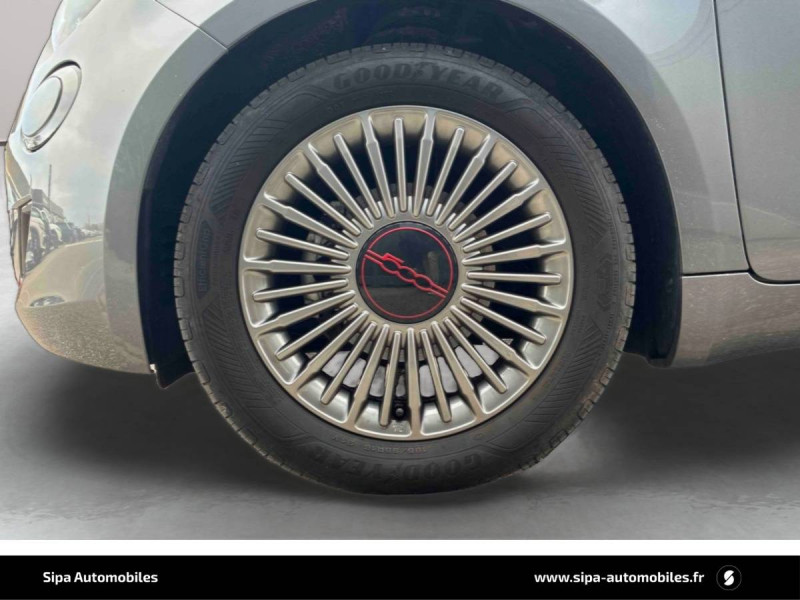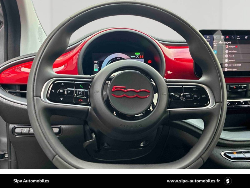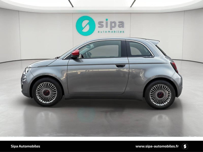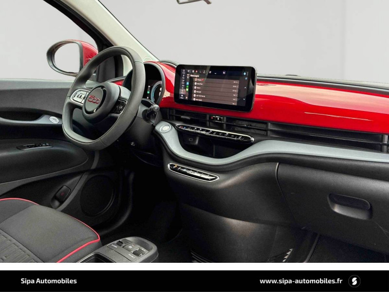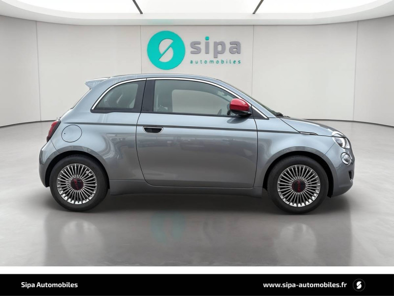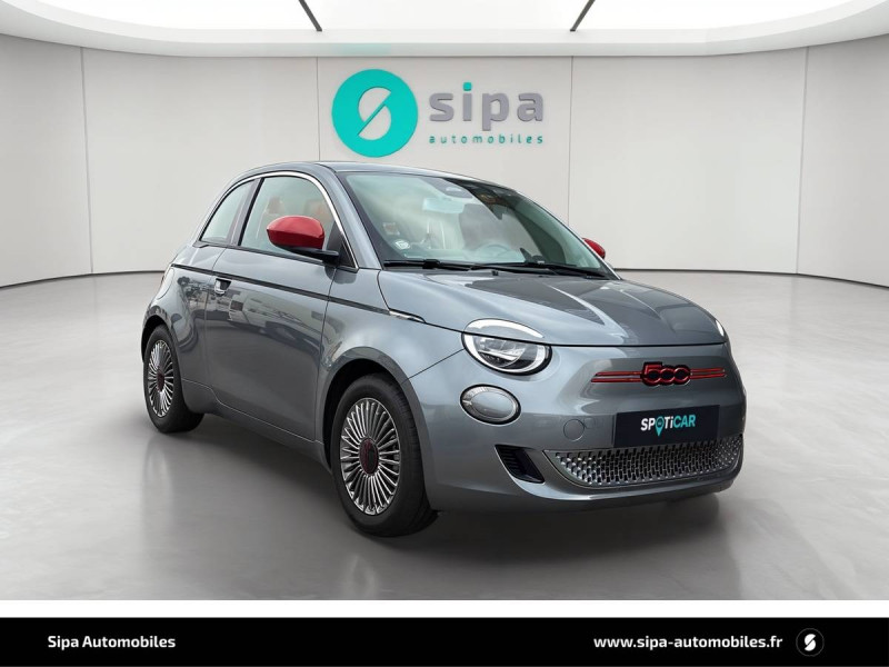ABS - antiblocage des roues avec répartiteur de freinage EBD / Boîte à gants désinfectante avec lampe UV-C / Câble de recharde Mode 3 / Chargeur embarqué 11 kW triphasé / Contours de vitres chromés / Coques de rétroviseurs extérieurs rouges / Détails chromés : logo 500 sur calandre et logo FIAT rouges sur hayon / ESP - Contrôle électronique de stabilité avec aide au démarrage en côté "Hill Holder" / Freinage autonome d'urgence avec détection de piéton et de cycliste / Frein à main électrique / Kit (RED) :coque de clé, filtre à air, traitement antimicrobien, tapis de sol, distributeur poussoir / Limiteur de vitesse intelligent avec reconnaissance des panneaux / Mopar Connect Box / Pare-chocs peints couleur carrosserie / Poignées de portes dissimulées / Prise charge rapide (50kW) / Sellerie Tissu Seaqual avec monogramme Fiat + Planche de bord rouge / Système d'alerte sonore au piéton / Système d'infodivertissement Uconnect 10,25'? avec navigation / Tapis de sol