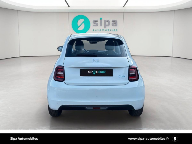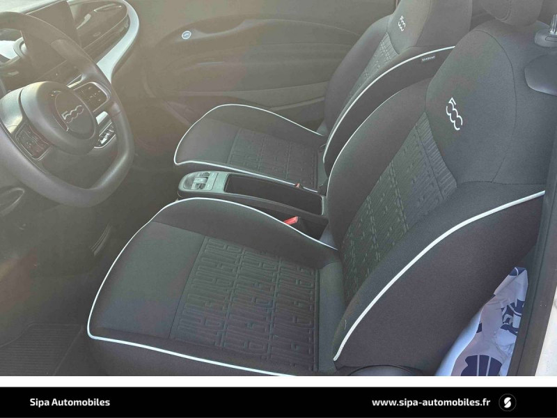 ABS - antiblocage des roues avec répartiteur de freinage EBD / Câble de recharde Mode 3 / Chargeur à induction pour smartphone / Chargeur embarqué 11 kW triphasé / Coques de rétroviseurs couleur carroserie / Détails chromés : logo 500 sur calandre et logo FIAT sur hayon / ESP - Contrôle électronique de stabilité avec aide au démarrage en côté "Hill Holder" / Freinage autonome d'urgence avec détection de piéton et de cycliste / Frein à main électrique / Pack Radio Hiver (Action Plus) / Pare-chocs peints couleur carrosserie / Poignées de portes dissimulées / Prise charge rapide (50kW) / Support smartphone / Système d'alerte sonore au piéton / Volant avec commandes