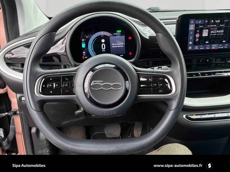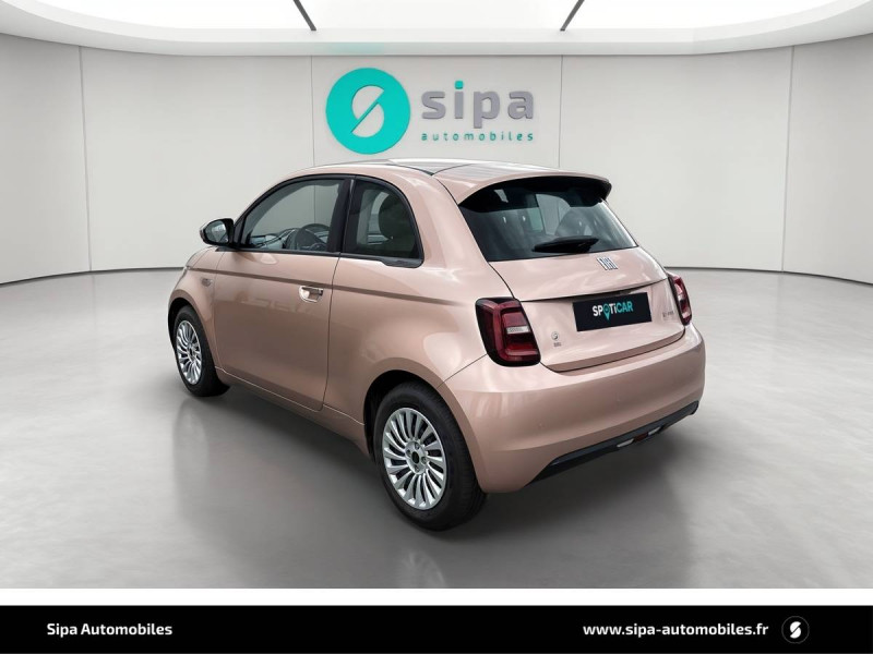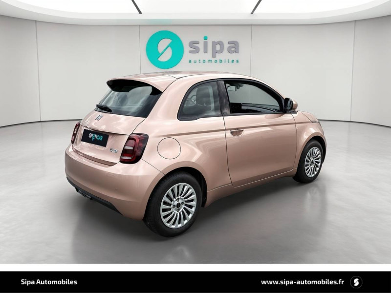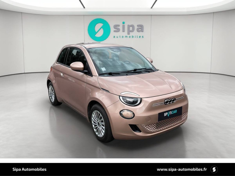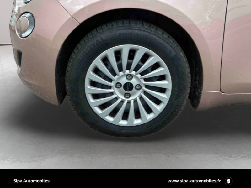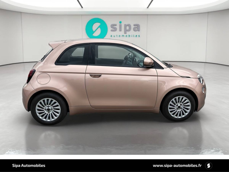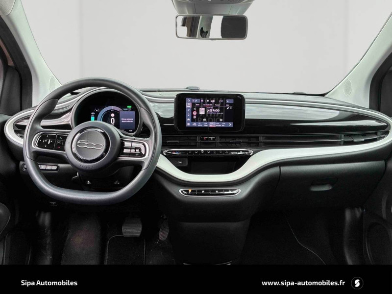 ABS - antiblocage des roues avec répartiteur de freinage EBD / Câble de recharge Mode 3 / Chargeur à induction pour smartphone / Chargeur embarqué 11 kW triphasé / Coques de rétroviseurs couleur carroserie / Détails chromés : logo 500 sur calandre et logo FIAT sur hayon / ESP - Contrôle électronique de stabilité avec aide au démarrage en côté "Hill Holder" / Freinage autonome d'urgence avec détection de piéton et de cycliste / Frein à main électrique / Pack Radio Hiver (Action Plus) / Pare-chocs peints couleur carrosserie / Poignées de portes dissimulées / Prise charge rapide (50kW) / Support smartphone / Système d'alerte sonore au piéton / Volant avec commandes