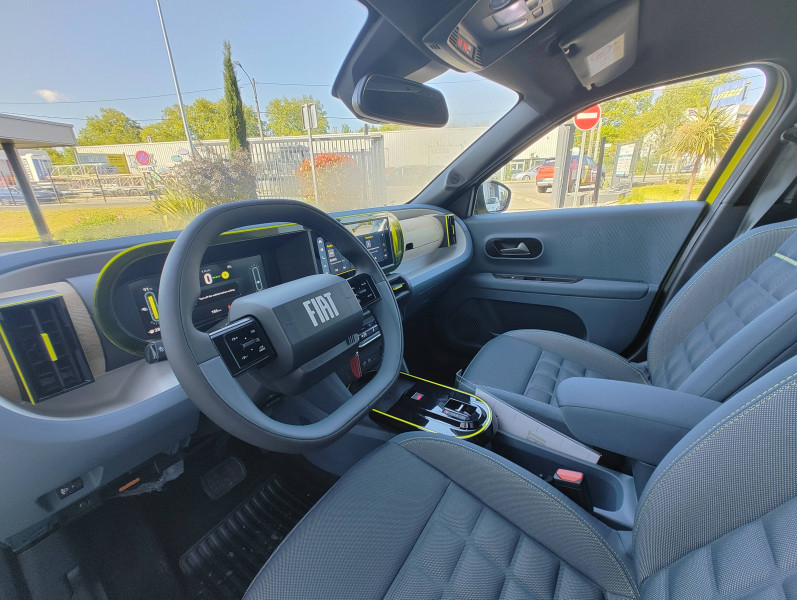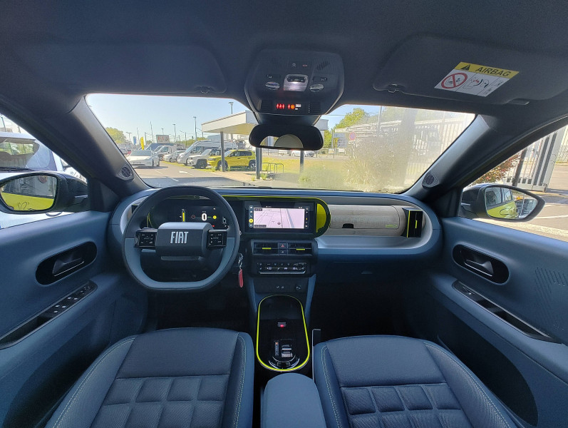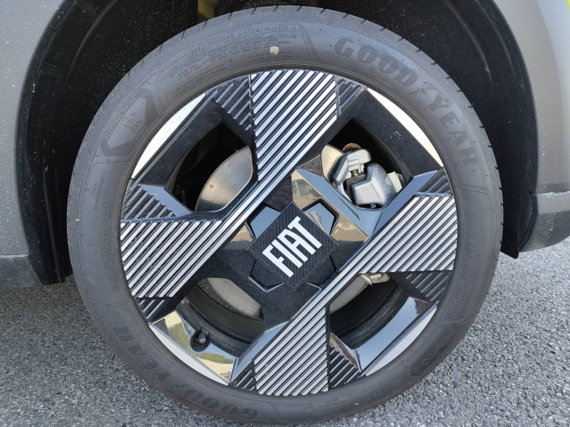 Alerte d'attention du conducteur / Arches de roues avec renfort plastique / Barres de toit longitudinales argentées / Boîte à gants supérieure avec revêtement ''Bambox'' (véritable fibre de bambou) / Boîte de vitesse automatique 1 rapport / Câble de recharge rétractable dans la calandre avant (OBC 7kW) / Casquette AR aérodynamique / Chargeur embarqué 7kW (trappe latérale) / Clé avec télécommande / Combiné d'instrumentation numérique 10" / Connectivité Smartphone Apple CarPlayTM et Android AutoTM sans fil / Contrôle de la traction (TCS) / Coques de rétroviseurs extérieurs noires / Essuie-glaces AV automatiques avec détecteur de pluie / Freinage autonome d'urgence avec détection de piéton et de cycliste / Frein de stationnement électrique / Garnissage des portes en tissu / Liseuses à LED / Planche de bord avec revêtement style / Poignées de portes extérieures noires / Recharge rapide 100kW / Rétroviseur intérieur manuel jour/nuit / Rétroviseur intérieur photochromatique / Sabots argentés AV et AR / Sellerie en tissu La Prima / Système ISOFIX siège AV passager et places latérales banquette AR / Système Uconnect 10,25" Nav / Volant Soft Touch