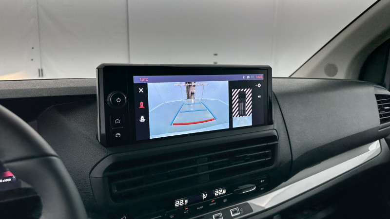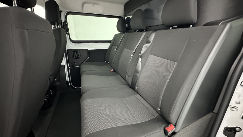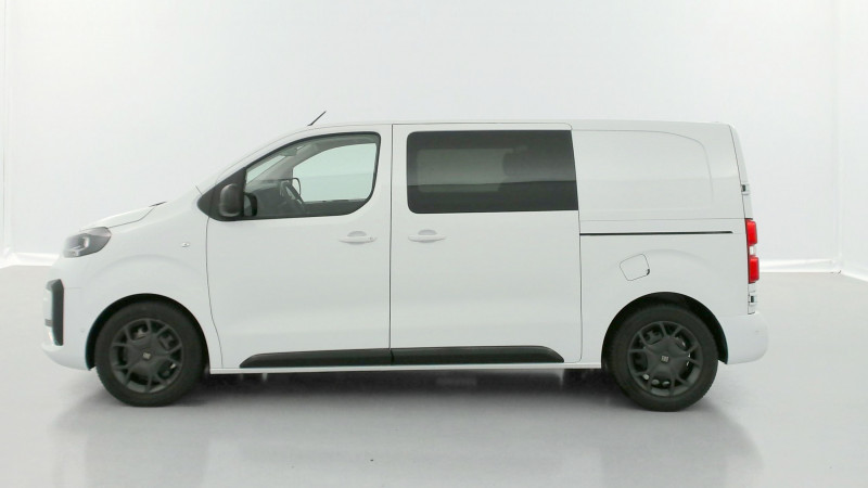 Anneaux d'arrimage (4 en Taille M sur la zone de chargement) / Cloison pleine PVC avec vitre plexiglass / Portes arrière battantes 50/50 tôlées à ouverture à 180° / Revêtement de sol TPO en rangs 1 et 2 / Jantes tôle noires 17'' avec enjoliveur / Pack Look Extérieur / Planche de bord avec décor Liquid Palladium et boîte à gants inférieure et rangement central supérieur fermés / Vitres latérales fixes surteintées en rang 2 / Prise 12V (120W max) dans la zone de chargement / Accès et démarrage mains libres / Combiné numérique 10'' HD couleur / Rétroviseur intérieur prismatique / Ecran tactile 10'' HD avec Navigation 3D connectée, Apple CarPlay® et Android auto? sans fil + 2 prises USB-C / Recharge sans fil pour smartphone / Siège conducteur avec accoudoir et réglage lombaire / Allumage automatique des feux de croisement et des essuie-vitres avant / Banquette fixe 3 places en rang 2 avec zone sous assise droite pour charge longue (accessible par la zone de chargement) / Frein de stationnement électrique / Boitier télématique (appel d'urgence et d'assistance géolocalisés) / Pack Sécurité / Aide au stationnement avant, arrière et latéral + Système de surveillance d'angle mort / Caméra de recul 180° avec affichage sur écran tactile 10'' HD couleur / Système de rétrovision arrière et latérale droite par 2 caméras avec affichage sur rétroviseur intérieur numérique / / Véhicules équivalents: Trafic, Jumpy