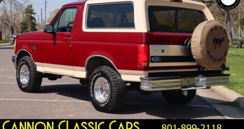 - Marque : Ford - Modèle : Bronco - Année : 1992 - Édition : Eddie Bauer - Couleur extérieure : Rouge - Couleur intérieure : Tan - Type de carrosserie : SUV - Transmission : Automatique à 4 vitesses - Moteur : V8 essence, 5.8L - Kilométrage : 190 216 miles (190 216 km). Provenance : Utah. Disponibilité : environ 7 semaines, clés en main. 29 500 € tout compris (importation, taxes, procédure d'immatriculation). Annonce publiée le 14/12/2025