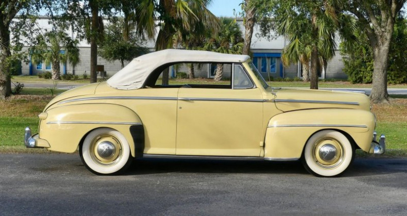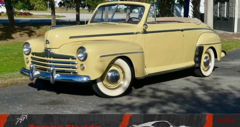 - Année : 1948 - Marque : Ford - Modèle : Super Deluxe Convertible - Kilométrage : 24 859 miles (exempt) - VIN : 199AN56655 - Stock : 1074-TAMPA - Moteur : 221 CID Flathead V8 - Boîte de vitesses : 3-vitesse manuelle - Couleur extérieure : Jaune clair - Couleur intérieure : Brun - Toit : convertible (inopérable, manuellement levable et abaissable). Provenance : Florida. Disponibilité : environ 7 semaines, clés en main. 31 000 € tout compris (importation, taxes, procédure d'immatriculation). Annonce publiée le 05/12/2025