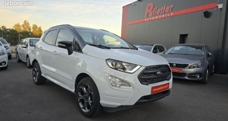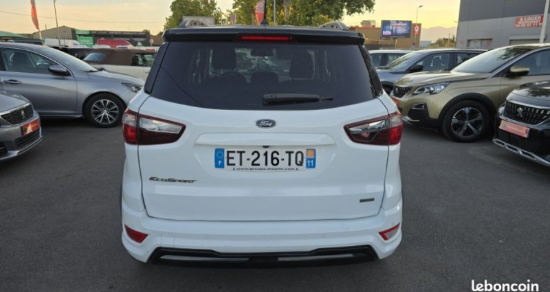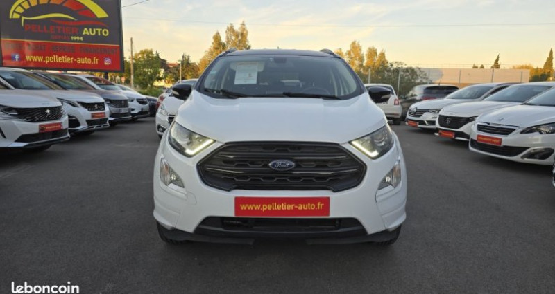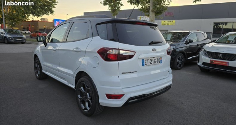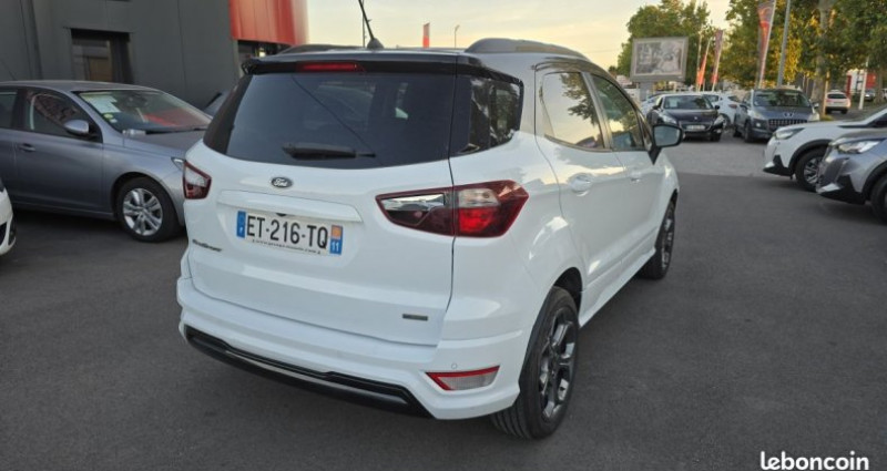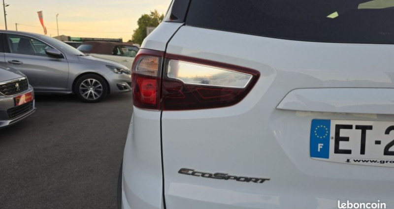 Ford EcoSport 1.0 125 BVM6 ST-Line tout-terrain, blanc, 6 cv, 5 portes, première mise en circulation le 31/01/2018, garantie 3 mois. 5 places OPTIONS ET ÉQUIPEMENTS : Conduite : - allumage automatique des feux - clé mains-libres - régulateur de vitesse - suspension sport Extérieur : - Bavettes de protection - Kit Carrosserie ST-Line - Pare-brise acoustique - Aide au stationnement AR - barres de toit - jantes : alliage - jantes alliage Intérieur : - Air conditionné automatique - Boîte à gants éclairée et réfrigérée - Levier de frein à main en cuir ST-Line - Porte-gobelets sur console centrale - Pédalier Sport - Volant gainé de cuir perforé ST-Line - chauffage stationnaire - direction assistée - ordinateur de bord - prise 12V - siège conducteur réglable en hauteur Pack : - Console centrale avec accoudoir coulissant et porte gobelet - Eclairage d'ambiance intérieur - Entourage des feux noir - Kit de réparation des pneumatiques - Pack Extérieur Noir - Pare-chocs couleur carrosserie - Plancher de coffre ajustable - Plaques de seuil de portes AV avec logo ST-Line - Poignées de portes extérieures couleur carrosserie - Rétroviseurs extérieurs couleur carrosserie électriques - Système MyKey (seconde clé programmable) - Sieges arrières rabattable - appuis-tête arrière - nombre de rapports : 6 vitesses - tapis de sol Sécurité : - Airbags frontaux - Alarme périmétrique - Feux de brouillard AV - latéraux (thorax) et rideaux - Aide au demarrage en pente - ESP - airbag genoux conducteur - airbags frontaux - contrôle pression des pneus Autres équipements et informations : - Calandre noire exclusive ST-Line - Environnement noir - Levier de vitesse spécifique ST-Line - Lèche-vitres noirs - Sellerie cuir/tissu avec surpiqûres ST-Line - Système multimédia Ford SYNC 3 avec navigation - Trappe à carburant EasyFuel - Vitres AV/AR électriques à impulsion haut/bas à l'AV côté conducteur et passager - Classe Crit'air : 1 - Puissance kilowatt : 92 kw - feux de circulation diurne - puissance réelle : 125 ch - émission CO2 : 119 g/km Référence annonce : 118VO010526