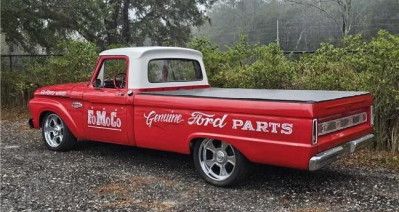 - Marque : Ford - Modèle : F100 - Année : 1965 - Trim level : Custom Cab (top-of-the-line) - Couleur extérieure : Rouge vif - Couleur toit : Blanc - Moteur : 406 CID Stroker V8 - Boîte de vitesses : 3-vitesse automatique - Suspension : Twin-I-Beam indépendante avant - Intérieur : Siège banc noir en cuir, tableau de bord remanié, volant à 3 branches, tachymètre à 11 000 tr/min, coupe-feu, etc.. Provenance : Florida. Disponibilité : environ 7 semaines, clés en main. 29 500 € tout compris (importation, taxes, procédure d'immatriculation). Annonce publiée le 18/12/2025