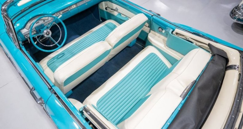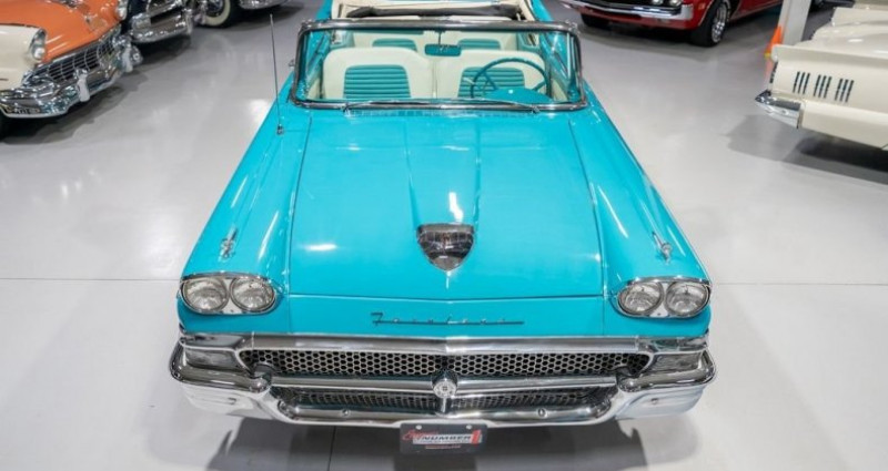 1958 Ford Fairlane 500 Sunliner. Convertible. Body type. Automatic transmission. 390 CID V8 engine. Tri-Power carburetor setup. Rear-wheel drive. Power steering. Power brakes. Dual master cylinder. Modern brake booster. Ivory vinyl power convertible top. Gulfstream Blue exterior. Gulfstream & Colonial White interior. Semi-circular 120 MPH speedometer. Temperature gauge. Fuel gauge. Clock. Town and Country AM radio. Wide whitewall bias-ply tires. Chrome wire wheels with spinner knock-off hubcaps. Refinished exterior. Stainless steel trim. Upgraded exhaust. Original equipment inspection. Indoor showroom. Over 25 years of experience. Consignment and buying programs. Repair services. Various payment methods accepted. No express or implied warranties. Vehicles sold as-is, where-is. Inaccurate prices not honored. Additional fees for title, license, registration, taxes, processing. Shipping charges buyer's responsibility. Auction may end early without notice. Nonrefundable deposit required within 24 hours of winning auction (determined by the Company in its sole discretion). Contact Scott E. at 763-428-7337 for more information and current list of vehicles.. Provenance : Minnesota. Disponibilité : environ 7 semaines, clés en main. 63 500 € tout compris (importation, taxes, procédure d'immatriculation). Annonce publiée le 02/12/2025
