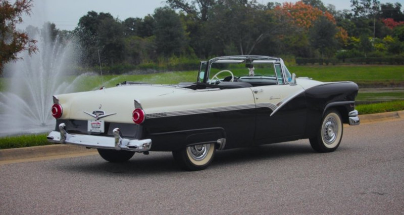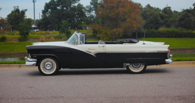 - Marque : Ford - Modèle : Fairlane Sunliner - Année : 1956 - Type de carrosserie : Cabriolet 2 portes - Couleur extérieure : Noir et Blanc - Couleur intérieure : Noir et Blanc - Transmission : Automatique - Boîte de vitesses : 3 vitesses Ford-O-Matic - Moteur : V8 de 292 cm3 - Roues : Pneus blancs large avec jantes en acier - Couverture : Tissu noir, fonctionne correctement - Options : Radio Town and Country, ajustements de vitesse détaillés, accessoires en chrome, volant à direction assistée, travaux récents sur le système de freinage, radiateur, carburateur, réservoir à carburant et pompe à huile de direction, assurant une performance fiable et une tranquillité d'esprit pour le prochain propriétaire.. Provenance : Florida. Disponibilité : environ 7 semaines, clés en main. 53 500 € tout compris (importation, taxes, procédure d'immatriculation). Annonce publiée le 21/12/2025