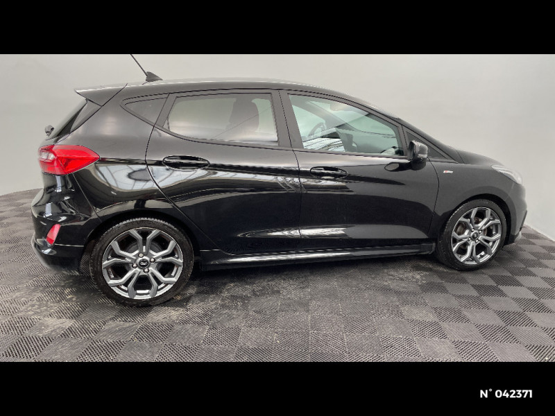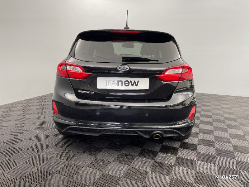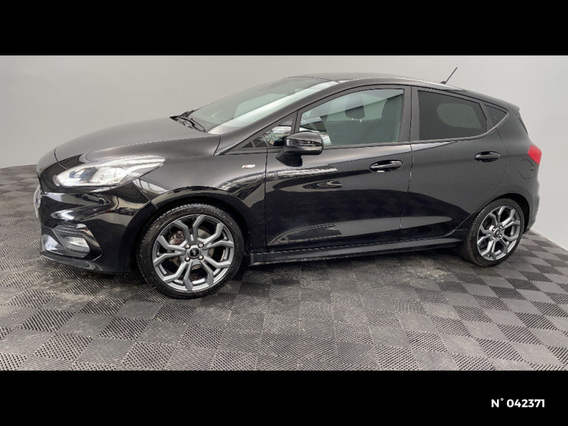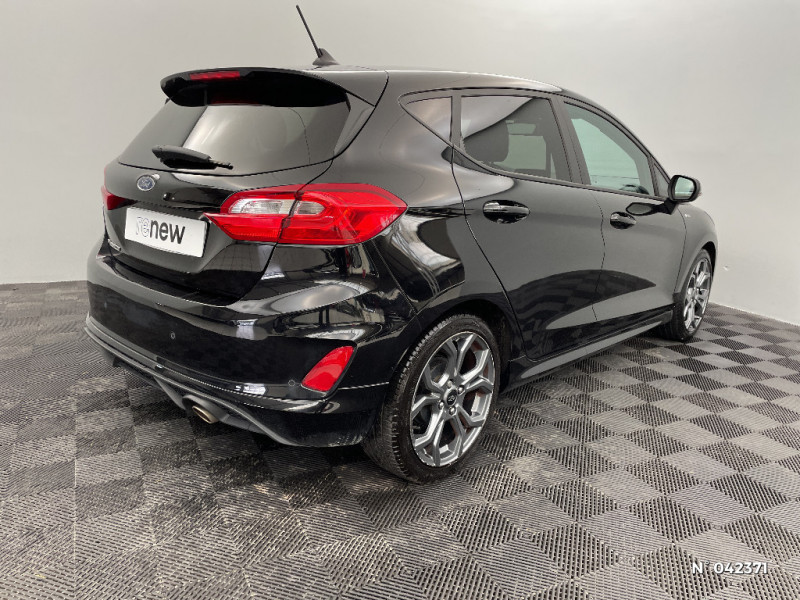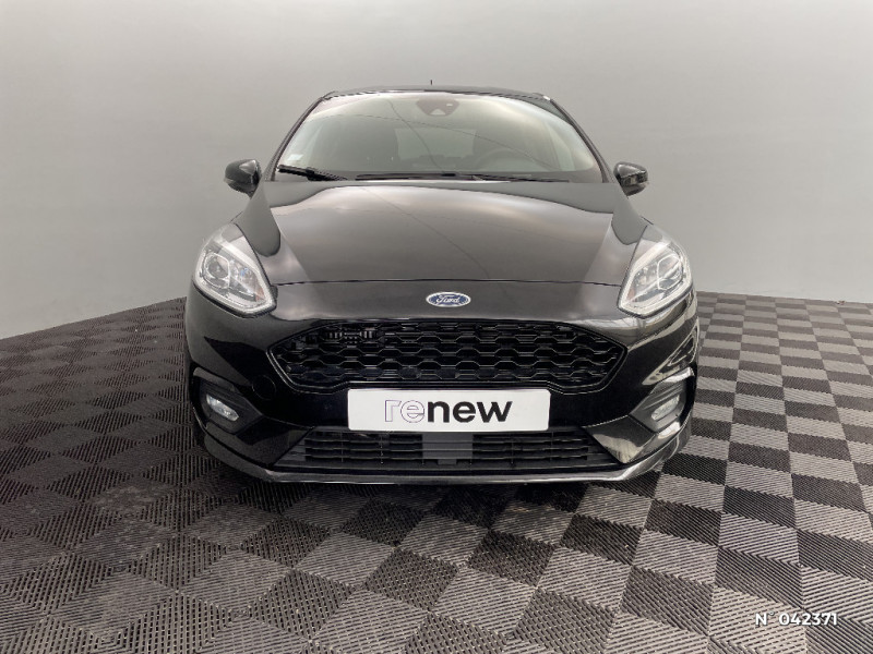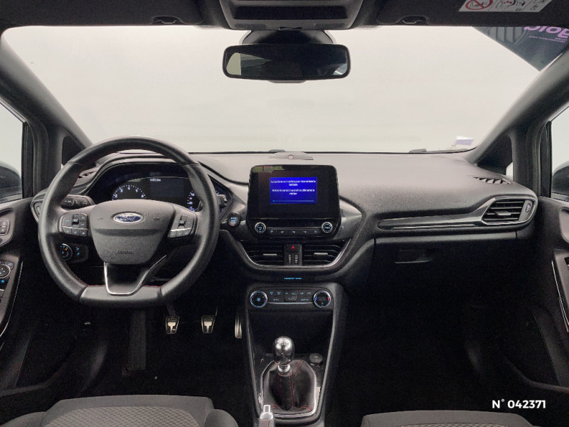 Aide au maintien dans la voie / Pédalier Sport en Aluminium / Ciel de toit noir / Becquet AR couleur carrosserie / Eclairage d'ambiance intérieur / 3ème appui-tête AR / Environnement noir / Badges ST-Line sur les ailes AV / Grille de calandre ST-Line / Tapis de sol ST-Line AV et AR / Volant gainé de cuir à méplat 3 branches ST-Line / Levier de frein à main en cuir / Levier de vitesse spécifique ST-Line / Sellerie tissu noir Court avec renforts latéraux View / Rétroviseurs rabattables électriquement avec éclairage d'approche / Système MyKey (seconde clé programmable) / Kit de réparation des pneumatiques / Poignées de portes couleur carrosserie / Console centrale avec accoudoir et rangements / Trappe Easy Fuel / FordPass Connect avec modem embarqué / Système audio Ford SYNC avec écran tactile 8", 2 ports USB, DAB, compatible AppLink, Apple CarPlay et Android auto / Feux de jour à LED et feux AR à LED / Jantes alliage 17" 5 branches Y ST-Line et pneus 205/45 R17 / Plaques de seuil de porte AV ST-Line / Phares AV avec projecteurs LED / Plaques de seuil de porte ST-Line / Kit de carrosserie / Rétroviseur intérieur électrochrome / Sortie d'echappement chromée / Bouton de démarrage "Ford Power" / Désactivation de l'airbag passager / Suspension Sport