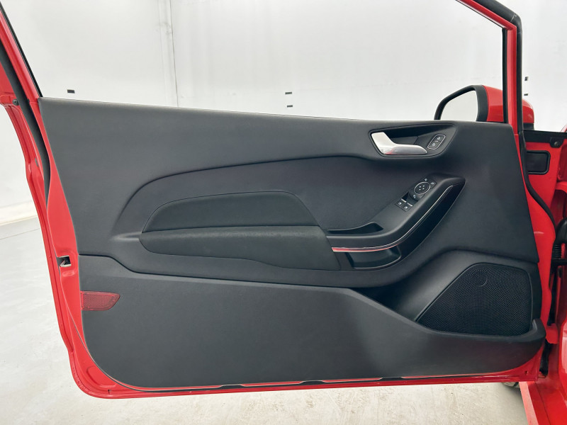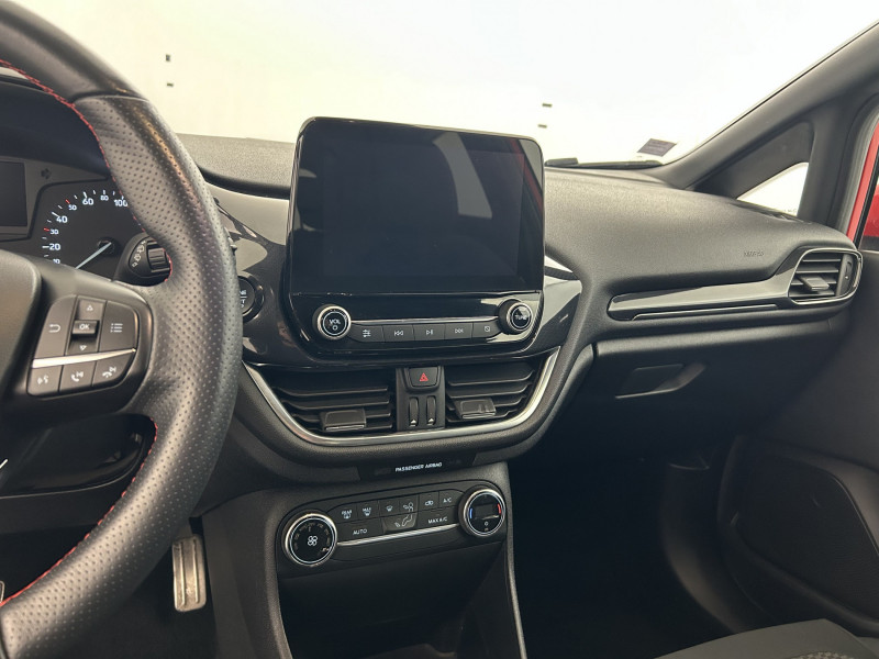 3ème appui-tête AR / Aide au maintien dans la voie / Badges ST-Line sur les ailes AV / Becquet AR couleur carrosserie / Bouton de démarrage "Ford Power" / Console centrale avec accoudoir et rangements / Désactivation de l'airbag passager / Disques de frein AR / Eclairage d'ambiance intérieur / Environnement noir / Feux antibrouillard AV avec fonction éclairage d'angle / Grille de calandre ST-Line / Indicateur de changement de vitesse / Jantes alliage 17" 5 branches Y ST-Line et pneus 205/45 R17 / Kit de réparation des pneumatiques / Levier de frein à main en cuir / Levier de vitesse spécifique ST-Line / Pavillon de toit noir / Pédalier Sport en Aluminium / Poignées de portes couleur carrosserie / Réglage en hauteur et lombaire sièges conducteur et passager / Rétroviseur intérieur électrochrome / Sellerie tissu noir Court avec renforts latéraux View / Seuil de porte ST-Line / Sortie d'echappement chromée / Suspension Sport / Système audio Ford SYNC avec écran tactile 8", 2 ports USB, DAB, compatible AppLink, Apple CarPlay et Android auto / Système KeyFree avec ouverture et démarrage sans clé / Système MyKey (seconde clé programmable) / Tapis de sol ST-Line AV et AR / Trappe Easy Fuel / Volant gainé de cuir à méplat 3 branches ST-Line / Kit de carrosserie /
