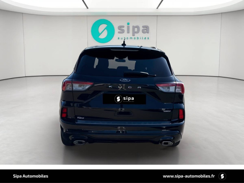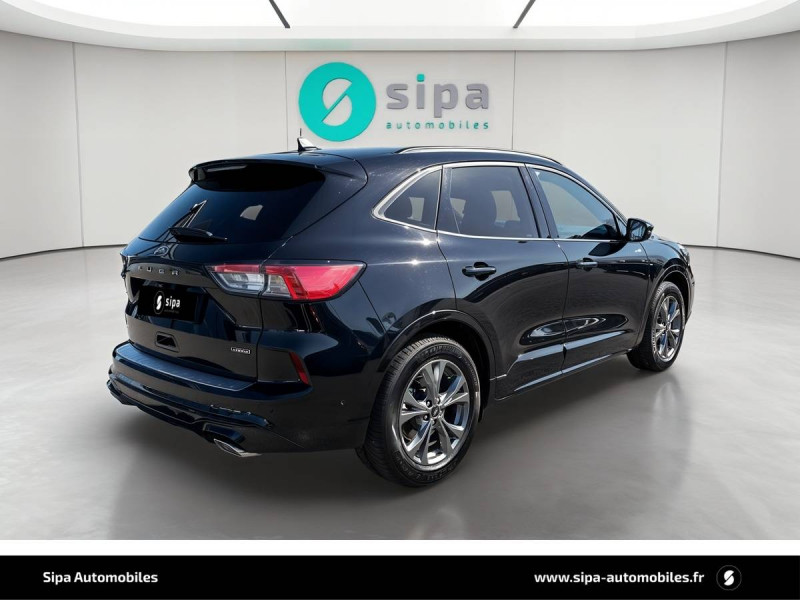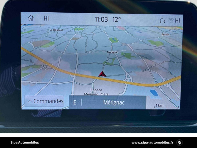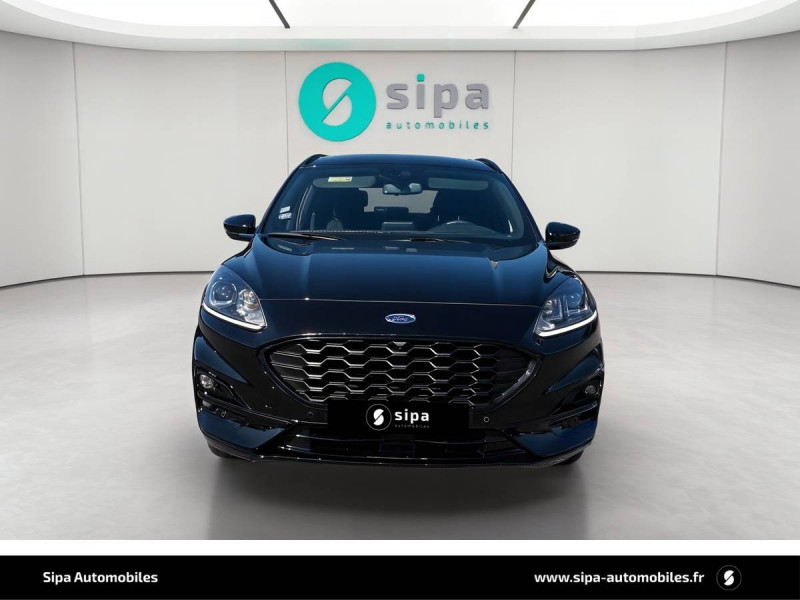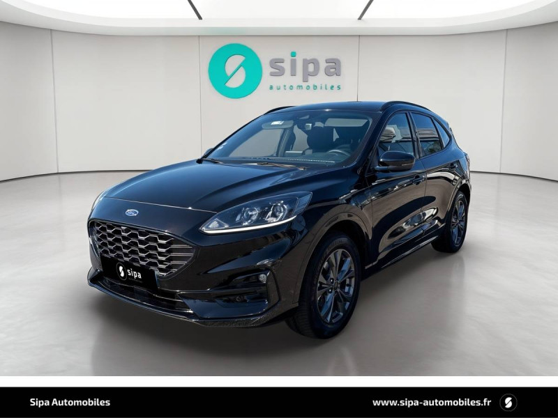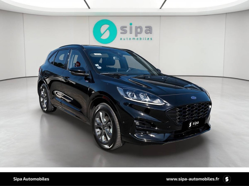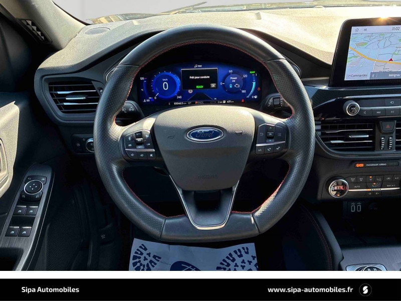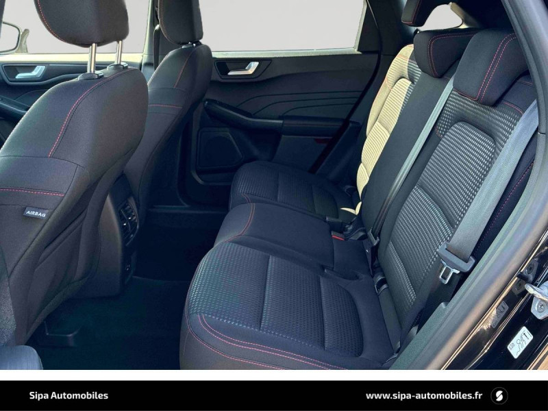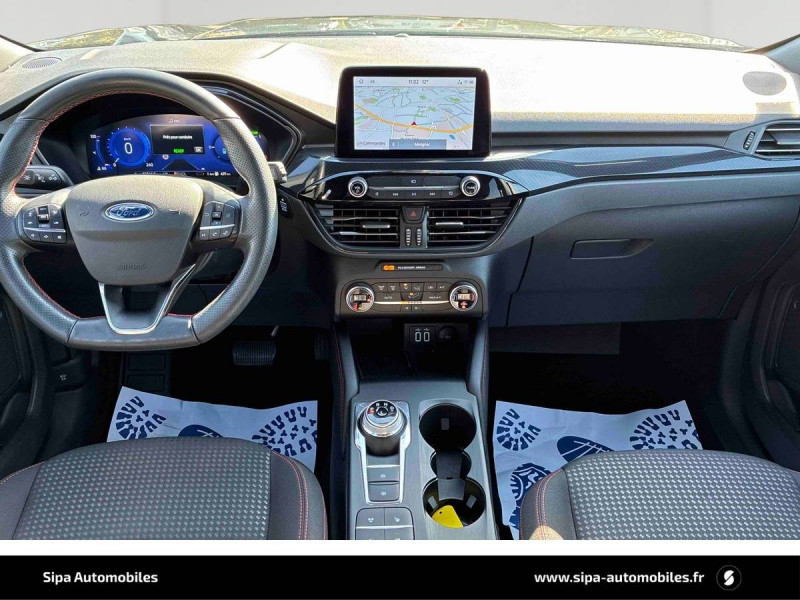 3ème appui-tête AR / 4 Modes d'alimentation sélectionnables (auto, now, later, charge) / Badge ST-Line / Banquette AR coulissante rabattable (60/40) / Becquet AR couleur carrosserie / Bouton de démarrage "Ford Power" / Caméra AR 180° / Combiné d'instrumentalisation numérique 12.3" avec Ecomode / Console centrale avec accoudoir avec 2 prises USB / Contours de vitres noirs / Correcteur électronique de trajectoire (ESP) avec optimisation du freinage électronique / Désactivation de l'airbag passager / Déverrouillage électrique du hayon / Disques de frein AR / Double sortie d'échappement ST-Line / Eclairage compartiment coffre / Eclairage d'ambiance intérieur / Environnement noir / FordPass Connect avec modem embarqué 4 et fonction eCall / Frein de stationnement électrique / Grille de calandre ST-Line / Jantes alliage 18" 5x2 branches finition St-Line avec pneus 225/60 R18 / Kit Carrosserie ST-Line / Kit de réparation des pneumatiques / Logo ST-Line sur les ailes gauche et droite / Plancher de coffre ajustable / Prise 12V dans le coffre / Rétroviseur intérieur électrochrome / Rétroviseurs extérieurs couleur carrosserie électriques, chauffants et rabattables avec éclairage d'approche / Sécurité enfant (verrouillage manuel des portes AR) / Sellerie tissu noir Foundry avec renforts latéraux Eton / Siège conducteur réglable en hauteur avec soutien lombaire (8 positions) / Siège passager réglable en hauteur avec soutien lombaire (8 positions) / Suspension ST-Line / Système audio bi-tuner AM/FM Ford SYNC4, avec écran tactile 8", DAB, commandes vocales, 2 ports USB, compatible AppLink, Apple CarPlay et Android auto, 6 HP / Système d'avertissement acoustique (AVAS - Alerte sonore pour piétons) / Système de navigation Europe et points d'intérêts Michelin et ZFE / Système KeyFree avec ouverture et démarrage sans clé / Système MyKey (seconde clé programmable) / Tapis de sol AV et AR ST-Line avec surpiqûres rouges / Trappe Easy Fuel / Volant à méplat 3 branches Sensico ST-Line avec surpiqûres rouges