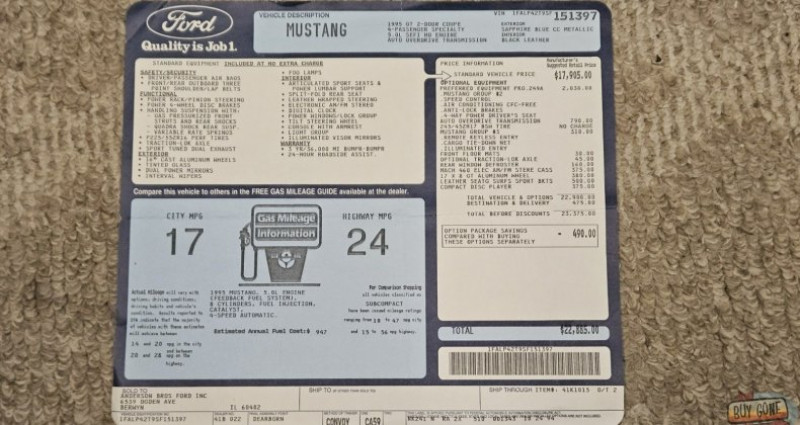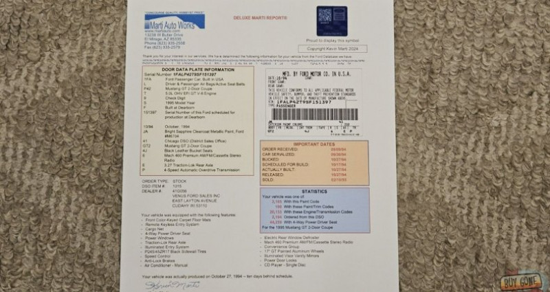Ce véhicule est un Ford Mustang GT de 1995 de couleur Sapphire Blue Metallic, qui a été conservé dans un garage climatisé depuis la première journée en 1995, et n'a été conduit que 41 543 miles depuis sa fabrication. Il est en état original et est totalement chargé de toutes les options disponibles à l'époque. Le rapport Marti inclus montre que ce Mustang GT est un des 190 exemplaires produits cette année-là et peint en Sapphire Blue Metallic, soit 1 sur plus de 185 000 Mustangs fabriqués en 1995. Il dispose d'une immense documentation et de toutes les options, y compris un système audio Mach 460 coûteux. La carrosserie a subi un certain nombre de réparations pour améliorer sa qualité et a été recouverte d'une coature CarPro CQuartz UK 3.0 qui confère une brillance et une hydrophobie exceptionnelles à la voiture. L'intérieur est impeccable, étant dans un état presque neuf, et il n'a jamais été fumé ni utilisé dans le coffre arrière. La voiture est disponible dans l'état actuel, avec quelques réparations nécessaires pour la rendre une conduite fiable quotidienne. Il est recommandé de consulter toutes les photos et vidéos de l'objet pour apprécier sa beauté.. Ce descriptif est basé sur les éléments communiqués par le propriétaire avec un traitement assisté. Merci pour votre indulgence en cas de formulation perfectible. Provenance : Wisconsin. Disponibilité : 7 semaines, clés en main. 19 500 € tout compris (importation, taxes, procédure d'immatriculation). Annonce publiée le 05/10/2025