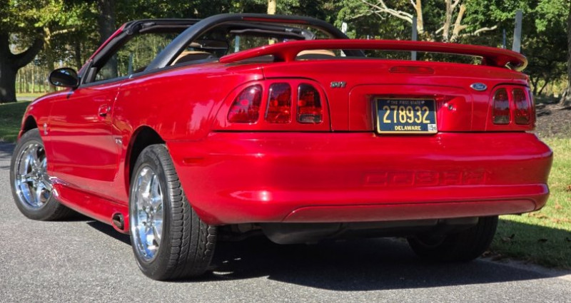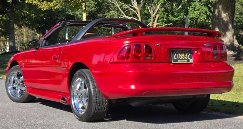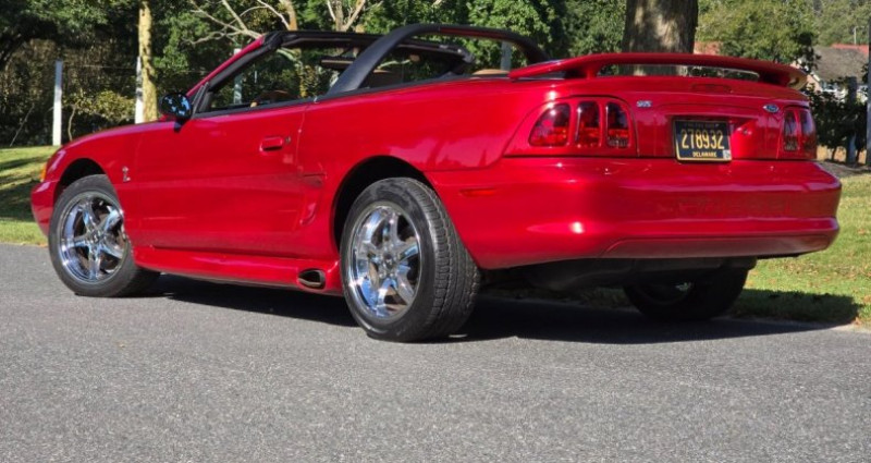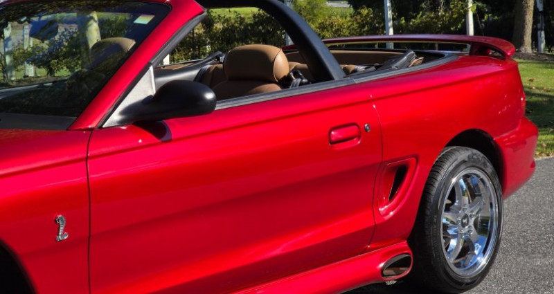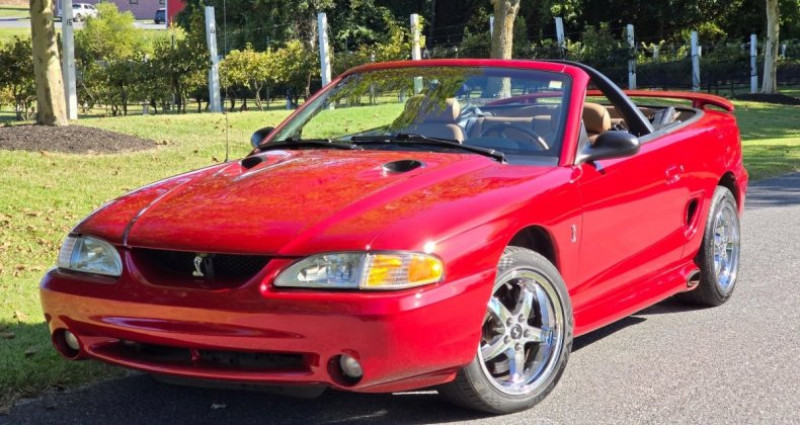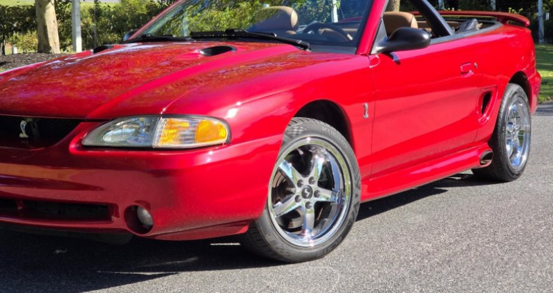 Cet exemplaire de Ford Mustang SVT Cobra cabriolet de 1996 a accumulé 28 000 miles et est équipé d'un V8 de 4, 6 litres associé à une boîte de vitesses manuelle à cinq rapports Tremec TKX, installée en août 2023. L'automobile est peinte en rouge avec des sièges en cuir Saddle et présente diverses modifications, telles qu'un kit de frein RAM HDX, un palier court d'embrayage HMS et une installation d'échappement aftermarket avec des silencieux Dynomax Super Turbo et des sorties de décharges latérales. D'autres équipements comprennent un différentiel à glissement limité, un toit mou en cuir brun, un spoiler arrière, un appui-tête, des roues de 17 pouces à cinq branches et un système sonore Mach. L'acquéreur actuel l'a acquis en 2021 et il est maintenant proposé en vente avec un Certificat d'Authenticité SVT Ford, l'manuel d'utilisateur, les fiches de service et un rapport Carfax propre. Lors de la fabrication, le SVT Cobra était équipé de marques Cobra sur les couvercles des phares et d'une plaque d'embrayage revue. La voiture a été terminée à partir de la factory en Laser Red Tinted Clearcoat (E9) et a été repaint en juin 2022. Les détails extérieurs comprennent un toit mou en cuir brun rétractable électriquement ainsi qu'un appui-tête, des projecteurs de brouillard, des ventilateurs de capot, un spoiler arrière, deux sorties d'échappement par les bas de la carrosserie. Le toit est taché, et des photographies rapprochées de l'état du toit sont présentées dans la galerie ci-dessous. Les roues de 17 pouces à cinq branches sont montées avec des pneus Kumho, et la freinage est assuré par des freins à disque anti-verrouillage de quatre roues avec des freins avant de marque Cobra. L'habitacle présente des sièges à dossier articulé en cuir Saddle ainsi qu'un tableau de bord et des panneaux de portes et de sol coordonnés en cuir Saddle. Les équipements intérieurs comprennent un palier court d'embrayage HMS, des coussins gonflables avant, un système sonore Mach, un lecteur de disques compact, un contrôle de vitesse, un système climatisation, des fenêtres électriques et des portes verrouillables électriquement. Le siège du conducteur est usé. Le volant à quatre branches en cuir entouré d'un revêtement en cuir comprend un cadran de vitesse allant jusqu'à 160 mph et un cadran de tachymètre avec une limite de 6 800 tr/min, ainsi que des indicateurs pour la température du liquide de refroidissement, la tension électrique, la pression d'huile et le niveau de carburant. Le compteur à six chiffres indique 28 000 miles, environ 3 000 miles étant ajoutés sous l' ownership actuel. Le V8 de 4, 6 litres possède une injection électronique et a été classé à 305 chevaux de puissance de usine et 300 lb-ft de couple. L'entretien préparatoire à la vente a inclus un changement d'huile. Le moteur de vitesses à cinq rapports Borg-Warner T45 a été installé de factory, et a été remplacé par une boîte de vitesses manuelle à cinq rapports Tremec TKX en août 2023. Le bloc de boîte de vitesses a été changé en une unité en aluminium à cette époque et ont également été installés un kit de cliquetages de frein RAM HDX, un kit de plancher de boîte de vitesses, un kit de quadrant de courroie de cliquetage et un kit de planche de feu et remplacé le montant de la boîte de vitesses. La voiture possède un différentiel à glissement limité Traction-Lok et l'échappement aftermarket utilise des silencieux Dynomax Super Turbo. Le Certificat d'Authenticité SVT Ford mentionne une date de construction du 23 avril 1996 ainsi que des statistiques de production.. Ce descriptif est basé sur les éléments communiqués par le propriétaire avec un traitement assisté. Merci pour votre indulgence en cas de formulation perfectible. Provenance : Delaware. Disponibilité : 7 semaines, clés en main. 26 500 € tout compris (importation, taxes, procédure d'immatriculation). Annonce publiée le 14/10/2025