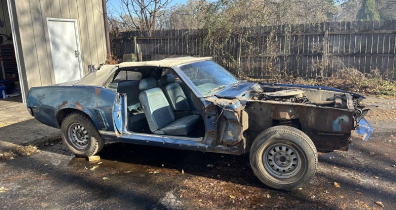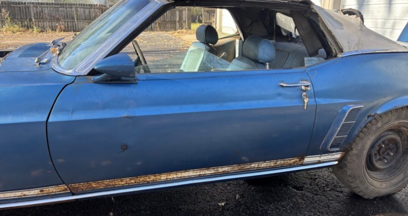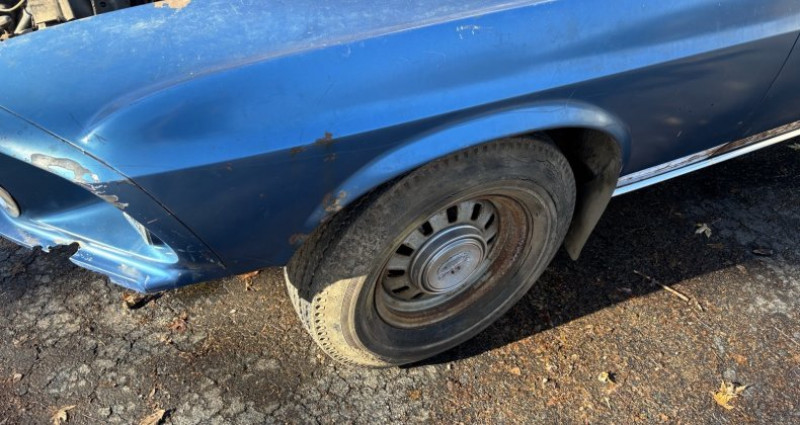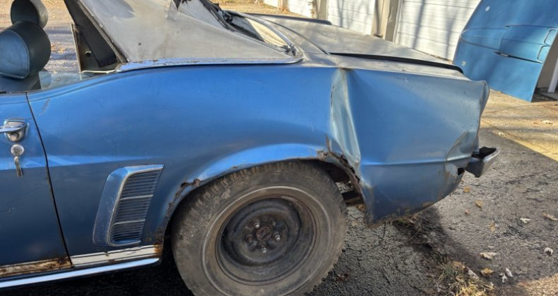 Ce 1969 Ford Mustang GT convertible possède un moteur de 390 ci et une transmission à 4 vitesses. L'état général du véhicule est usé : il a subi des impacts à l'arrière et au panneau droit, qui ont entraîné des déformations du pare-choc passager, du panneau de portière et du support du hingue. Les éléments manquants comprennent le panneau de la calandre, la porte passagère, les feux arrière, le panneau avant et le panneau arrière. La tôle du toit semble souffrir de quelques déformations, et il semble que les supports du toit convertible soient déformés. Les tambours de frein ont été retirés, ce qui permet au véhicule de rouler. L'actuel kilométrage indique 55 000 miles, mais il est possible qu'il ait été tourné. Le moteur ne fonctionne pas actuellement. Le VIN est 9F03S, ce qui indique une production en 1969 à la usine Dearborn, une version à 2 portes convertible et un moteur 390. Le code de transmission est 5 pour une transmission manuelle à 4 vitesses. L'état des sièges est acceptable, avec le code de couleur de la peau de bétail 2b pour des sièges de couleur bleu Clair Corinthien vinyle et bleu Kiwi grain vinyle. La plupart des parties manquantes peuvent être remplacées, mais les parties les plus importantes, telles que les pare-chocs, les freins et la carrosserie, nécessitent des travaux importants pour être restaurées.. Ce descriptif est basé sur les éléments communiqués par le propriétaire avec un traitement assisté. Merci pour votre indulgence en cas de formulation perfectible. Provenance : Illinois. Disponibilité : 7 semaines, clés en main. 18 000 € tout compris (importation, taxes, procédure d'immatriculation). Annonce publiée le 15/11/2025