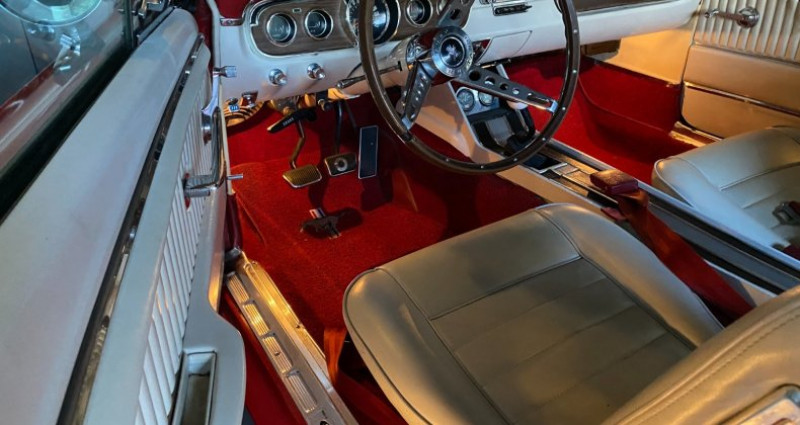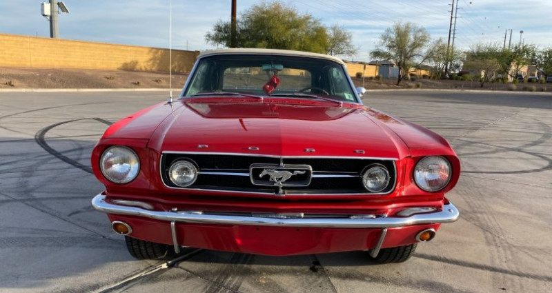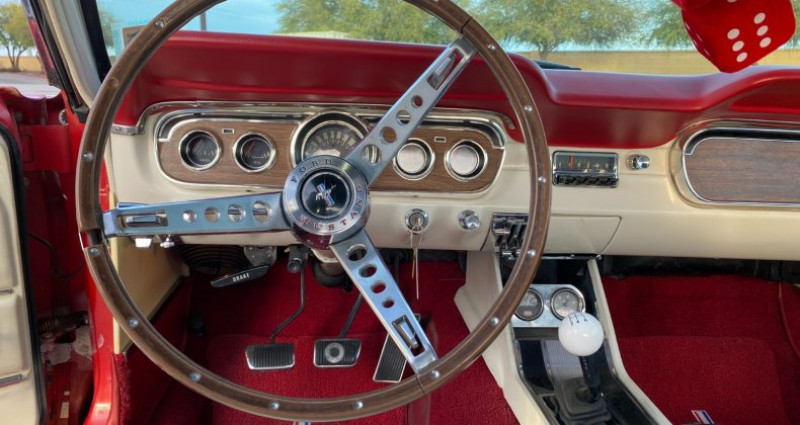 1965 Ford Mustang GT 2-door convertible, 289ci v8, upgraded 5-speed manual transmission, full center console, woodgrain interior trim, dual-exhaust system, Rangoon Red, white top, white interior, fog lamps, brightwork, rocker panel striping, trunk rack, original AM radio, new electic fuel pump, carburetor, distributor, clutch, muffler, no power steering, no power brakes, no power windows, paint is good but not perfect, assigned Colorado VIN number, original VIN visible in engine bay, uncertain odometer mileage. Provenance : Arizona. Disponibilité : environ 7 semaines, clés en main. 43 000 € tout compris (importation, taxes, procédure d'immatriculation). Annonce publiée le 29/11/2025