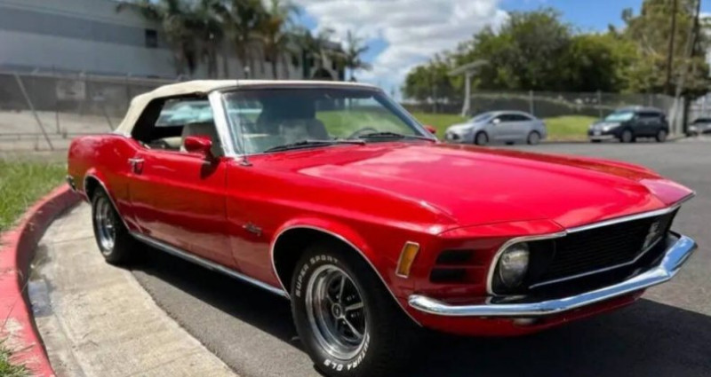 - Marque : Ford - Modèle : Mustang - Année : 1970 - Type de carrosserie : Cabriolet - Moteur : 351 Cleveland - Cylindrée : 351ci V8 5.8L - Boîte de vitesses : 4 vitesses automatique - Couleur extérieure : Rouge - Couleur intérieure : Blanc - Équipements : Air conditionné, freinage assisté, direction assistée, volant à réglage de hauteur, toit électrique, roues Magnum 500 avec pneus neufs, double échappement personnalisé, intérieur déluxe blanc, doubles rétroviseurs Sport Mach 1, réservoir à carburant de 22 gallons, pompe à carburant électrique - Kilométrage : 74 000 miles - État : Garé et bien entretenu, sans accident ni rouille, rapport Marti attaché. Provenance : Texas. Disponibilité : environ 7 semaines, clés en main. 40 000 € tout compris (importation, taxes, procédure d'immatriculation). Annonce publiée le 21/12/2025
