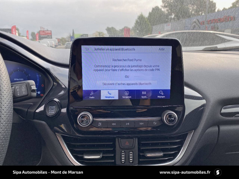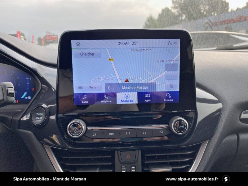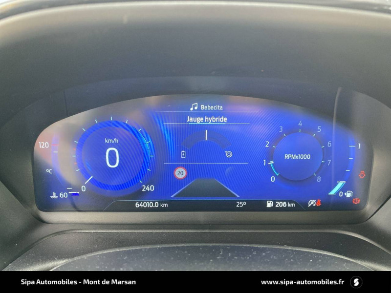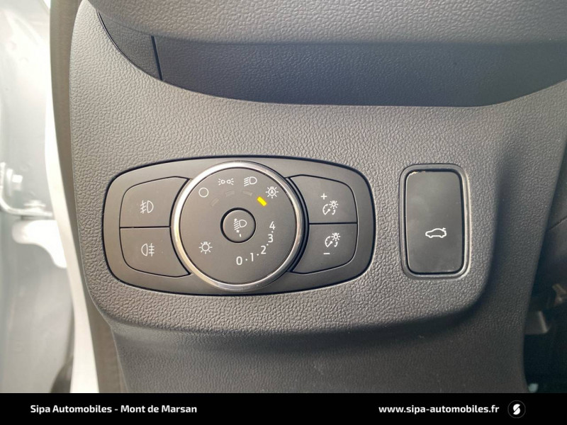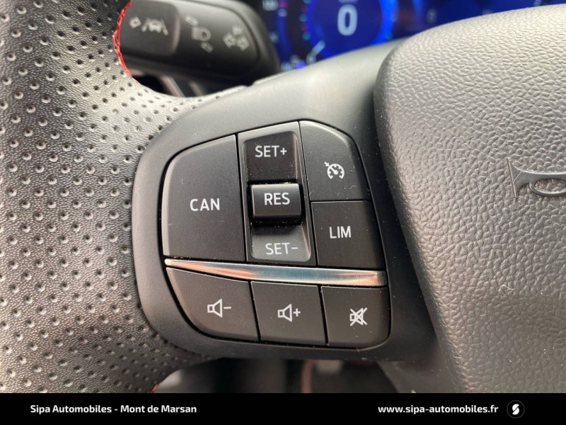 3ème appui-tête AR / 5 Modes de conduite sélectionnables (normal, eco, sport, faible adhérence, trail) / Aide au maintien dans la voie avec détection des bas-côtés / Badges extérieurs ST-Line / Becquet couleur carrosserie / Bouton de démarrage "Ford Power" / Combiné d'instrumentation numérique 12.3" avec Ecomode / Console centrale avec accoudoir et rangements / Désactivation de l'airbag passager / Disques de frein AV / Eclairage d'ambiance intérieur / Environnement noir / Feux de route intelligents - Commutation automatique des feux de route aux feux de croisement / FordPass Connect avec modem embarqué et fonction E-Call / Grille de calandre ST-Line / Jantes alliage 17" 5x2 branches finition Black Machined (pour pneus 215/55 R17) / Kit de carrosserie ST-Line / Kit de réparation pneumatique / Levier de frein à main Sensico / Levier de vitesse Sensico / Limiteur de vitesse intelligent (affichage instantané des limitations de vitesse sur le tableau de bord) / Phares antibrouillard AV avec fonction éclairage des angles / Rétroviseurs extérieurs couleur carrosserie électriques, dégivrants et rabattables électriquement avec éclairage d'approche / Sellerie tissu noir Court avec surpiqûres rouges / Siège conducteur a réglage manuelle en hauteur avec soutien lombaire / Sortie d'echappement chromée / Suspension Sport / Système audio Ford SYNC3 avec écran tactile 8", commandes vocales, 2 ports USB, alerte contresens, compatible AppLink, Apple CarPlay et Android auto, 6 HP / Système de navigation Europe et points d'intérêts Michelin / Système de prévention de collision avec freinage post-collision et détection piétons / Système MyKey (seconde clé programmable) / Tapis de sol AV avec surpiqûres / Trappe Easy Fuel / Volant à méplat 3 branches ST-Line avec surpiqûres rouges